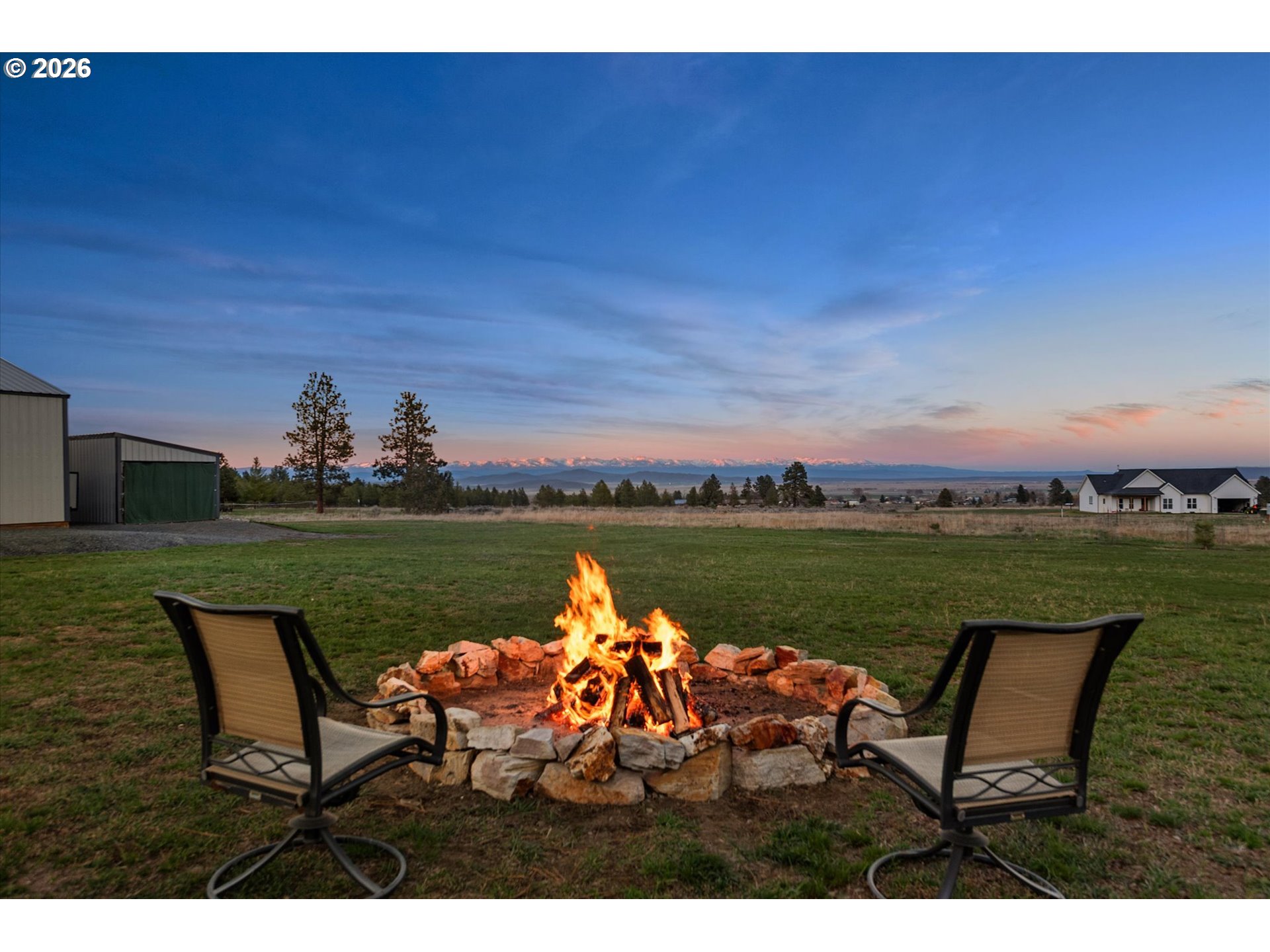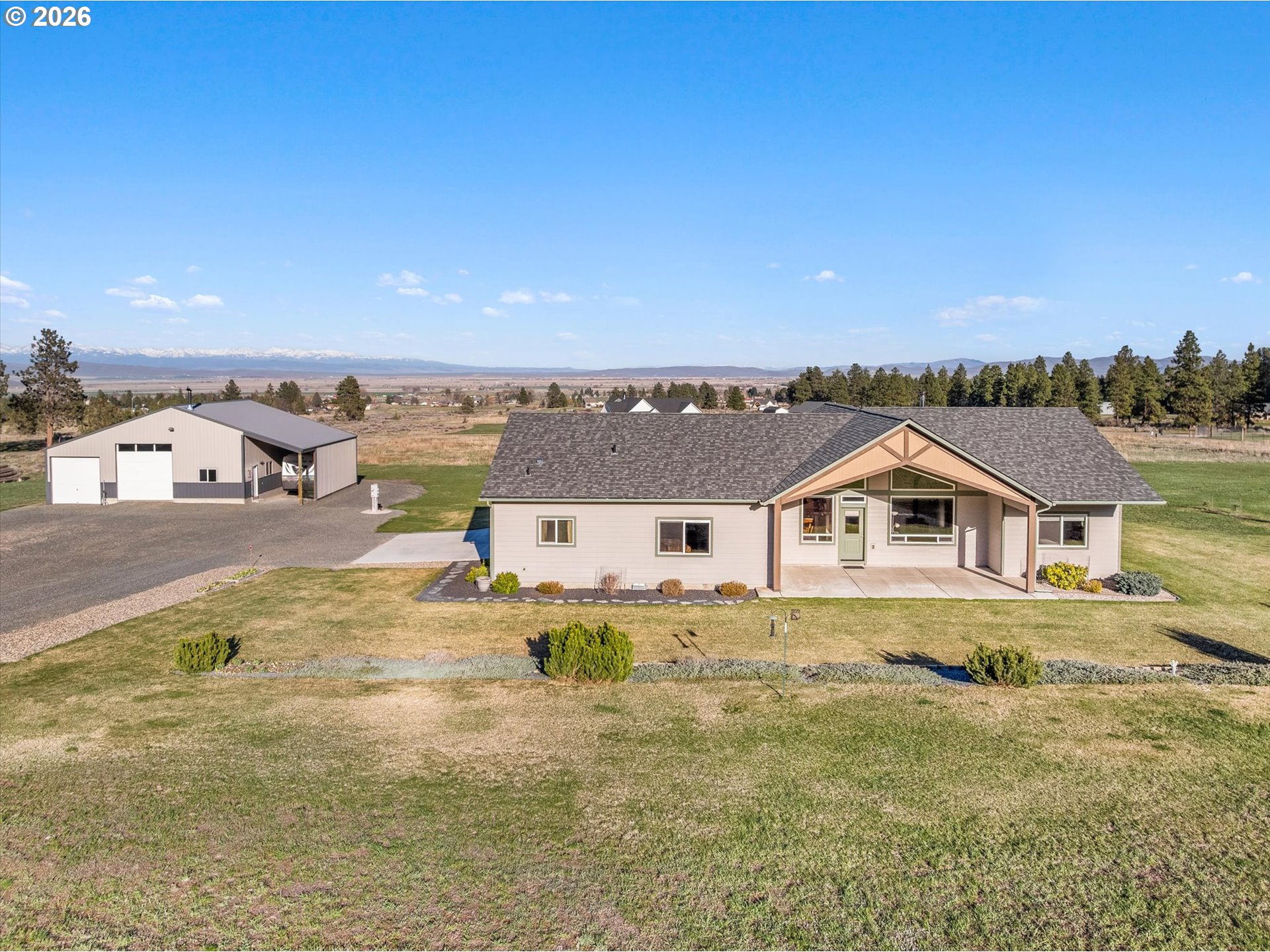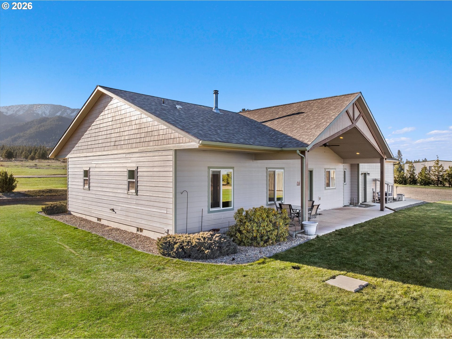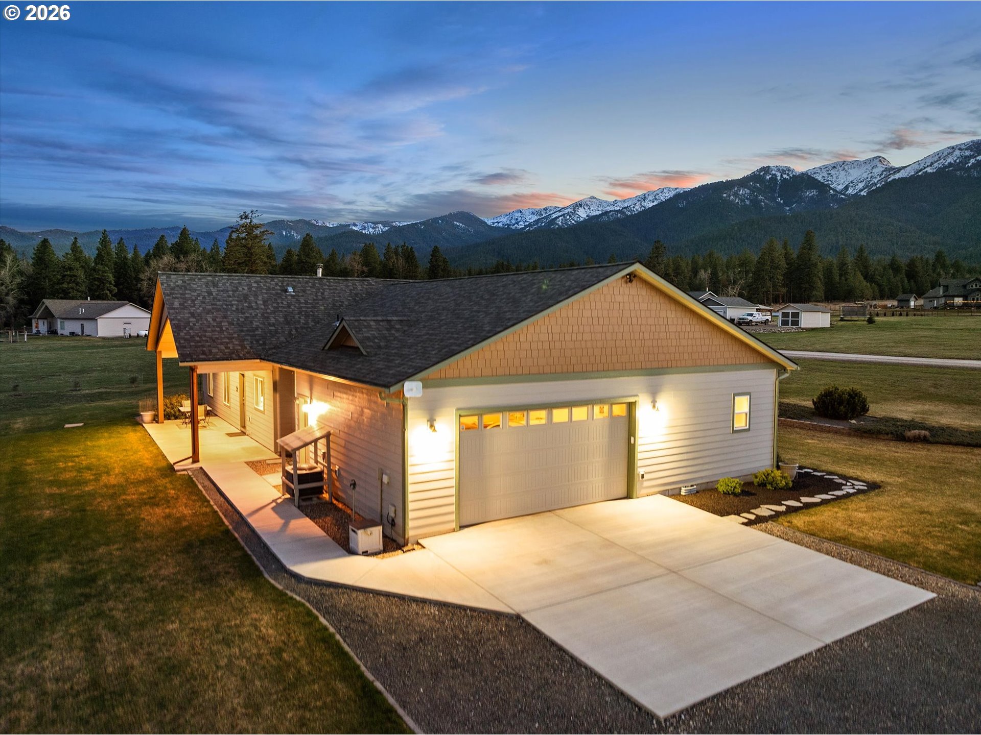Million-dollar mountain and valley views for under a million! Situated on 5 private acres, this custom 2016-built home offers sweeping 360-degree views from the base of the Elkhorn Mountains to the Baker Valley and the Eagle Caps of the Wallowa Mountains. Wildlife is plentiful with deer and quail on the property. The home features 1,852 sq ft of finished living space with 3 bedrooms and 2 bathrooms, plus an attached 552 sq ft finished garage for added functionality. The well-designed single-level layout includes a main-level primary suite, open vaulted living area, and wood-burning stove, with large windows capturing the surrounding mountain and valley views. A standout feature of the property is the 2,160 sq ft (54x40) custom built shop with 12x12 door with opener and 14ft side walls — exceptionally well built, insulated on cement foundation and ideal for equipment, storage, or workspace with LED lighting. 240 power for welder and separate 30 amp circuit for freezer. Included with the shop is a 12 x 40 drive through covered RV Storage and enclosed lockable “lean to” storage on the north side of the shop. The grounds are equally impressive, with an established in ground sprinkler system supporting mature trees, flowering bushes and landscaping, with room for expansion. The entire property has been landscaped with low maintenance in mind. Additional features include RV electrical and water hookup and parking, level usable acreage, and a private quiet setting. There is also excellent potential to expand the home on the south side if desired. A rare opportunity to own a view property with this level of improvement, usability, and setting—just 10 minutes from Baker City.