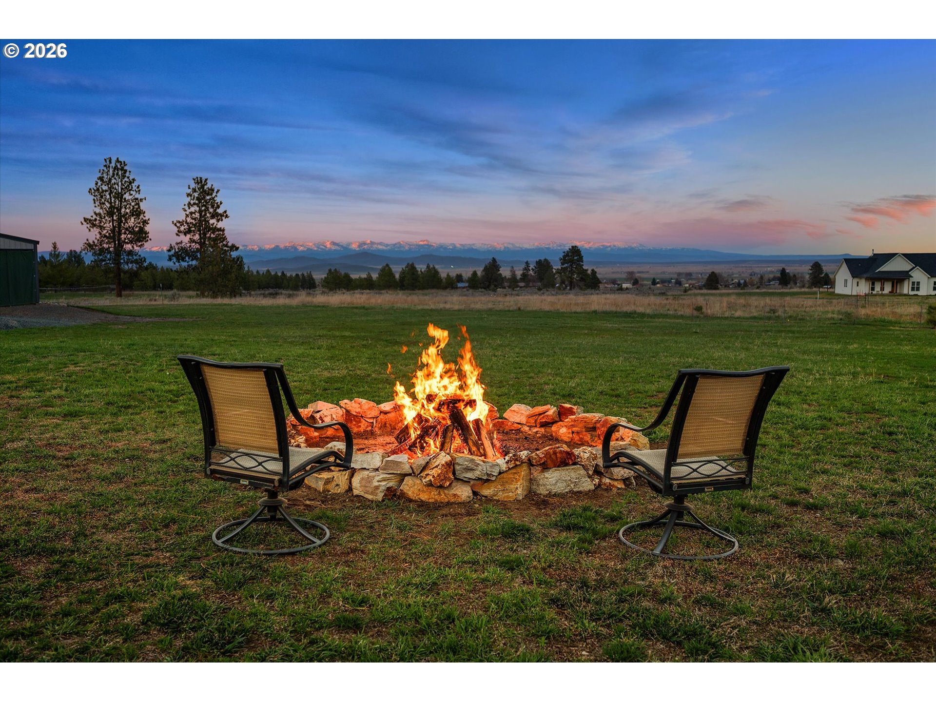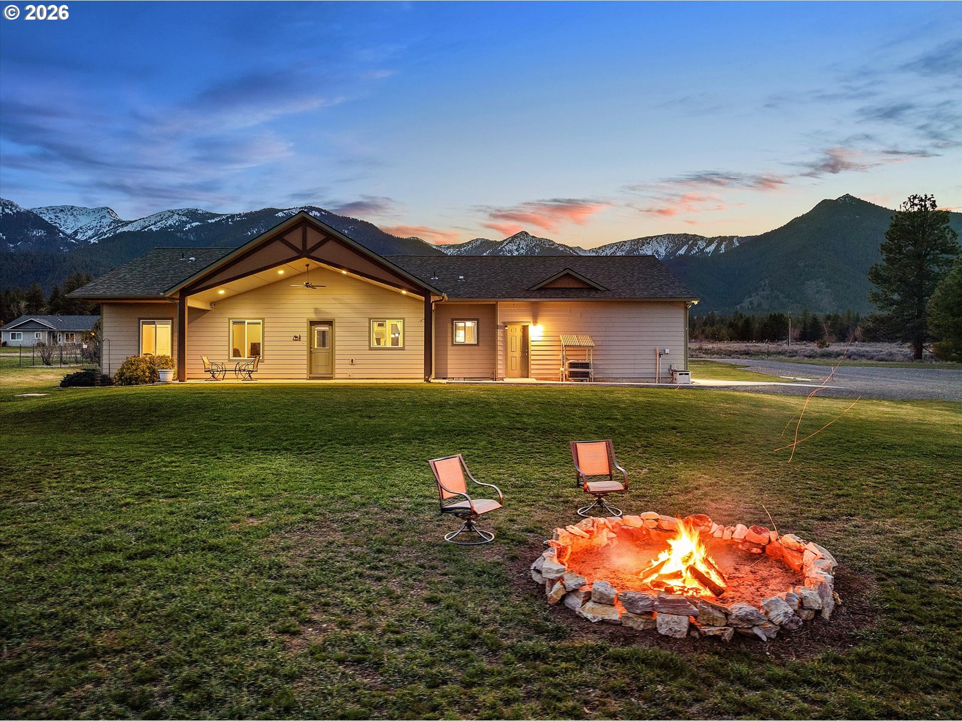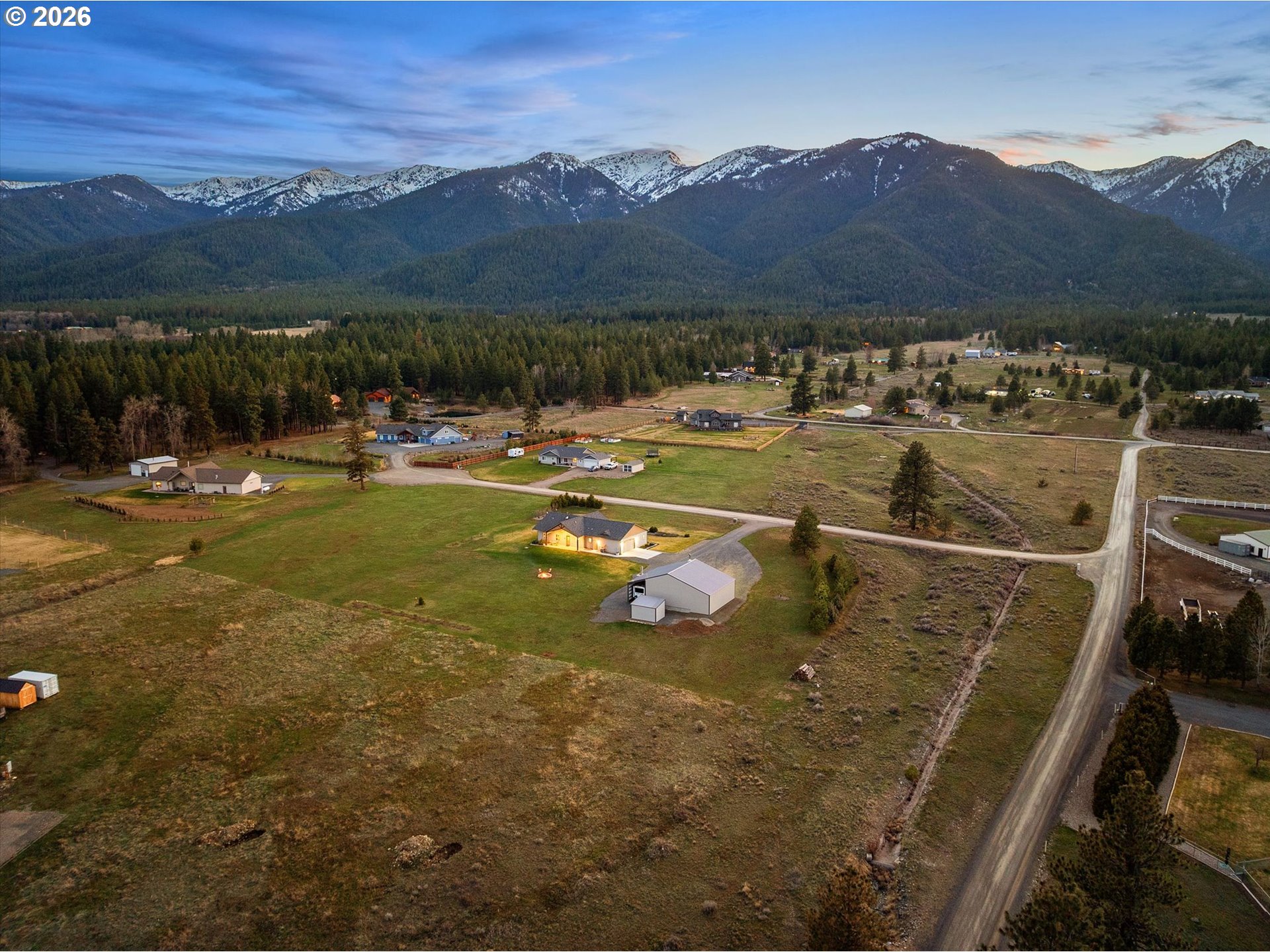 Million-dollar mountain and valley views for under a million! Situated on 5 private acres, this custom 2016-built home offers sweeping 360-degree views from the base of the Elkhorn Mountains to the Baker Valley and the Eagle Caps of the Wallowa Mountains. Wildlife is plentiful with deer and quail on the property. The home features 1,852 sq ft of finished living space with 3 bedrooms and 2 bathrooms, plus an attached 552 sq ft finished garage for added functionality. The well-designed single-level layout includes a main-level primary suite, open vaulted living area, and wood-burning stove, with large windows capturing the surrounding mountain and valley views. A standout feature of the property is the 2,160 sq ft (54x40) custom built shop with 12x12 door with opener and 14ft side walls — exceptionally well built, insulated on cement foundation and ideal for equipment, storage, or workspace with LED lighting. 240 power for welder and separate 30 amp circuit for freezer. Included with the shop is a 12 x 40 drive through covered RV Storage and enclosed lockable “lean to” storage on the north side of the shop. The grounds are equally impressive, with an established in ground sprinkler system supporting mature trees, flowering bushes and landscaping, with room for expansion. The entire property has been landscaped with low maintenance in mind. Additional features include RV electrical and water hookup and parking, level usable acreage, and a private quiet setting. There is also excellent potential to expand the home on the south side if desired. A rare opportunity to own a view property with this level of improvement, usability, and setting—just 10 minutes from Baker City.