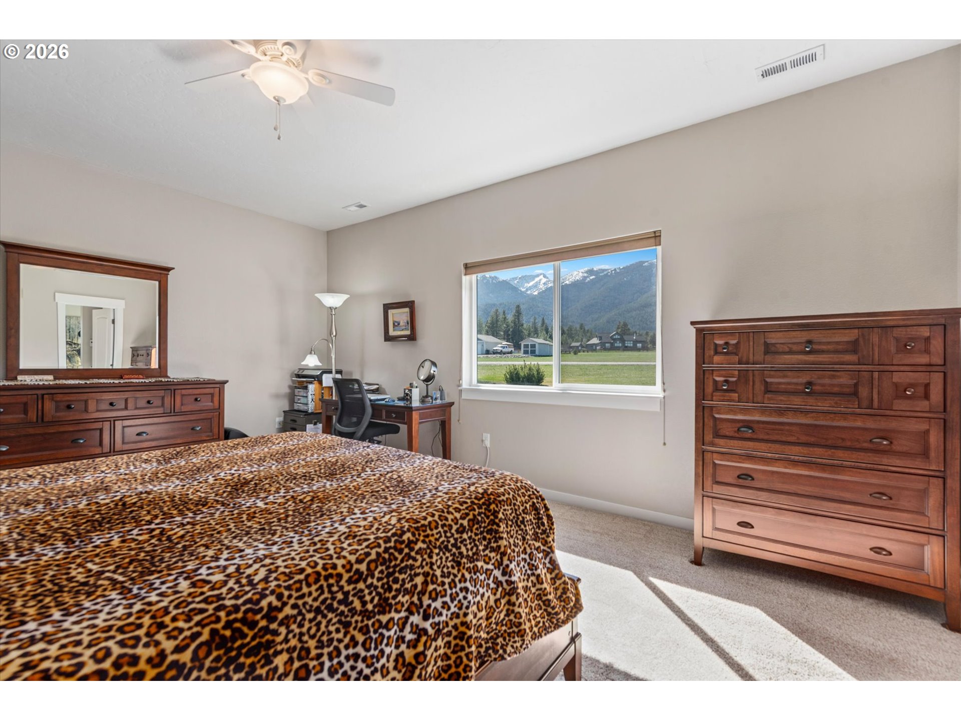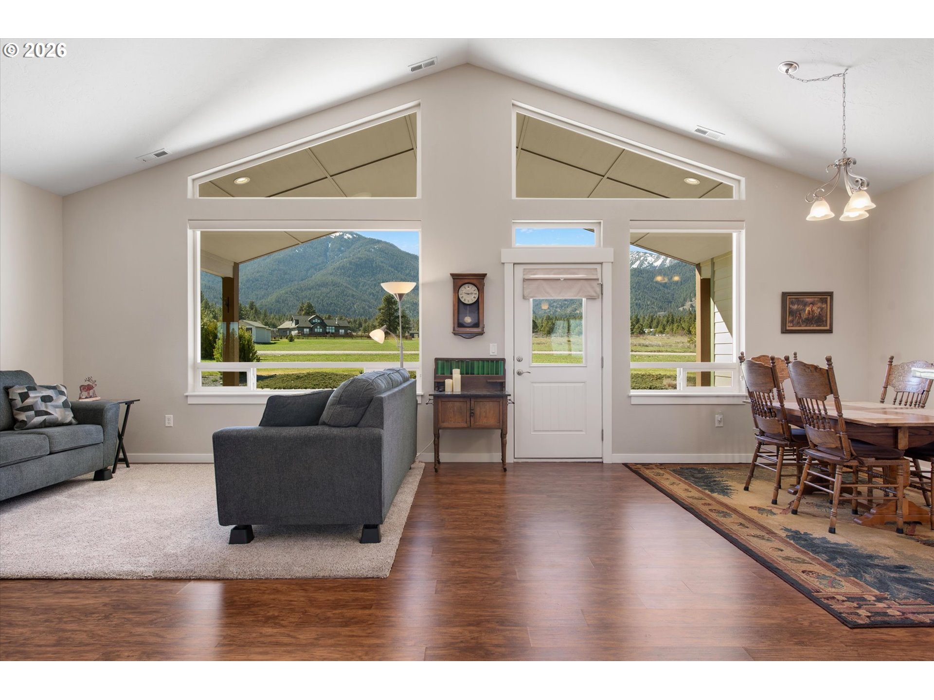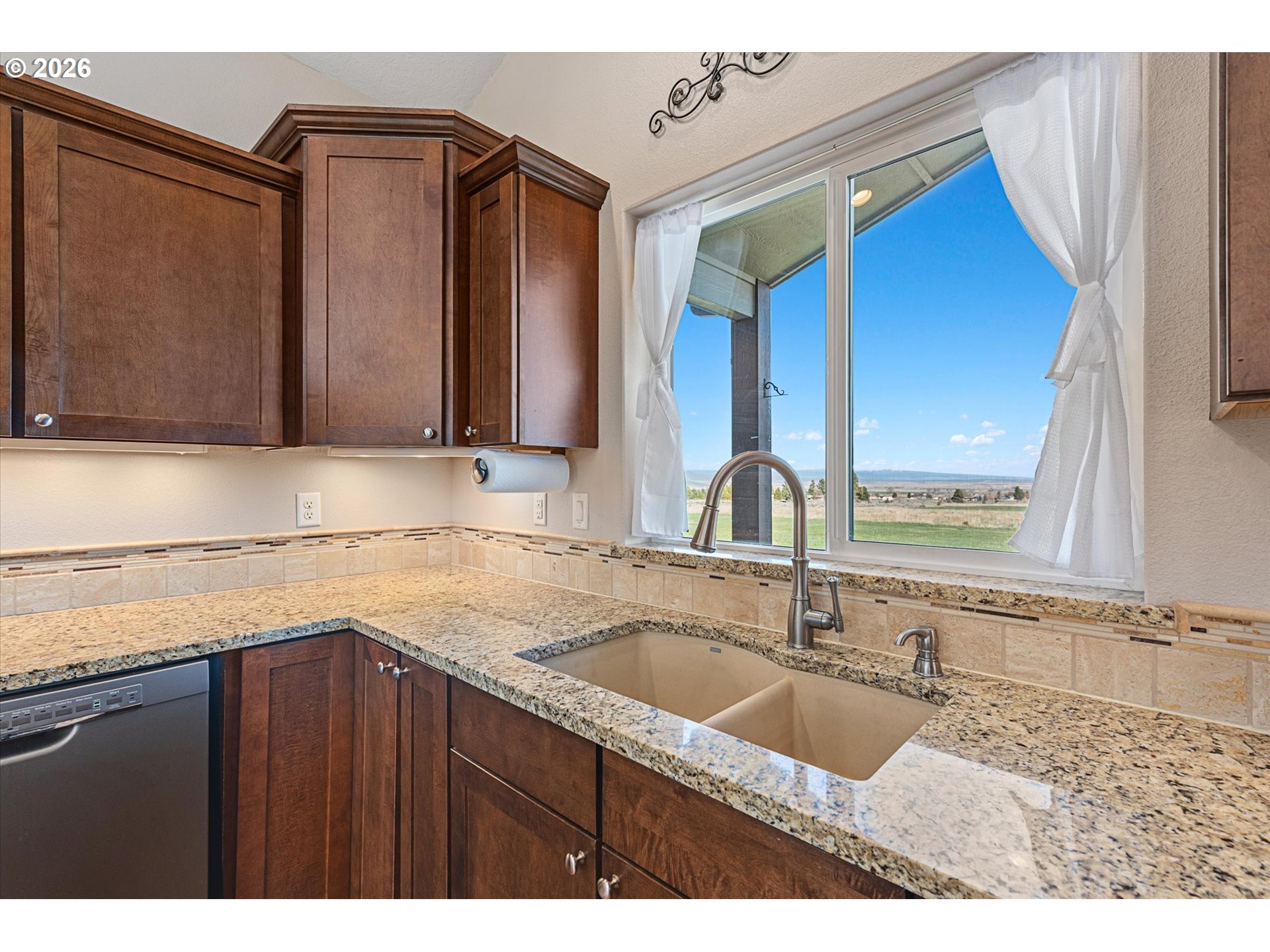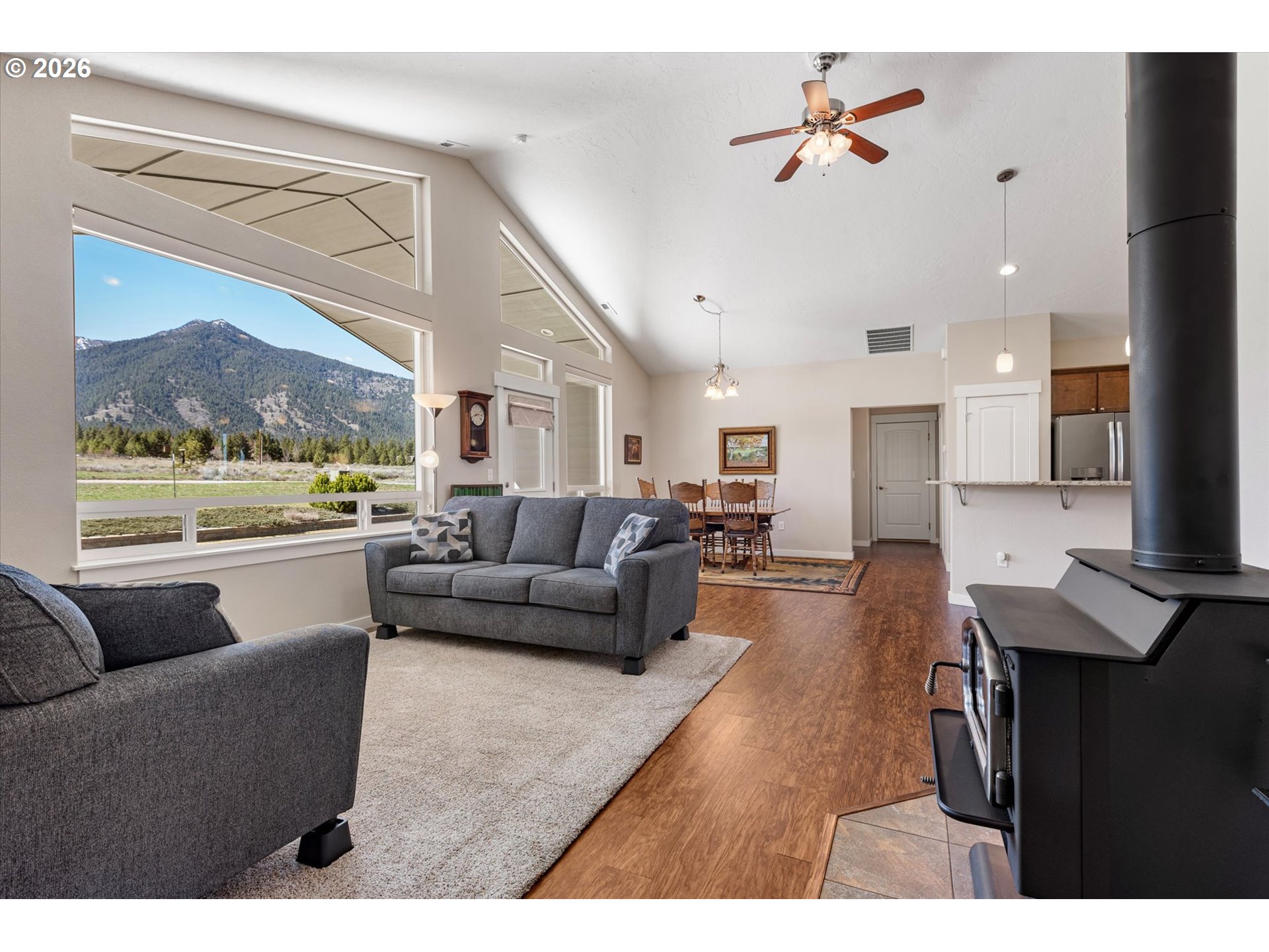 Million-dollar mountain and valley views for under a million! Situated on 5 private acres, this custom 2016-built home offers sweeping 360-degree views from the base of the Elkhorn Mountains to the Baker Valley and the Eagle Caps of the Wallowa Mountains. Wildlife is plentiful with deer and quail on the property. The home features 1,852 sq ft of finished living space with 3 bedrooms and 2 bathrooms, plus an attached 552 sq ft finished garage for added functionality. The well-designed single-level layout includes a main-level primary suite, open vaulted living area, and wood-burning stove, with large windows capturing the surrounding mountain and valley views. A standout feature of the property is the 2,160 sq ft (54x40) custom built shop with 12x12 door with opener and 14ft side walls — exceptionally well built, insulated on cement foundation and ideal for equipment, storage, or workspace with LED lighting. 240 power for welder and separate 30 amp circuit for freezer. Included with the shop is a 12 x 40 drive through covered RV Storage and enclosed lockable “lean to” storage on the north side of the shop. The grounds are equally impressive, with an established in ground sprinkler system supporting mature trees, flowering bushes and landscaping, with room for expansion. The entire property has been landscaped with low maintenance in mind. Additional features include RV electrical and water hookup and parking, level usable acreage, and a private quiet setting. There is also excellent potential to expand the home on the south side if desired. A rare opportunity to own a view property with this level of improvement, usability, and setting—just 10 minutes from Baker City.
