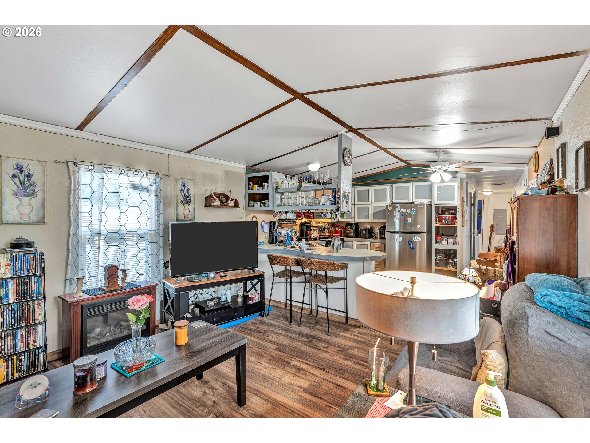 Welcome home to this spacious single-level manufactured home in park offering 3 bedrooms and 1 bath on one of the largest lots in the park. The open-concept living, dining, and kitchen area features high vaulted ceilings that create an airy, expansive feel perfect for everyday living and entertaining.Two bedrooms include comfortable wall-to-wall carpet, while the third features durable laminate flooring for easy maintenance. The kitchen is equipped with a ceiling fan and flows seamlessly into the main living spaces. A dedicated laundry room adds convenience and functionality.Outside, enjoy the huge fully fenced yard—ideal for pets, gardening, or outdoor gatherings—plus a handy tool shed and RV hookup for added flexibility. Residents also benefit from community amenities including a pool, party room, dog park, and play structure. This home offers comfort, space, and great value in a welcoming park setting.