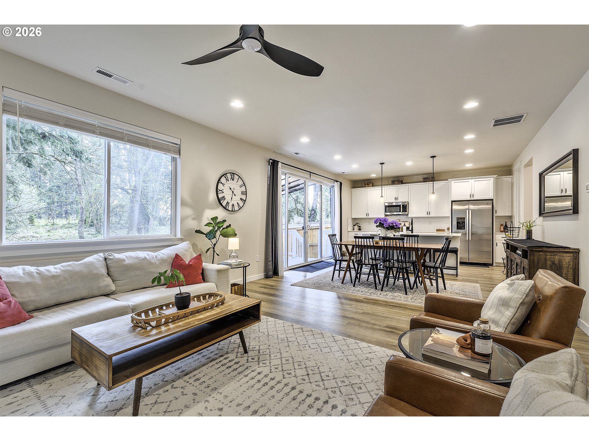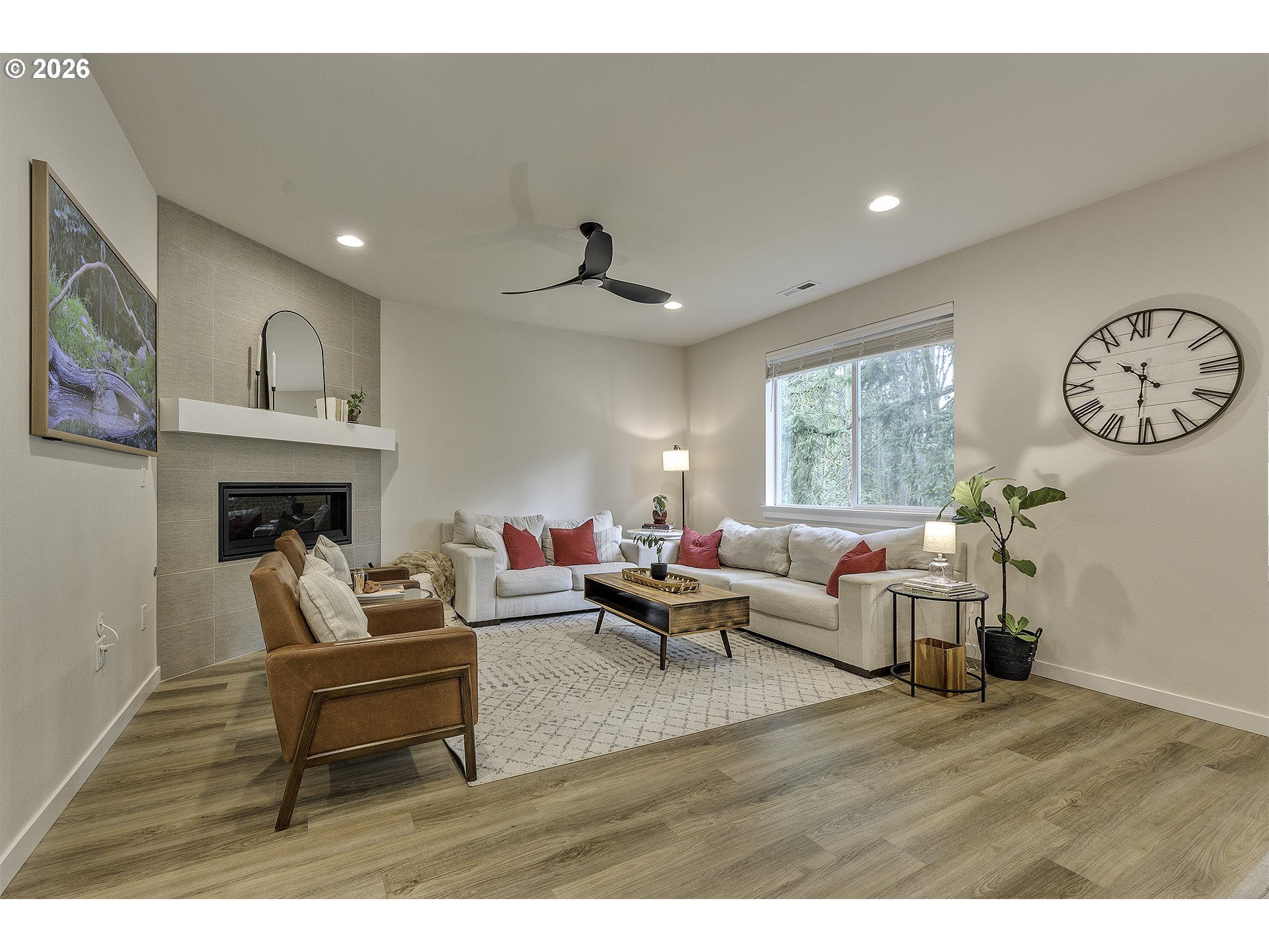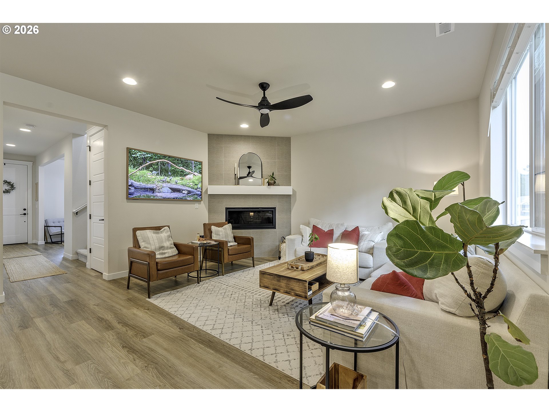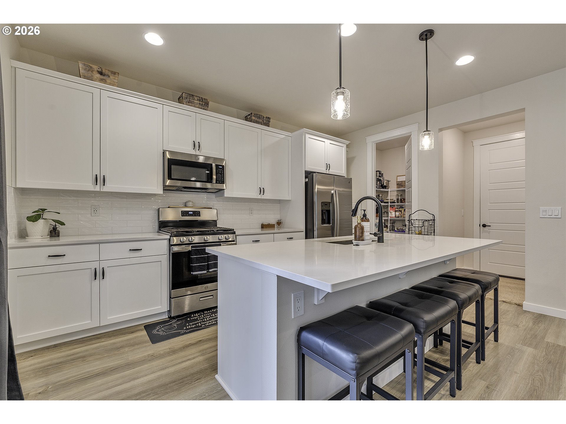 Open House - Saturday April 4th 12-2PM & Sunday April 5th 10AM-12PM ~ Beautifully upgraded floor plan featuring the sought after Pebble Beach design collection, modern finishes, functional living spaces, and a private setting. The open concept main level offers durable luxury vinyl plank flooring through the entry, study, kitchen, dining, and great room. The kitchen is the heart of the home with classic white shaker cabinetry, quartz countertops, matte black hardware, stainless steel appliances, gas range, pendant lighting, and a large island perfect for gathering and everyday living. The spacious great room features a designer tile fireplace, abundant natural light, and large center sliding glass doors that create a seamless connection to the outdoor living space. A dedicated main level study offers great flexibility for working from home, hobbies, or guest use. Upstairs you will find a generous primary suite, additional bedrooms, and a versatile loft that works well as a second living space, playroom, or media area. The primary bath features dual vanities with quartz counters, matte black fixtures, and a beautifully tiled shower surround. Step outside to enjoy the large covered deck overlooking a fully fenced backyard that backs to a beautiful green space, offering privacy and a peaceful setting for relaxing or entertaining. Additional upgrades include recessed lighting, ceiling fan prewiring in multiple rooms, Cat6 wiring, upgraded stair rail, modern matte black interior hardware, upgraded interior doors, garage door opener, front yard irrigation, patio gas stub, and passive radon system.