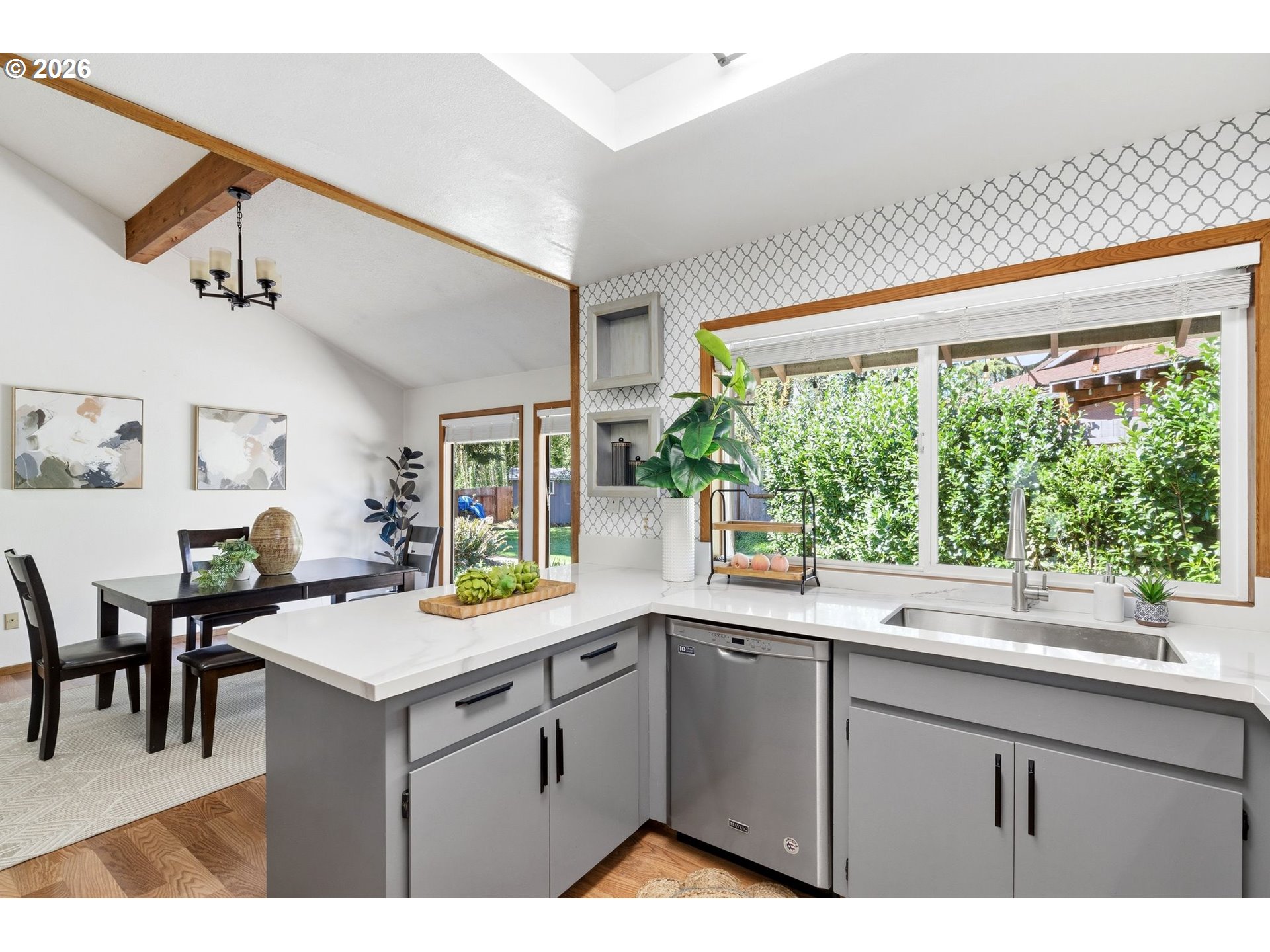 Updated one level home in West Linn featuring vaulted ceilings and abundant natural light that create an open & inviting living space. Thoughtful updates throughout offer a clean, move-in ready feel, including NEW carpeting (2026), neutral interior paint, updated interior hardware, refreshed kitchen and bathrooms. The kitchen includes painted cabinetry and updated countertops, while bathrooms have been refreshed with updated surfaces, sinks, and fixtures. Key system updates provide peace of mind, including a NEW roof, furnace & air conditioning unit in 2020, NEW water heater (2024), regularly serviced HVAC, exterior paint (2020), and newer windows reflecting the care this home has received over time. Set on a flat, usable 0.23 acre lot, the property features a fenced yard with NEW wood fencing (2024), an extended patio, and sliding door access for an easy indoor outdoor connection. Thoughtfully maintained landscaping enhances usability and curb appeal.Additional features include an additional patio of the primary bedroom, an extended driveway offering flexible parking for RV or recreational vehicles, a storage shed, or an additional outbuilding for storage or hobbies.Located on a quiet no through street in an established neighborhood, with close proximity to Historic Downtown West Linn, the Willamette River, parks, trails, and everyday amenities. Easy access to Portland and surrounding areas. Make your appointment today to view.