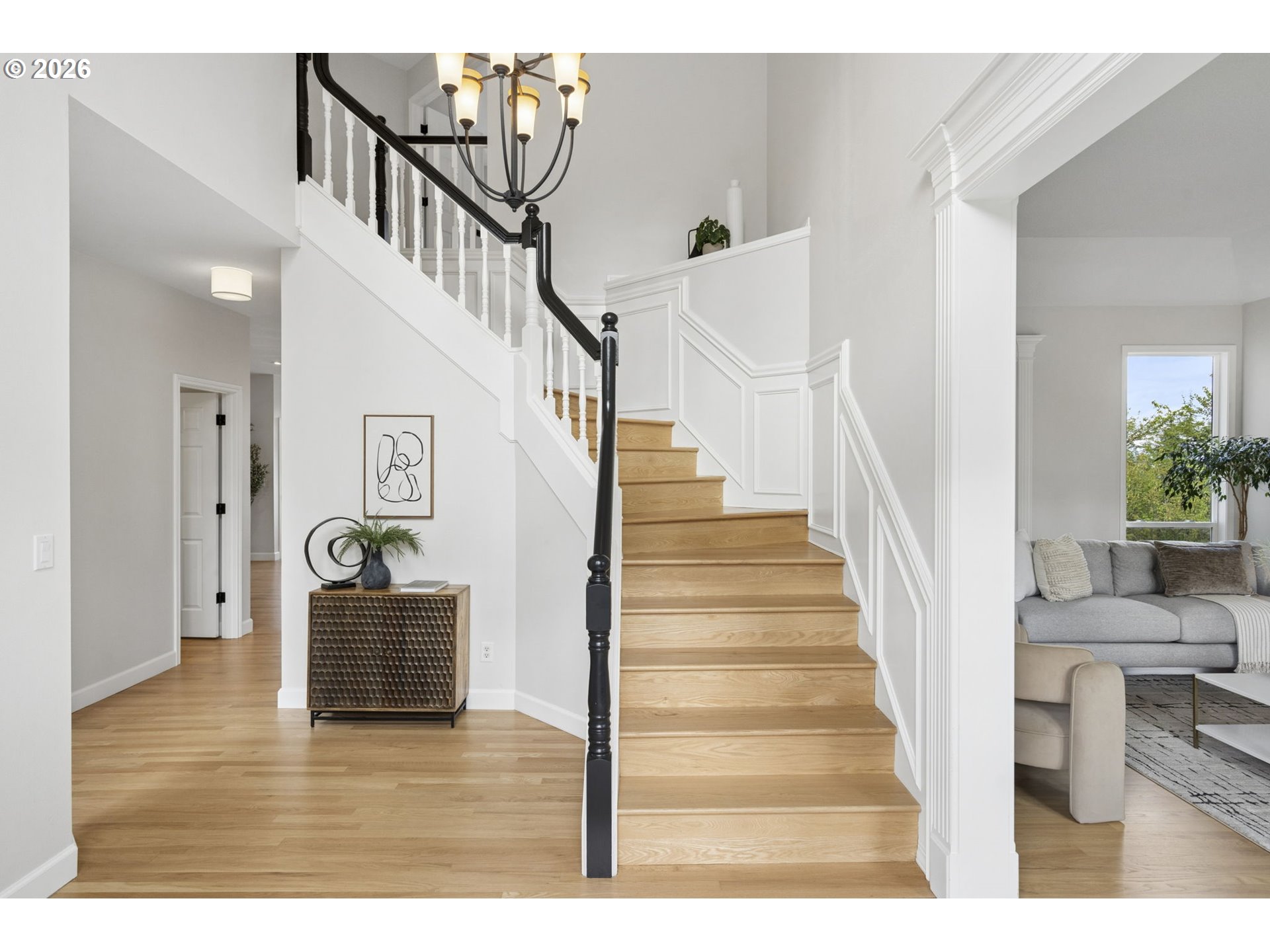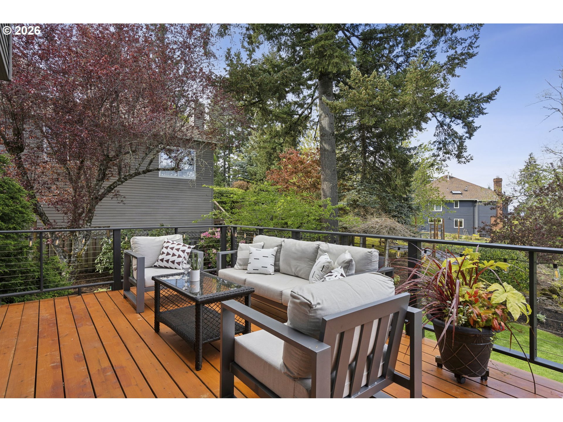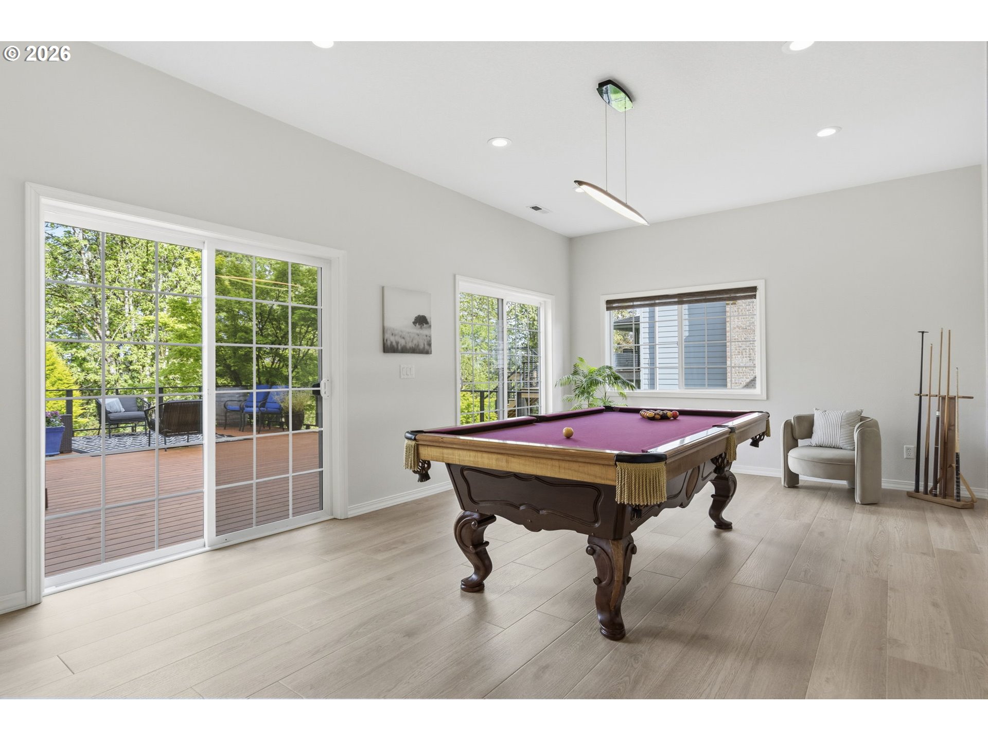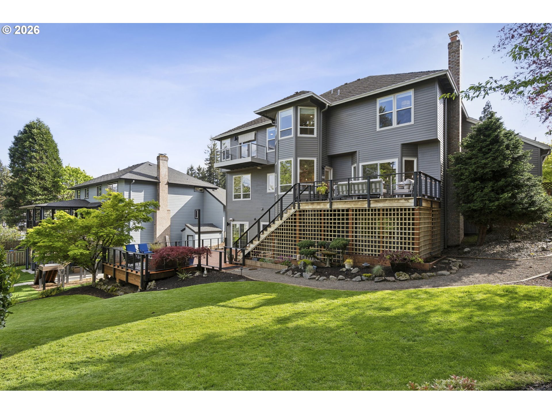 This beautifully updated home sits atop Skyline Ridge with unobstructed mountain views. Hardwood floors span the main level, leading into a brand-new kitchen with white oak cabinetry, quartz counters, and Thermador stainless steel appliances. A built-in speaker system provides seamless Bluetooth audio for cooking and entertaining. The kitchen opens to a great room with a gas fireplace and sliding doors to an upper deck overlooking the spacious 0.26-acre yard. Upstairs features three guest bedrooms (one staged as a bonus room), a full bath, and a luxurious primary suite with vaulted ceilings, new carpet, panoramic views of Mount Hood and Mount Adams, and a private balcony. French doors open to a fully remodeled en suite with a walk-in shower, double sinks, soaking tub, and elegant tile. The daylight basement includes a wine cellar, theater room, recreation area with pool table and wet bar, plus a fifth bedroom and full bath—ideal for multi-generational living. Sliding doors lead to a large lower deck with gas hookup for grilling. The backyard features a zonal sprinkler system & strategic uplighting of the home & landscaping. Just down the street you will find Skyline Ridge Park with tennis courts, basketball, playground & more. Skyline Ridge also has a community pool which residents in this neighborhood can join if they would like for an annual fee. Please ask your realtor for a list of updates & amenities for an in depth look at all the high end systems that were put into this home. This home is impeccably maintained and thoughtfully updated. A lot of fun memories were had at this home over the last 28, and now it's ready for you.