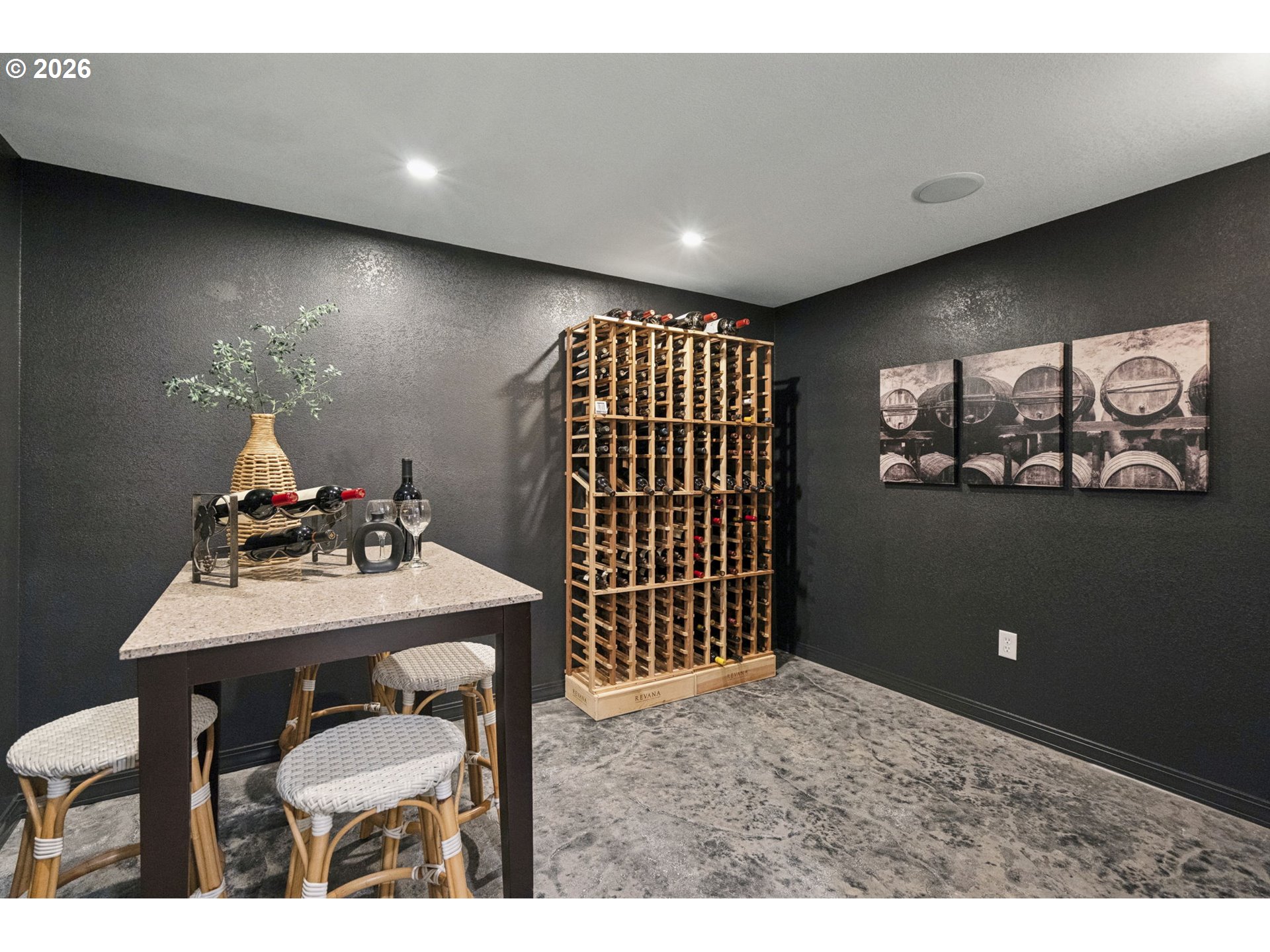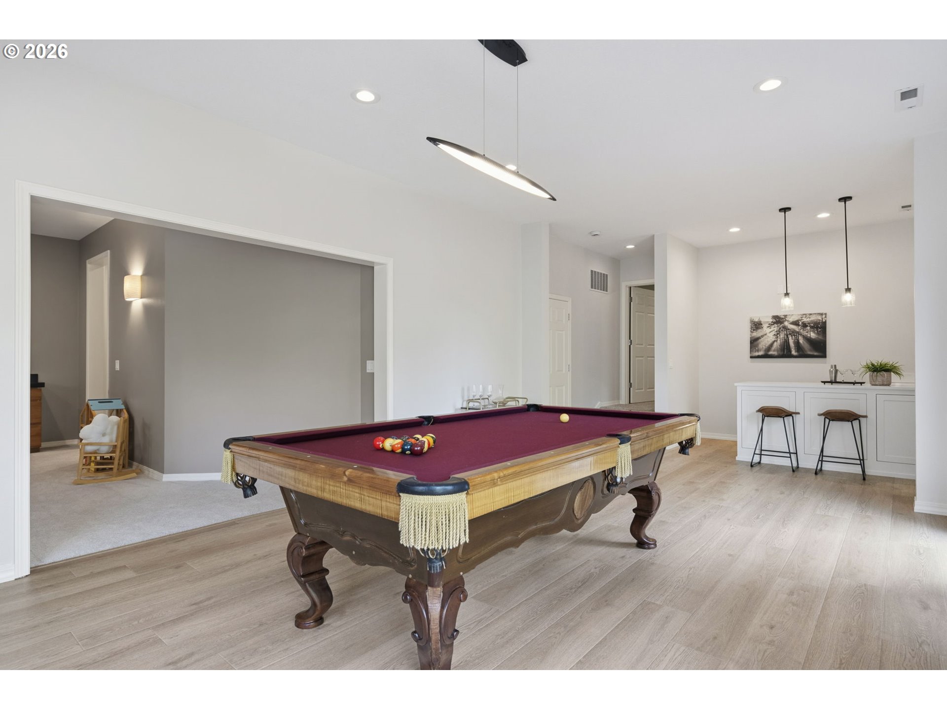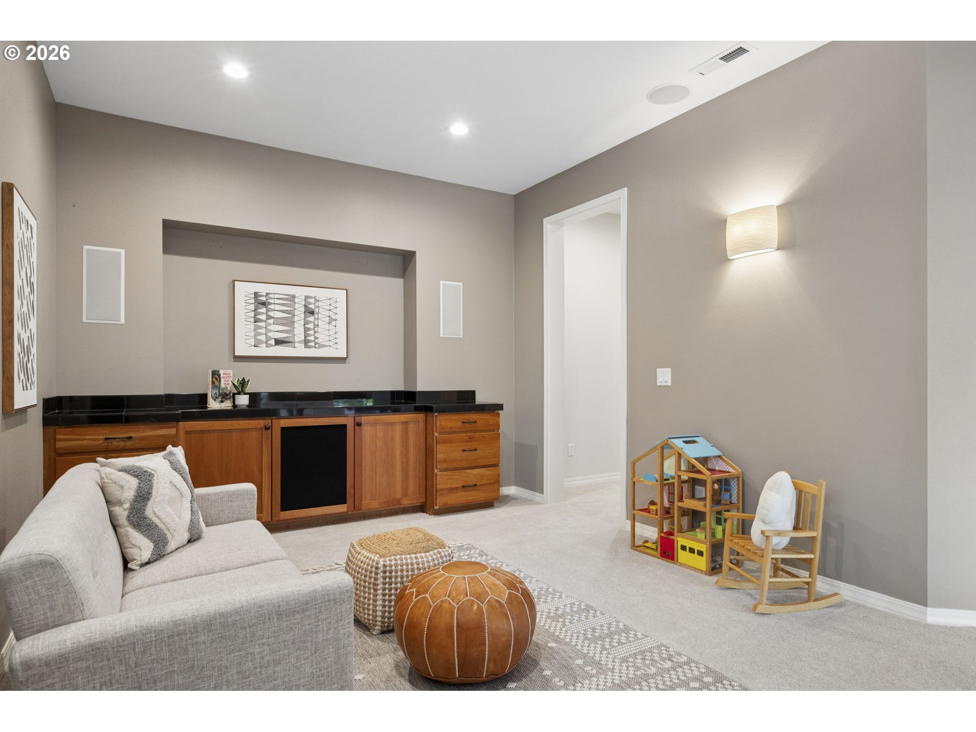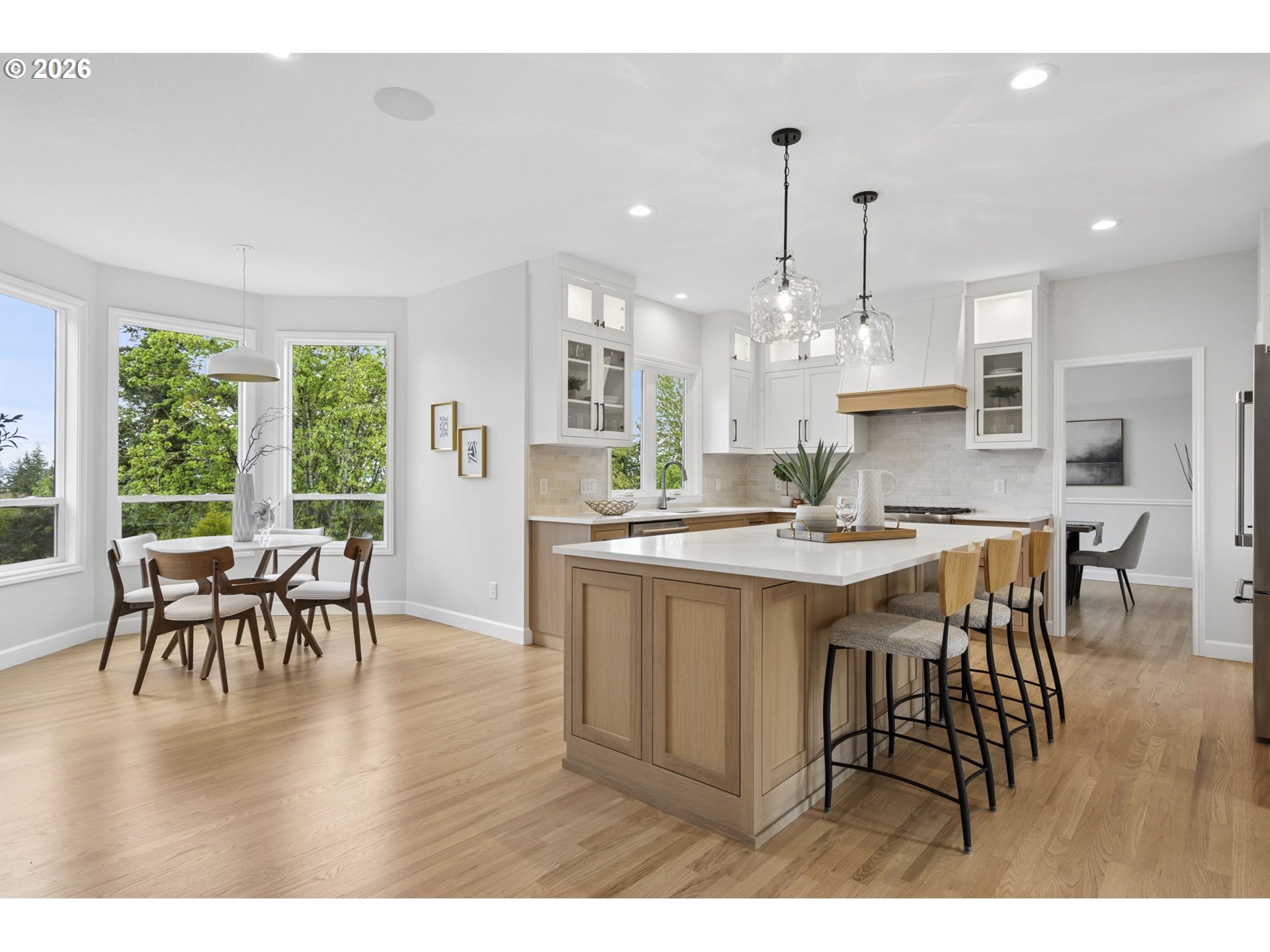 This beautifully updated home sits atop Skyline Ridge with unobstructed mountain views. Hardwood floors span the main level, leading into a brand-new kitchen with white oak cabinetry, quartz counters, and Thermador stainless steel appliances. A built-in speaker system provides seamless Bluetooth audio for cooking and entertaining. The kitchen opens to a great room with a gas fireplace and sliding doors to an upper deck overlooking the spacious 0.26-acre yard. Upstairs features three guest bedrooms (one staged as a bonus room), a full bath, and a luxurious primary suite with vaulted ceilings, new carpet, panoramic views of Mount Hood and Mount Adams, and a private balcony. French doors open to a fully remodeled en suite with a walk-in shower, double sinks, soaking tub, and elegant tile. The daylight basement includes a wine cellar, theater room, recreation area with pool table and wet bar, plus a fifth bedroom and full bath—ideal for multi-generational living. Sliding doors lead to a large lower deck with gas hookup for grilling. The backyard features a zonal sprinkler system & strategic uplighting of the home & landscaping. Just down the street you will find Skyline Ridge Park with tennis courts, basketball, playground & more. Skyline Ridge also has a community pool which residents in this neighborhood can join if they would like for an annual fee. Please ask your realtor for a list of updates & amenities for an in depth look at all the high end systems that were put into this home. This home is impeccably maintained and thoughtfully updated. A lot of fun memories were had at this home over the last 28, and now it's ready for you.