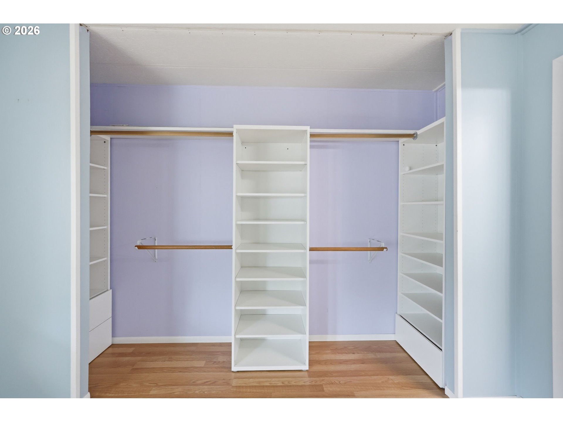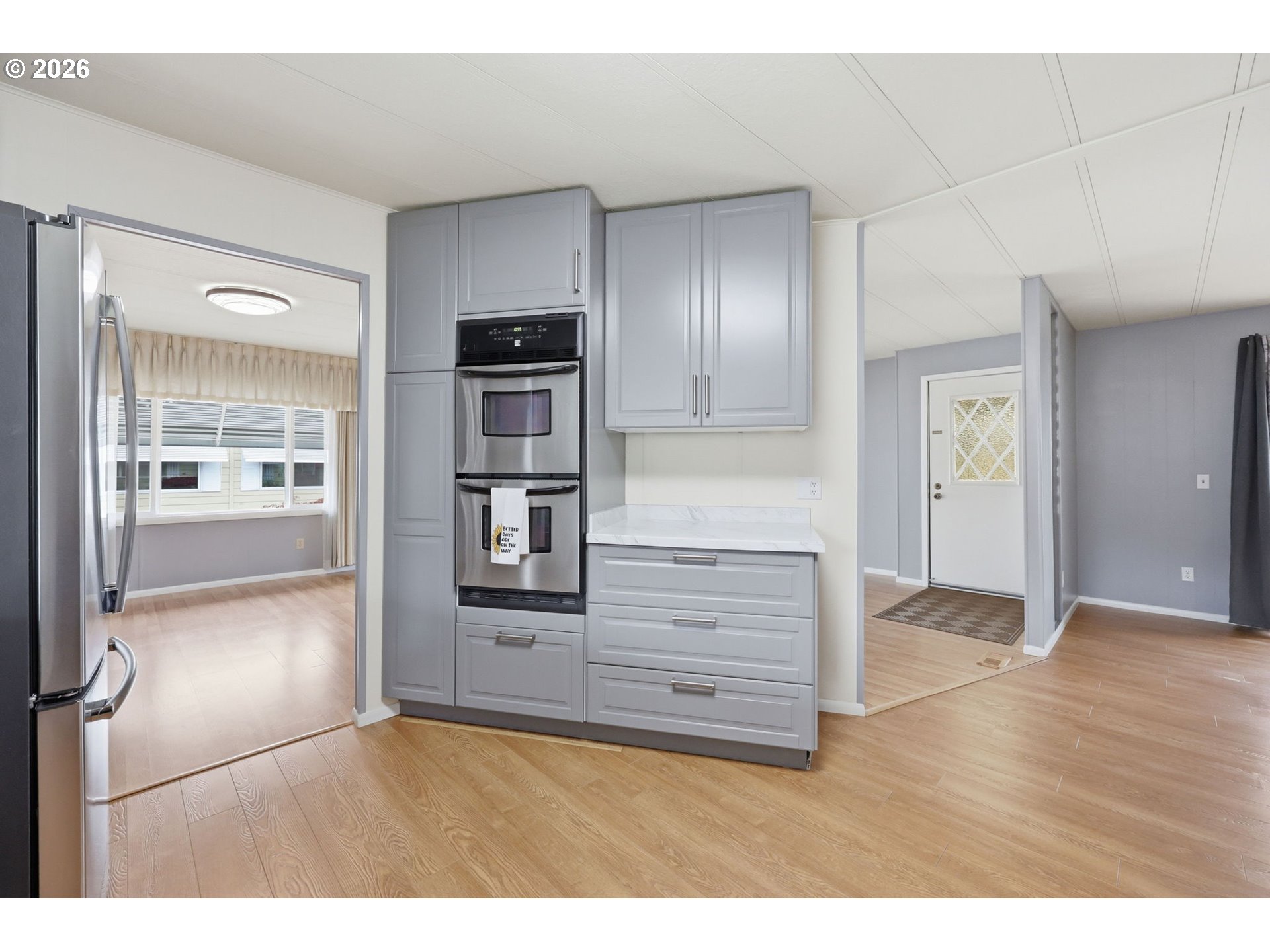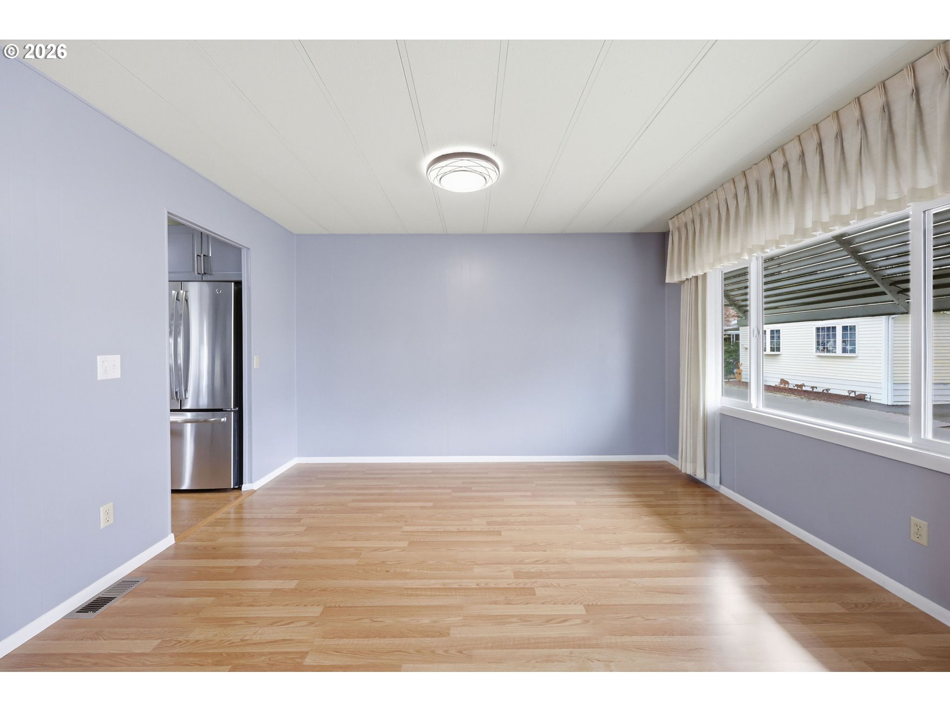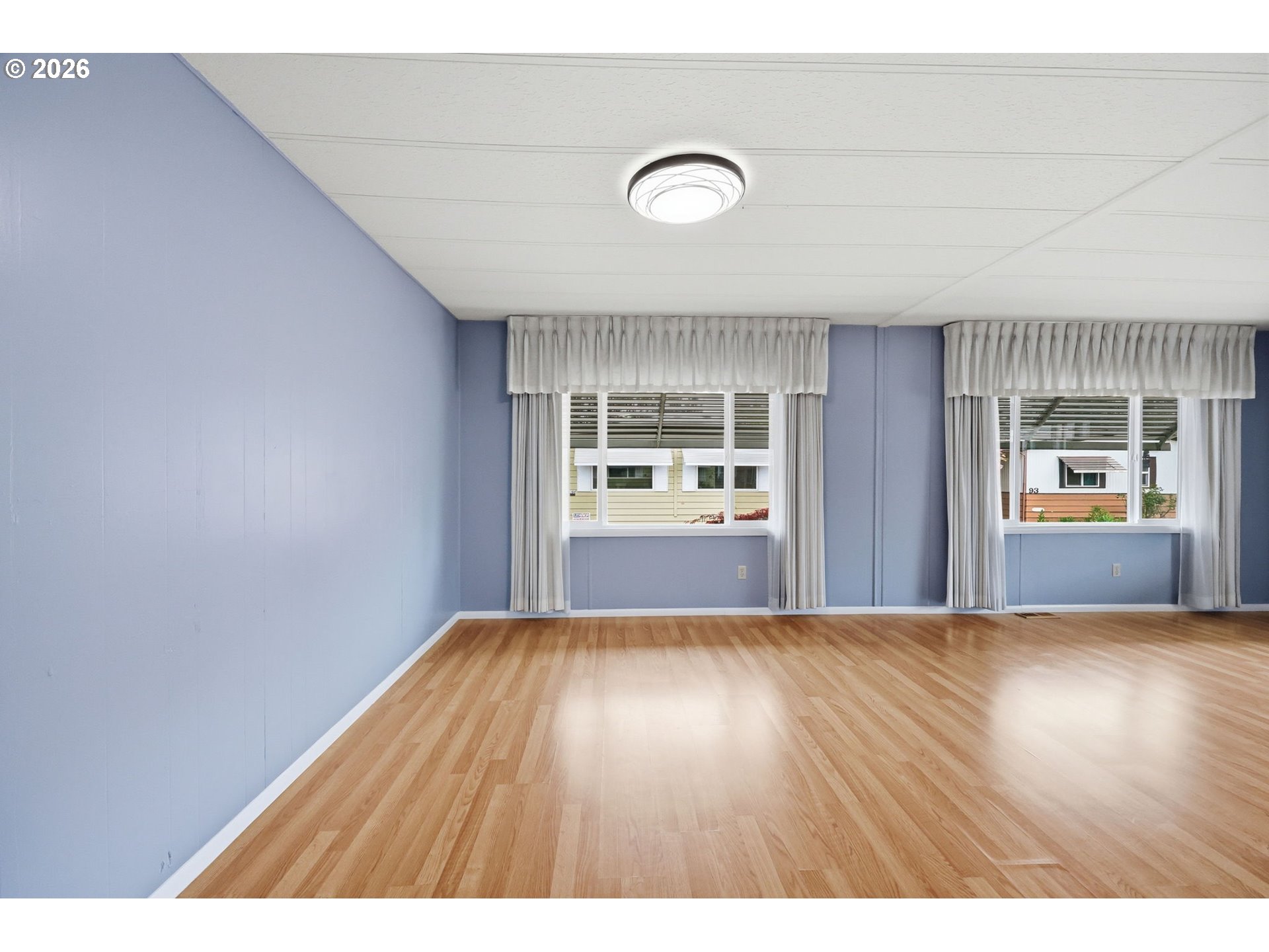 Clean, Bright and Very Spacious home in a quiet 55+ Happy Valley community offering comfortable, one-level living with a functional layout updated with composite flooring that includes two bedrooms, two full baths, and a flexible office space. The kitchen was updated with IKEA cabinetry and counters, along with a double oven, electric cooktop, and refrigerator with bottom freezer, ice maker, and filtered water. Additional features include a sink water filter with instant hot water and a garbage disposal. The primary bath features a Jacuzzi low profile walk-in shower installed in April 2023. Major system updates include vinyl windows, a 30-year composition roof, a handicap-accessible ramp was added in 2024. Outdoor spaces include a covered deck, patio, a 7x7 Rubbermaid resin storage building, and additional locked storage in the carport area. Located in the heart of Happy Valley with convenient access to shopping, dining, and services, this home offers a practical, low-maintenance lifestyle in a well-established community.