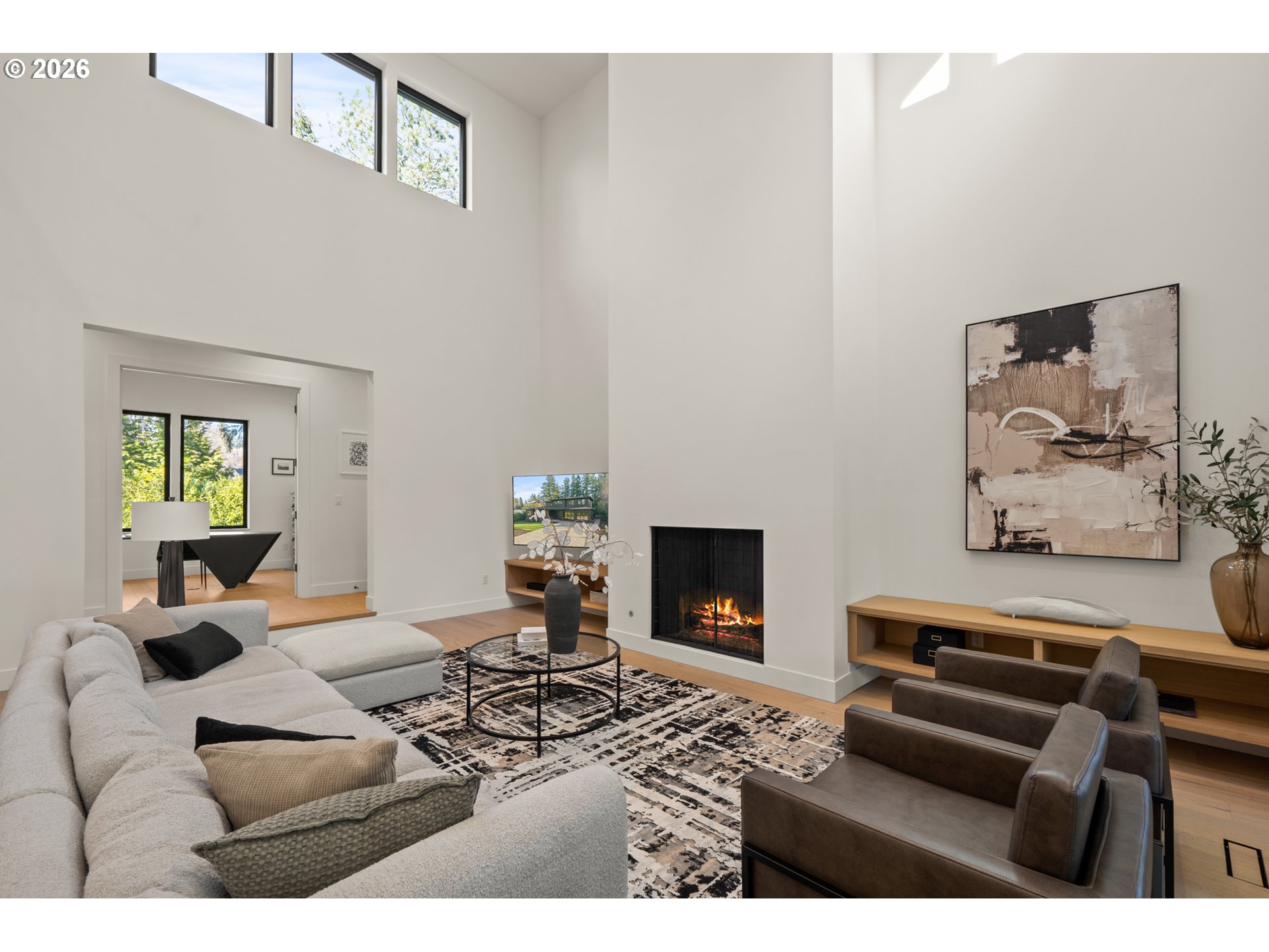 Tucked into the coveted Forest Highlands neighborhood, this custom build by Elite Homes is a striking blend of minimalistic design and organic elegance. Set on an ultra-rare 0.6-acre lot, the home offers unmatched privacy and a sprawling backyard with endless potential. Step inside to soaring two-story ceilings and a sunken living room grounded by a stunning wood-burning masonry fireplace. The open-concept floor plan features custom white oak cabinetry, refined finishes, and a seamless indoor-outdoor flow to a covered year-round living space. Highly desirable main-level living includes both the primary suite and a guest room. Functional luxury abounds with dual home offices, a lofted common area, and an expansive bonus room. A rare opportunity to own a statement home on one of the neighborhood's most exceptional, nature-surrounded lots.