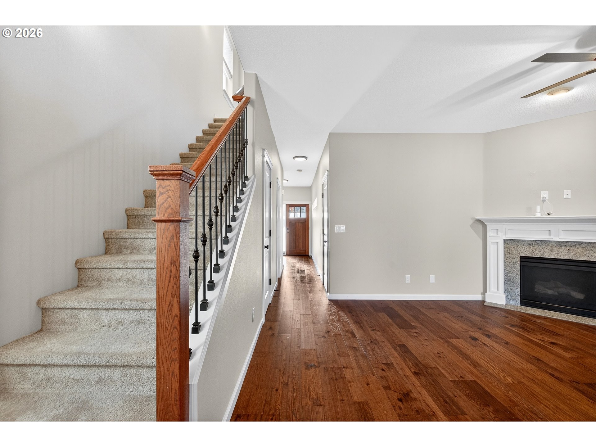 Beautifully designed two-level home offering 3 bedrooms and 2.5 baths, ideally located in the desirable Oregon City area. The main level features hardwood floors throughout and a bright, open-concept layout that seamlessly connects the living, dining, and kitchen spaces. The living room is warm and inviting with a cozy fireplace and ceiling fan, while the spacious kitchen impresses with granite countertops, a large island, ample cabinetry, and a pantry—perfect for both everyday living and entertaining. A dedicated laundry room with extra storage adds convenience, and the dining area opens to a covered back deck, ideal for year-round outdoor enjoyment.Upstairs, wall-to-wall carpet provides comfort throughout the bedrooms. The primary suite is a relaxing retreat with high ceilings, a ceiling fan, a walk-in closet, and an ensuite bathroom featuring double sinks. Located at 14085 Passage Pkwy, this home is nestled in a quiet, well-maintained neighborhood close to parks, trails, shopping, and dining, with easy access to I-205 for commuting. Enjoy nearby outdoor recreation, scenic river access, and the charm of historic downtown Oregon City—all while living in a welcoming community that blends comfort, convenience, and lifestyle.