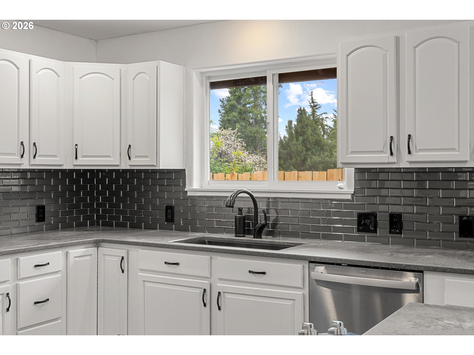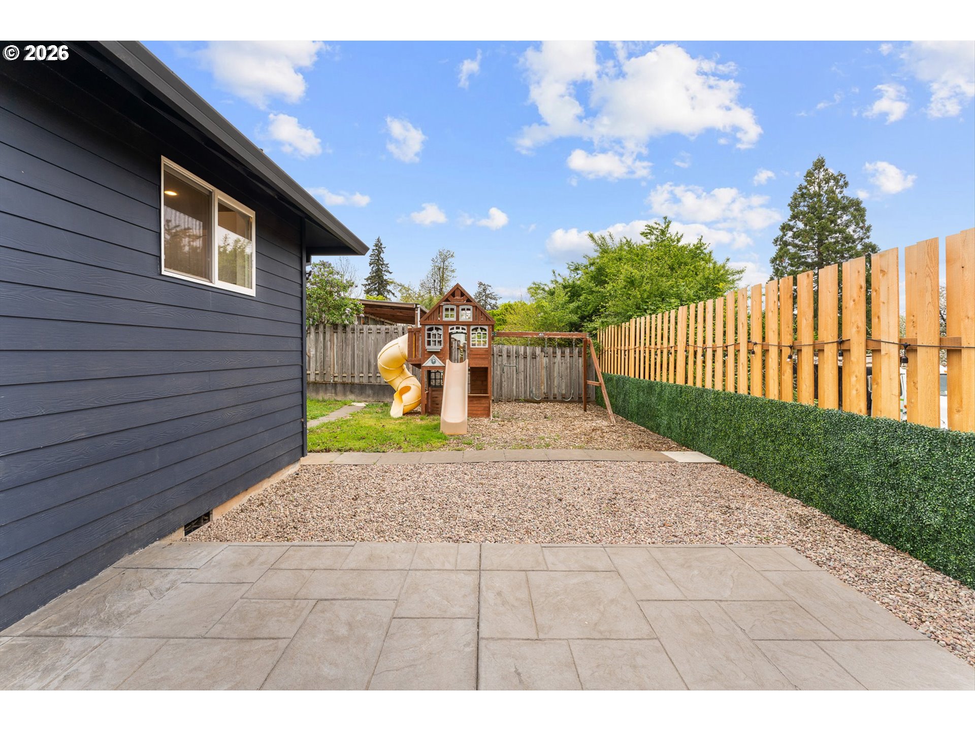 Tucked down a private drive, this beautifully updated Milwaukie home has everything you’ve been waiting for. This one-story home checks all the boxes with 3 bedrooms, 2 bathrooms, an open concept living area, a 2-car garage, and a large yard for entertaining. The living area boasts vaulted ceilings and a gas fireplace- perfect for those cozy nights in. Entertaining is a breeze with the open-concept kitchen and dining area that leads out to the large patio and yard. The backyard includes a beautiful stamped concrete patio, Trex-covered patio stairs, grass, and a play structure. The one-level layout makes daily living easy. Seamlessly move from the garage into your mud/laundry room, into your hallway, to the bedrooms. The primary bedroom faces the quiet backyard with an ensuite bathroom and access to the back patio. Updates include a new roof and water heater in 2024, a kitchen remodel and LVT flooring in 2020, Fresh exterior paint and patio in 2022, and back fence in 2026. The hot tub does not convey with the home, but the seller will leave the patio cover.