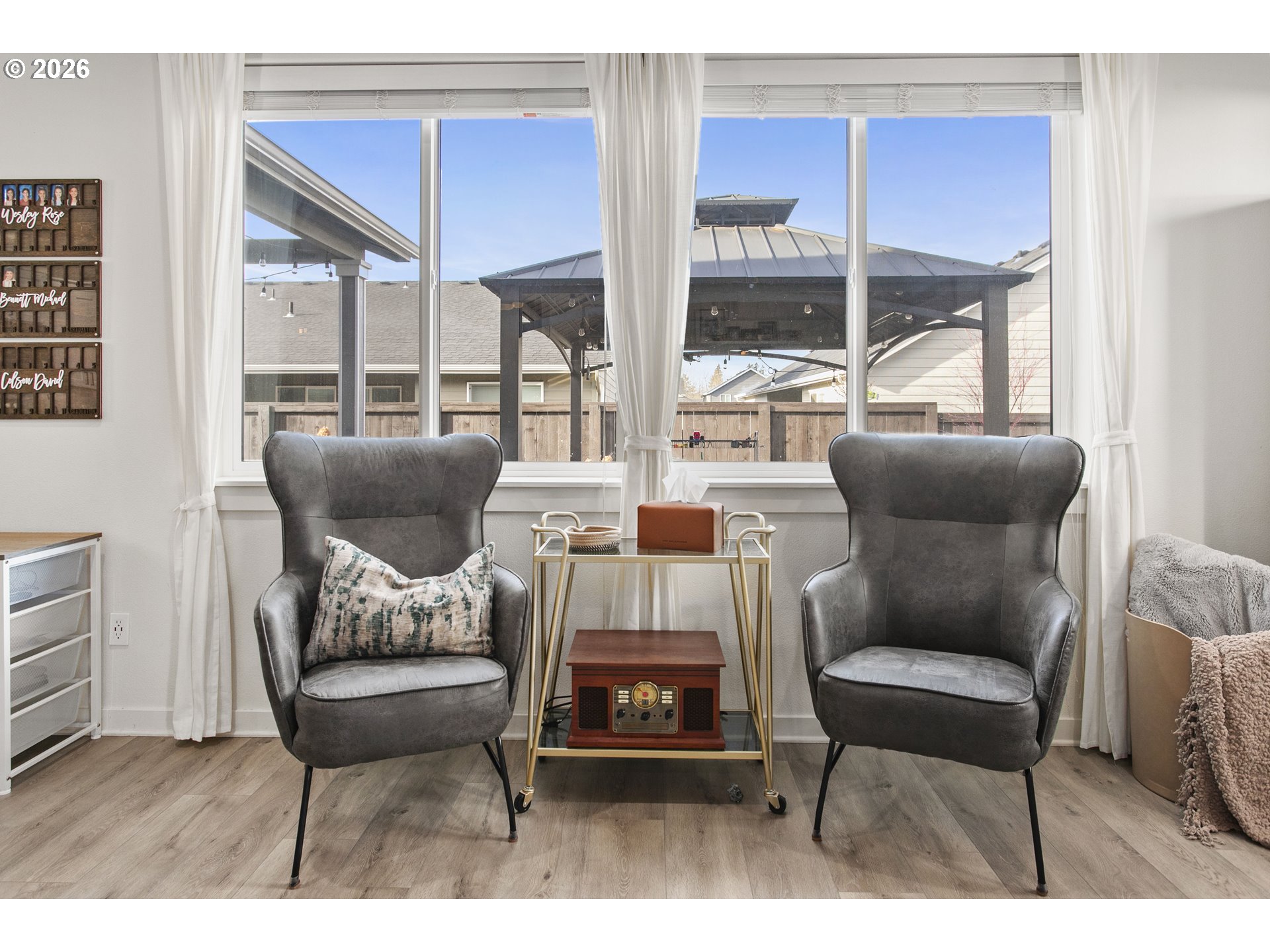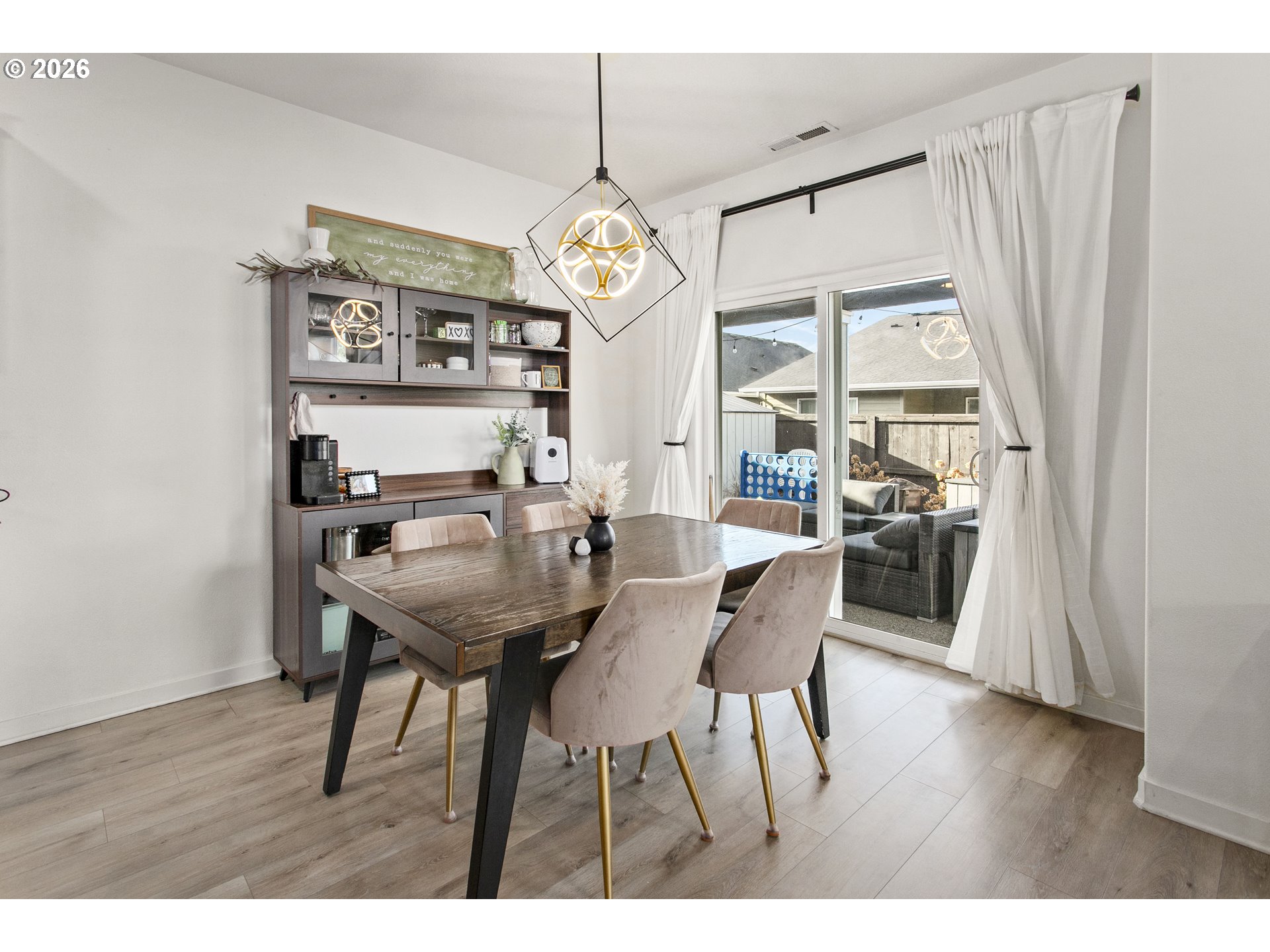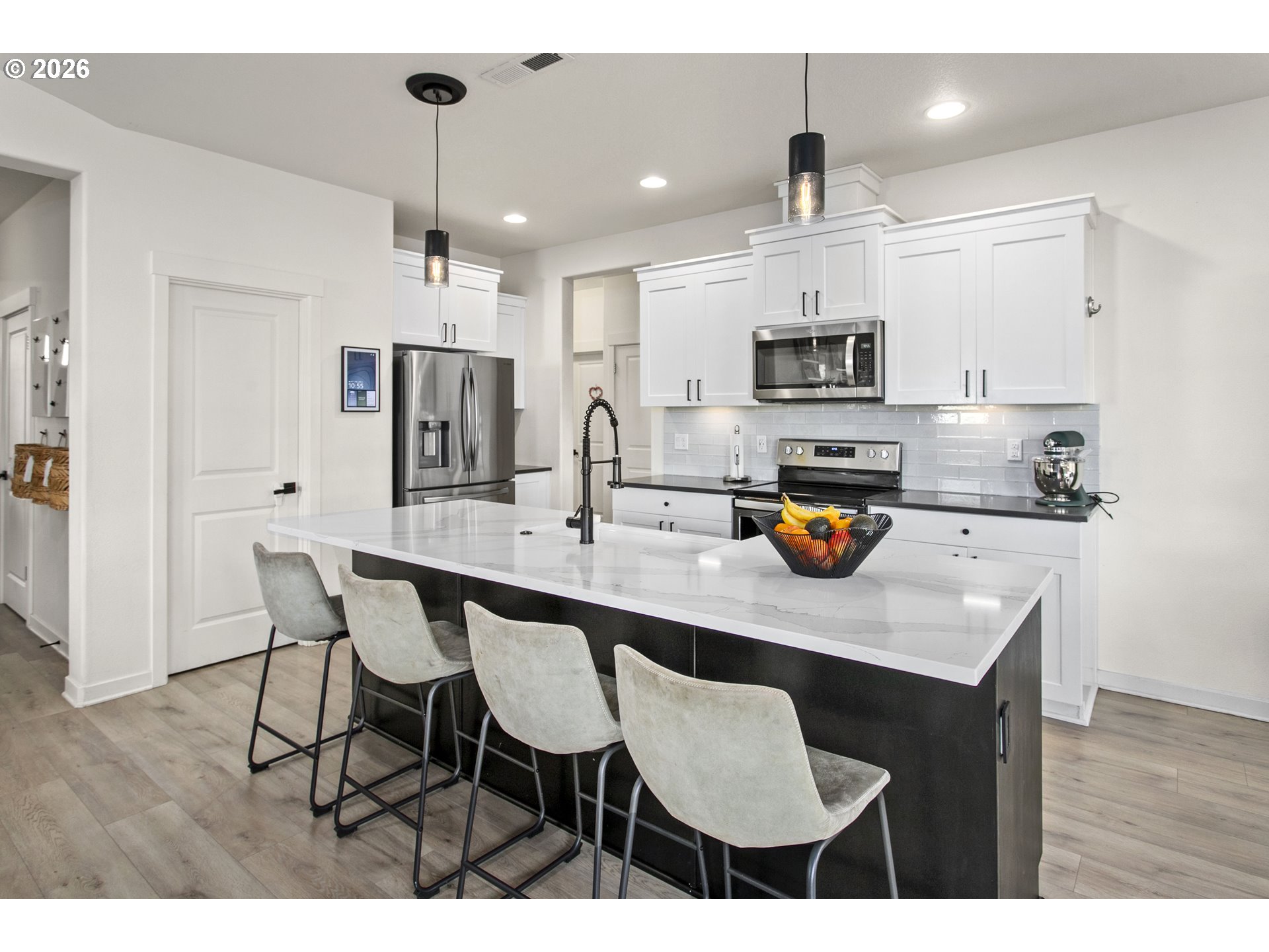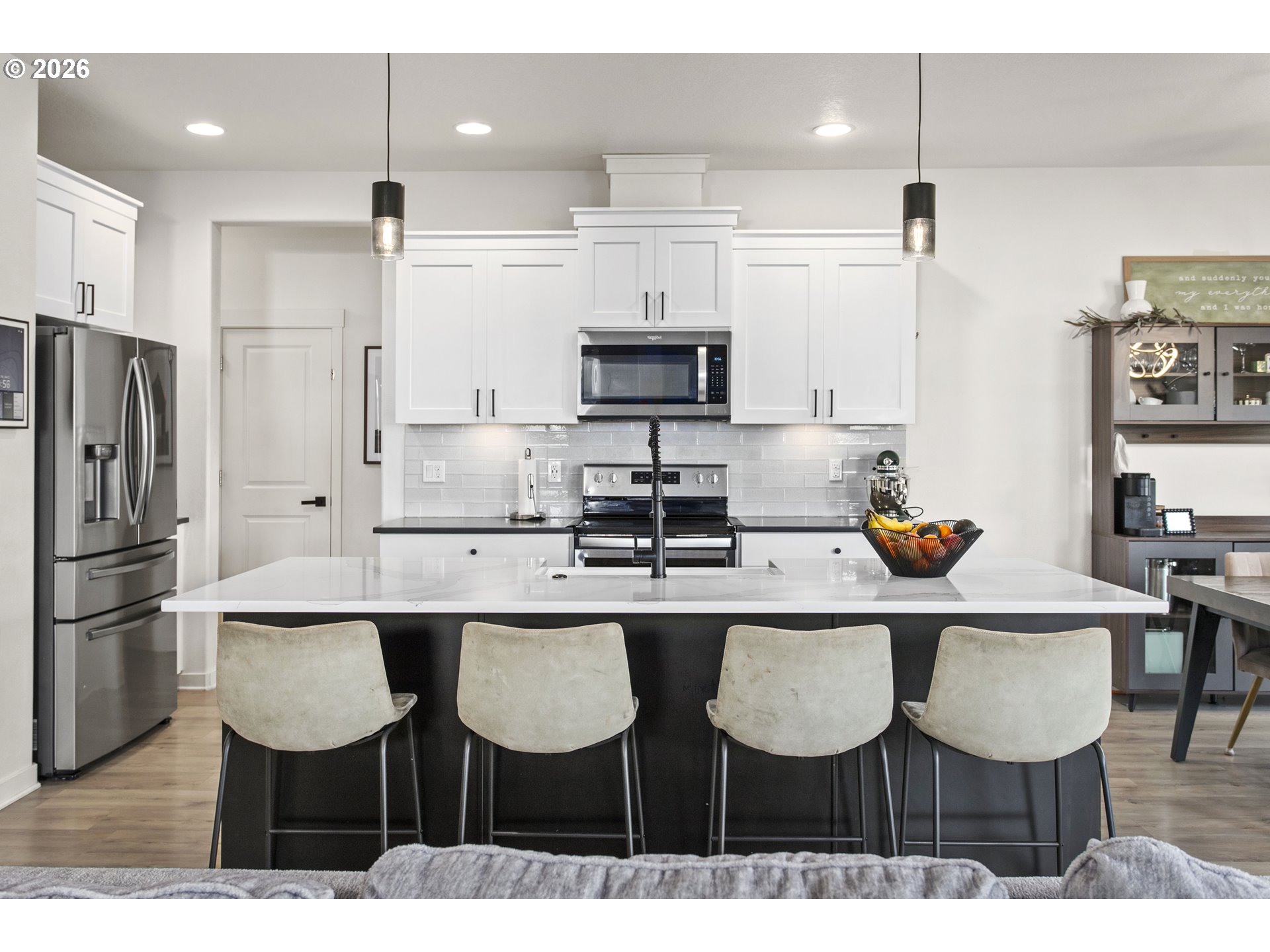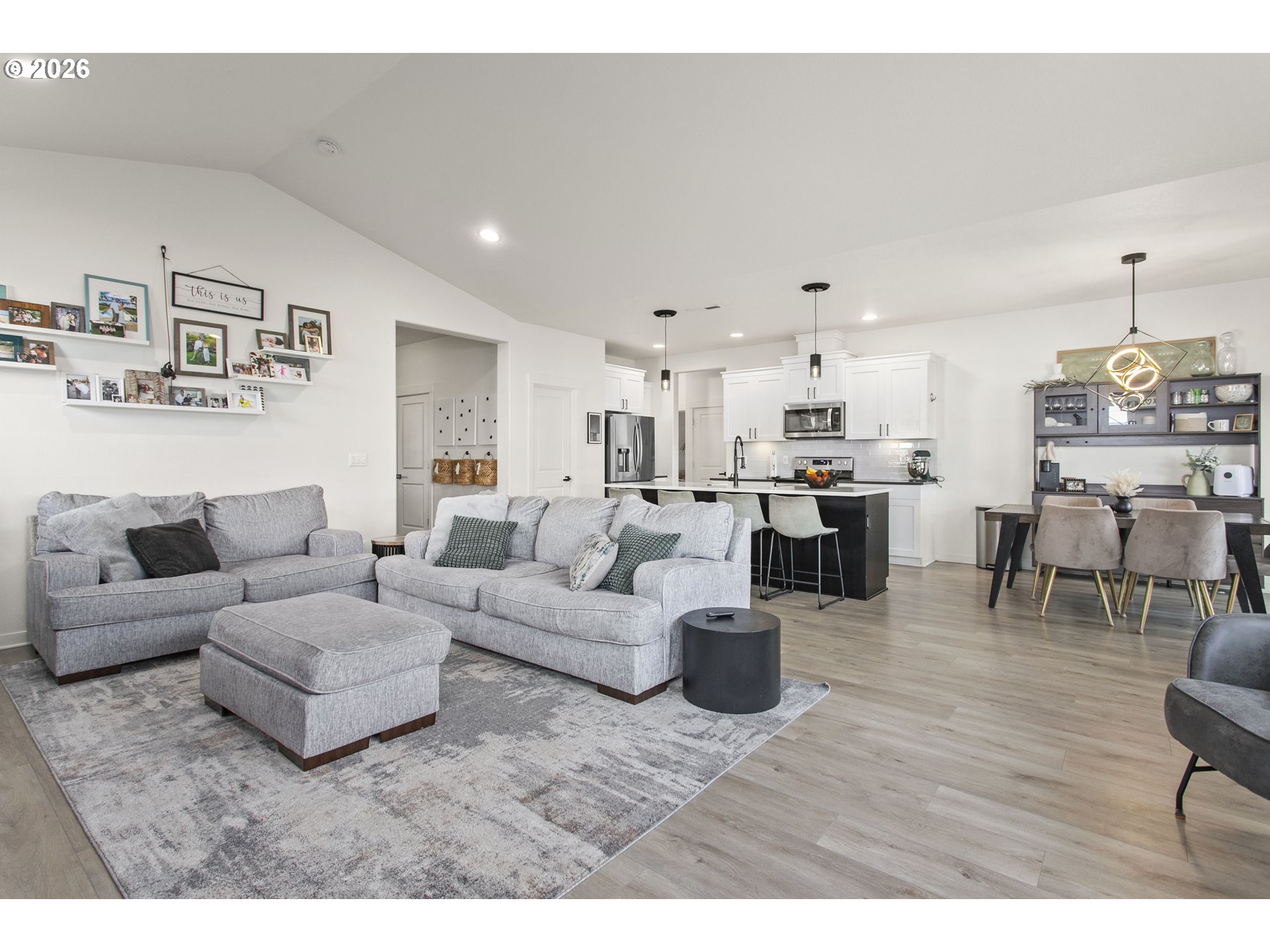 Modern comfort is everywhere in this spacious single level home on a sizeable 0.2 acre lot. Vaulted ceilings, a cozy fireplace and elegant laminate flooring create an inviting living space. The stunning custom island and marble accent countertop, farmhouse sink, pendant lights and generously sized pantry are just some of highlights! From accent lighting to door handles, this home is filled with classic details. The primary bedroom boasts an ensuite with a soaking tub and a spacious walk-in closet with custom organization. The backyard offers a 20x40 patio and an outdoor covered living space and an additional pergola, the perfect spot for year round entertaining. And to top it all off, a 3 car garage with workbench, storage and a large driveway. Comfort, beauty and functionality encompass this home. This is small town living at it's best with easy access to schools, the local library and the charm of downtown Estacada!