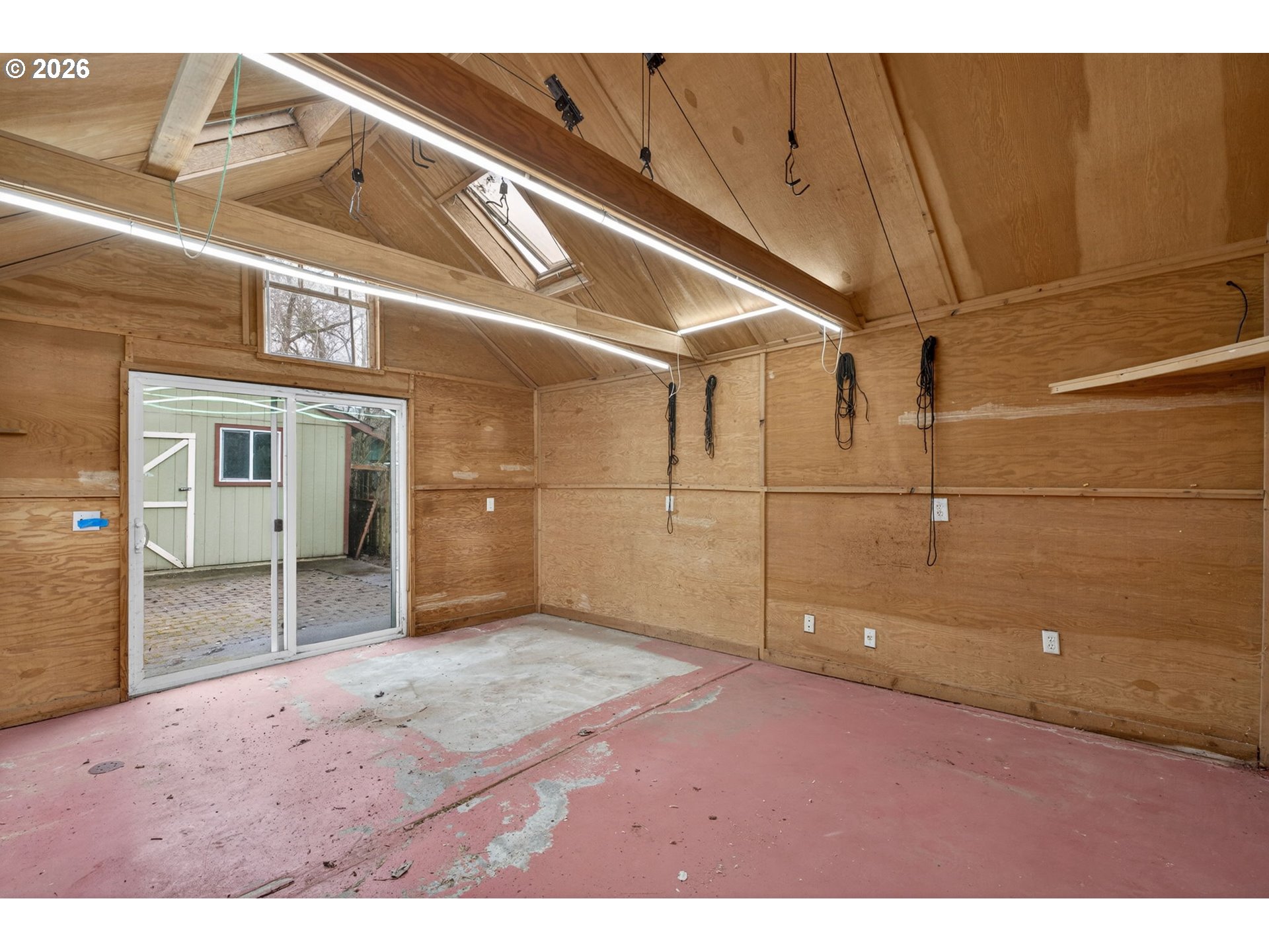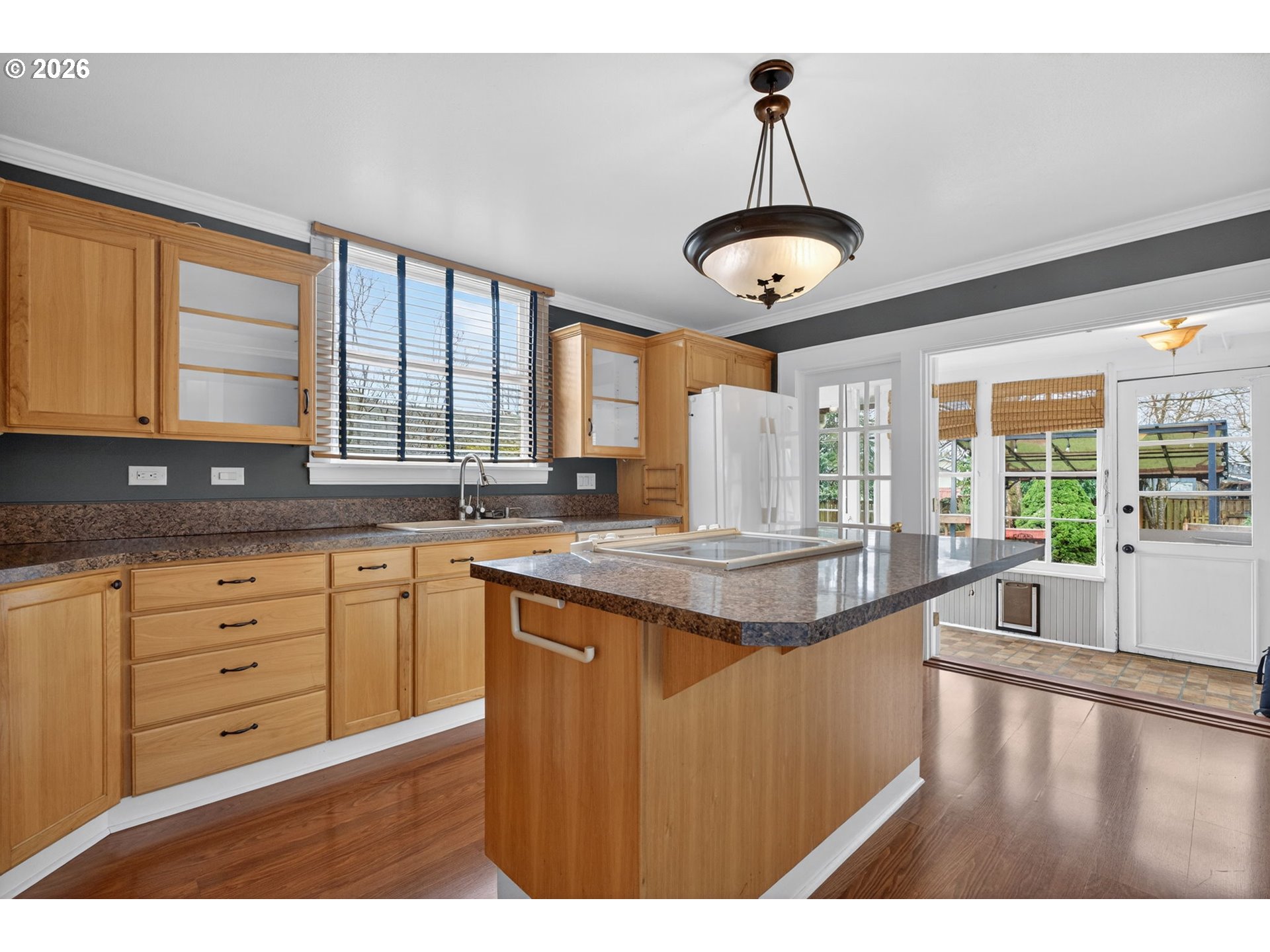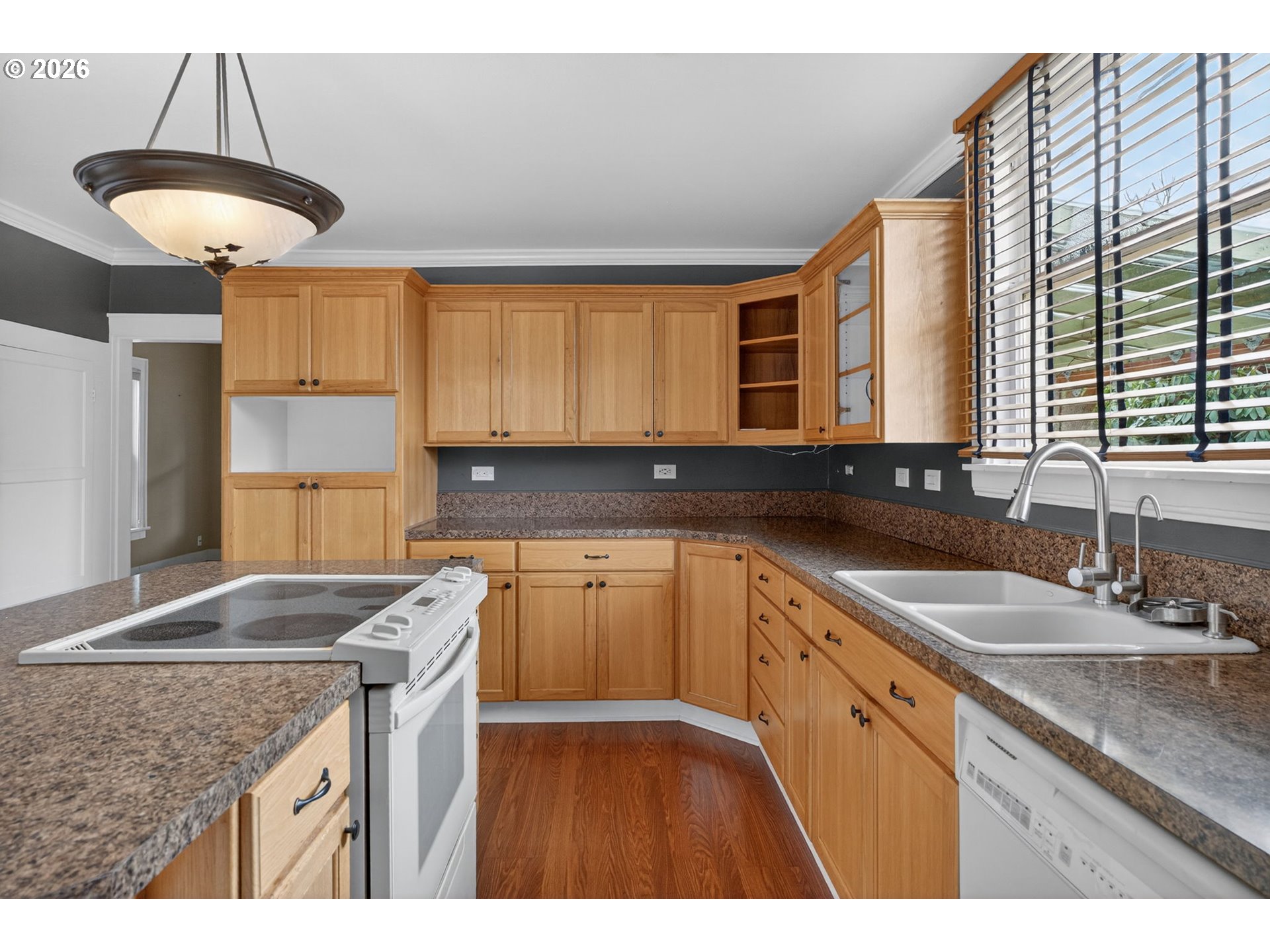 Sweet vintage vibe farmhouse with an incredible backyard retreat! This Milwaukie jewel box blends an open, light-filled floor plan with timeless charm and thoughtful modern updates. The generous living room offers abundant windows, great flexibility, and views of the inviting wraparound sitting porch. The open eat-in kitchen is ideal for everyday living or entertaining, featuring newer wood cabinets, an eating island, and full appliance package. Guests will love the remodeled main-floor bath showcasing a modern soaking tub, quartz vanity, fresh wainscoting, and a stylish barn door. The converted sunporch creates a delightful laundry space with a sink, built-ins, and three walls of paned windows. Enjoy effortless indoor/outdoor living with direct kitchen access to the backyard—perfect for BBQs and alfresco dining! Upstairs, two ample bedrooms feature cozy carpet and generous closets. The upper full bath includes a tub/shower combo, tile flooring, and a large skylight for natural illumination. Outside, fall in love with the fully fenced backyard offering covered and uncovered decks, a paver patio, and a large studio attached to the garage—ideal for projects, work, or creative pursuits. Mature trees provide shade, while sunny areas are perfect for gardening. The yard has well established perennial plants and trees with potential for lots more. A spacious shed keeps tools, gear, and toys neatly stored. Central air conditioning. 2 year old electric water heater. Located in a peaceful, friendly neighborhood within walking distance of two beautiful parks and nearby schools. Conveniently close to shopping and freeway access for an easy commute. A deep driveway offers abundant off-street parking for guests!