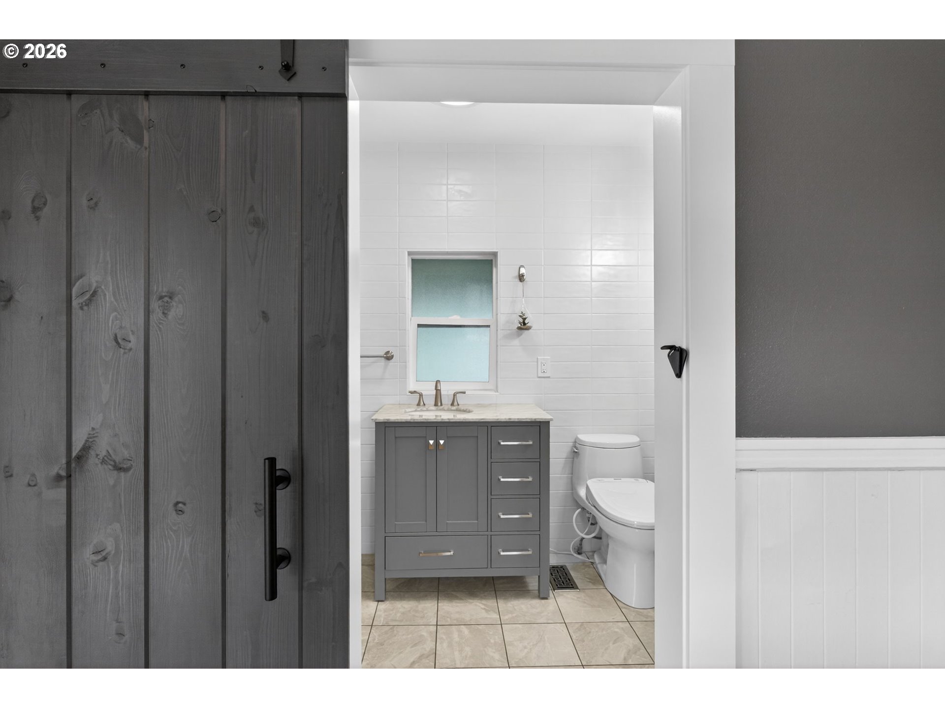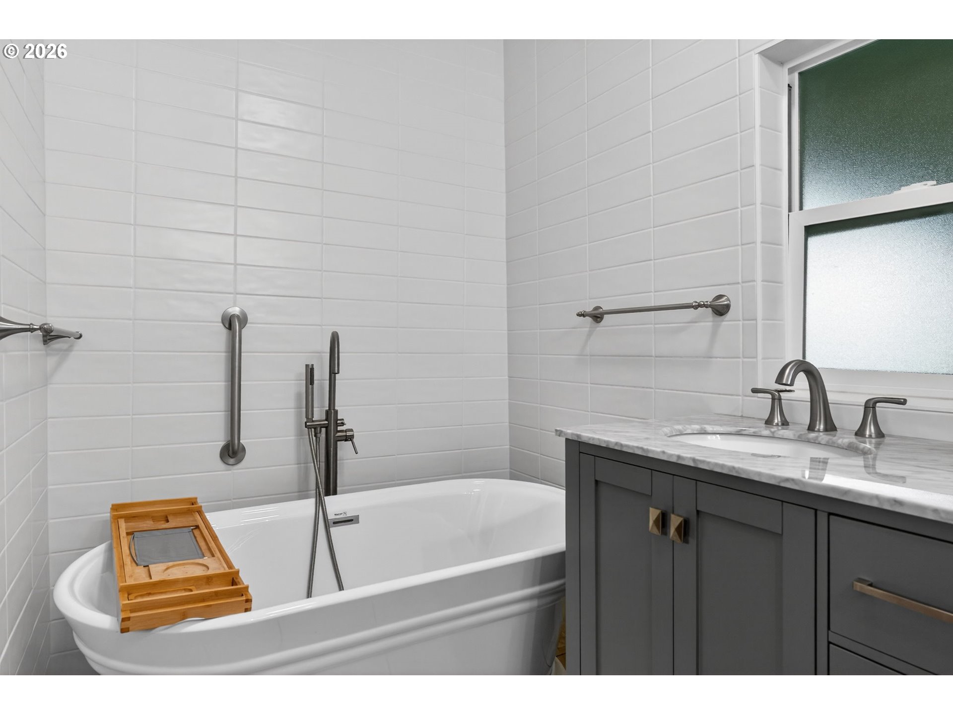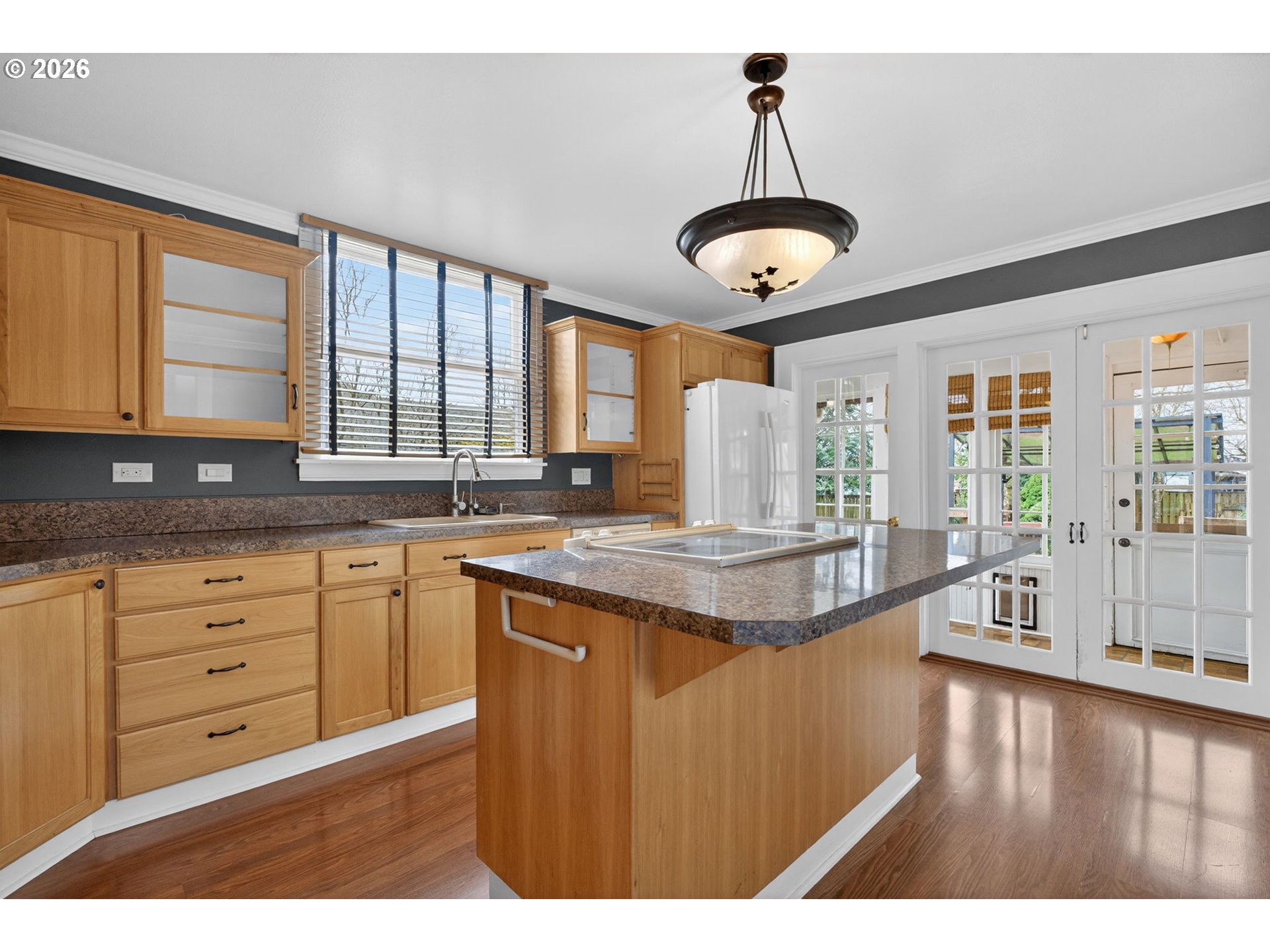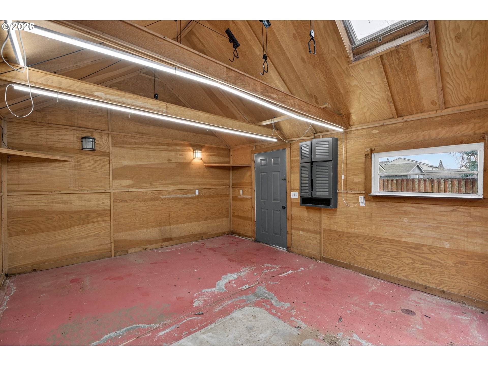 Sweet vintage vibe farmhouse with an incredible backyard retreat! This Milwaukie jewel box blends an open, light-filled floor plan with timeless charm and thoughtful modern updates. The generous living room offers abundant windows, great flexibility, and views of the inviting wraparound sitting porch. The open eat-in kitchen is ideal for everyday living or entertaining, featuring newer wood cabinets, an eating island, and full appliance package. Guests will love the remodeled main-floor bath showcasing a modern soaking tub, quartz vanity, fresh wainscoting, and a stylish barn door. The converted sunporch creates a delightful laundry space with a sink, built-ins, and three walls of paned windows. Enjoy effortless indoor/outdoor living with direct kitchen access to the backyard—perfect for BBQs and alfresco dining! Upstairs, two ample bedrooms feature cozy carpet and generous closets. The upper full bath includes a tub/shower combo, tile flooring, and a large skylight for natural illumination. Outside, fall in love with the fully fenced backyard offering covered and uncovered decks, a paver patio, and a large studio attached to the garage—ideal for projects, work, or creative pursuits. Mature trees provide shade, while sunny areas are perfect for gardening. The yard has well established perennial plants and trees with potential for lots more. A spacious shed keeps tools, gear, and toys neatly stored. Central air conditioning. 2 year old electric water heater. Located in a peaceful, friendly neighborhood within walking distance of two beautiful parks and nearby schools. Conveniently close to shopping and freeway access for an easy commute. A deep driveway offers abundant off-street parking for guests!