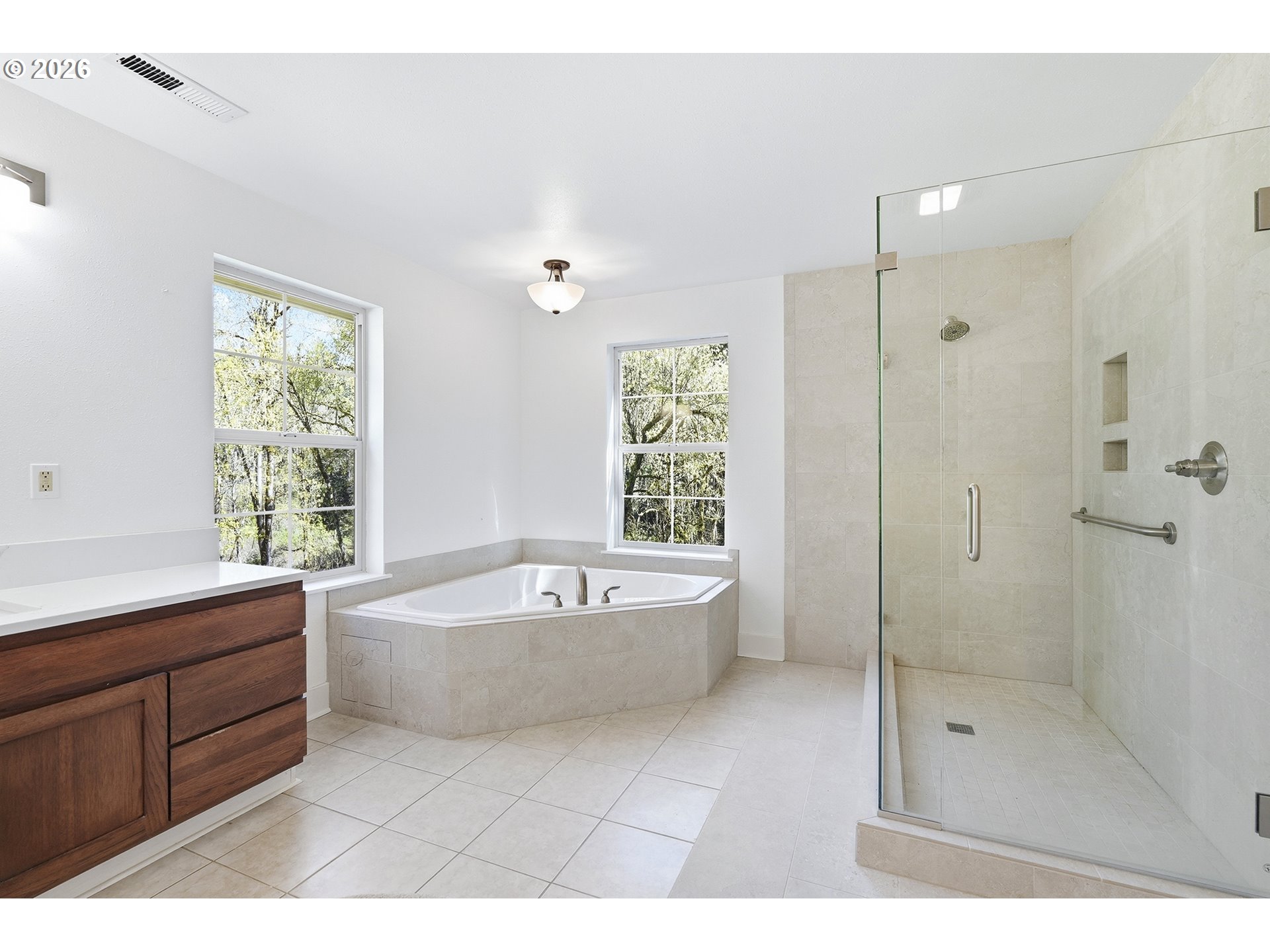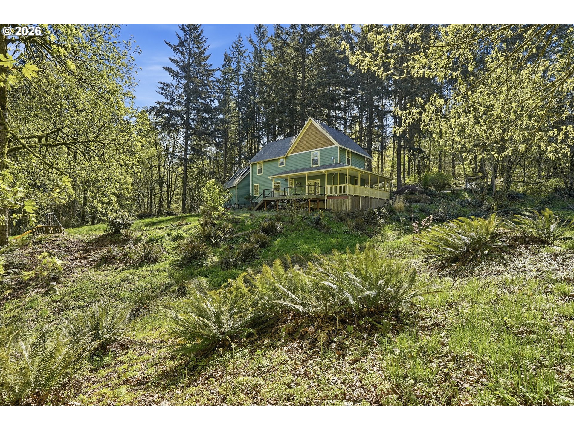 Nestled on 2.8 acres of private, wooded land, this Oregon City retreat offers a rare blend of seclusion, versatility, and everyday convenience. Set back among the trees, the home feels like a world away, yet is just minutes to town and I-205 for an easy commute.Inside, farmhouse charm meets modern updates. The light filled living space features beautiful hardwood floors, French doors, and an open layout that flows effortlessly to the wraparound deck - an ideal place to relax and take in the peaceful, wooded surroundings.The spacious kitchen is both functional and inviting, with an island, ample cabinetry, and updated counters, all overlooking the natural beauty outside. It’s truly the heart of the home.Upstairs, you’ll find three bedrooms and two full bathrooms, including a serene primary suite with soaking tub, walk-in shower, and views of the surrounding trees from every window. A full bathroom on the main level adds flexibility for guests.What truly sets this property apart is the versatility of the land and outbuildings. The detached garage is fully insulated, heated with a mini-split, and plumbed making it ideal for a studio, workshop, or creative space. Above, a separate studio with its own entrance and deck offers even more flexibility. A fully serviced concrete slab with water, power, and septic opens the door to a shop, sport court, RV setup, or future possibilities. A 1/4 acre irrigated garden, fruit trees, raised beds, heated shed, RV parking, EV charger, and a seasonal creek complete the setting.Recent updates including a new heat pump, plumbing, deck, and refreshed kitchen and baths, bring comfort and peace of mind.This is more than a home! It’s a lifestyle defined by privacy, possibility, and a peaceful connection to nature, all just minutes from town.