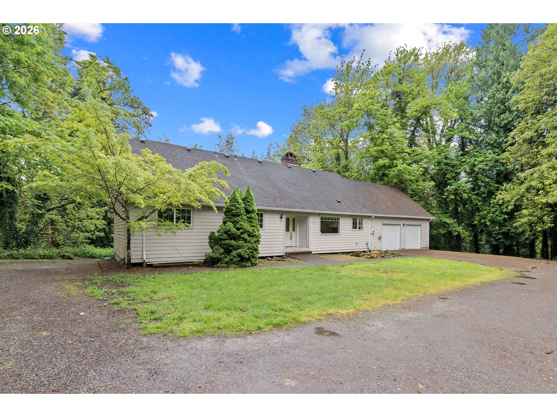 Rare double-lot opportunity in West Linn—1.03 acres with flexible living spaces and multi-home potential. Tucked at the end of a private dead-end road, this expansive property offers privacy, mature trees, and elevated views above the Tualatin River while still being close to shopping, schools, and amenities. The large home features two full kitchens and a separate lower-level apartment with its own entrance, ideal for multi-generational living, a guest suite, or rental income. With 8 bedrooms, generous square footage, and multiple living areas, the layout supports a wide range of living arrangements. Sitting on two tax lots, the property presents exceptional possibilities: adjust the lot line, build a second full home, add a guest house, or explore other configurations—all subject to buyer due diligence with planning and zoning. The land is partially sloped and wooded, offering a secluded, natural setting rarely found this close to town. Sold AS-IS, this property is perfect for buyers seeking space, privacy, and development potential in the highly rated West Linn School District.
