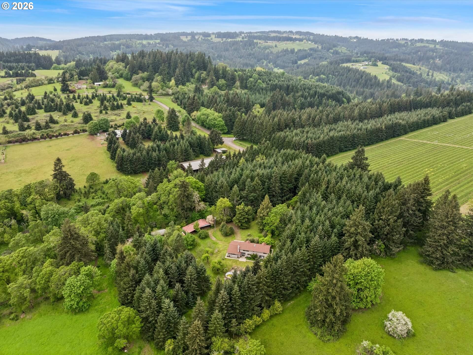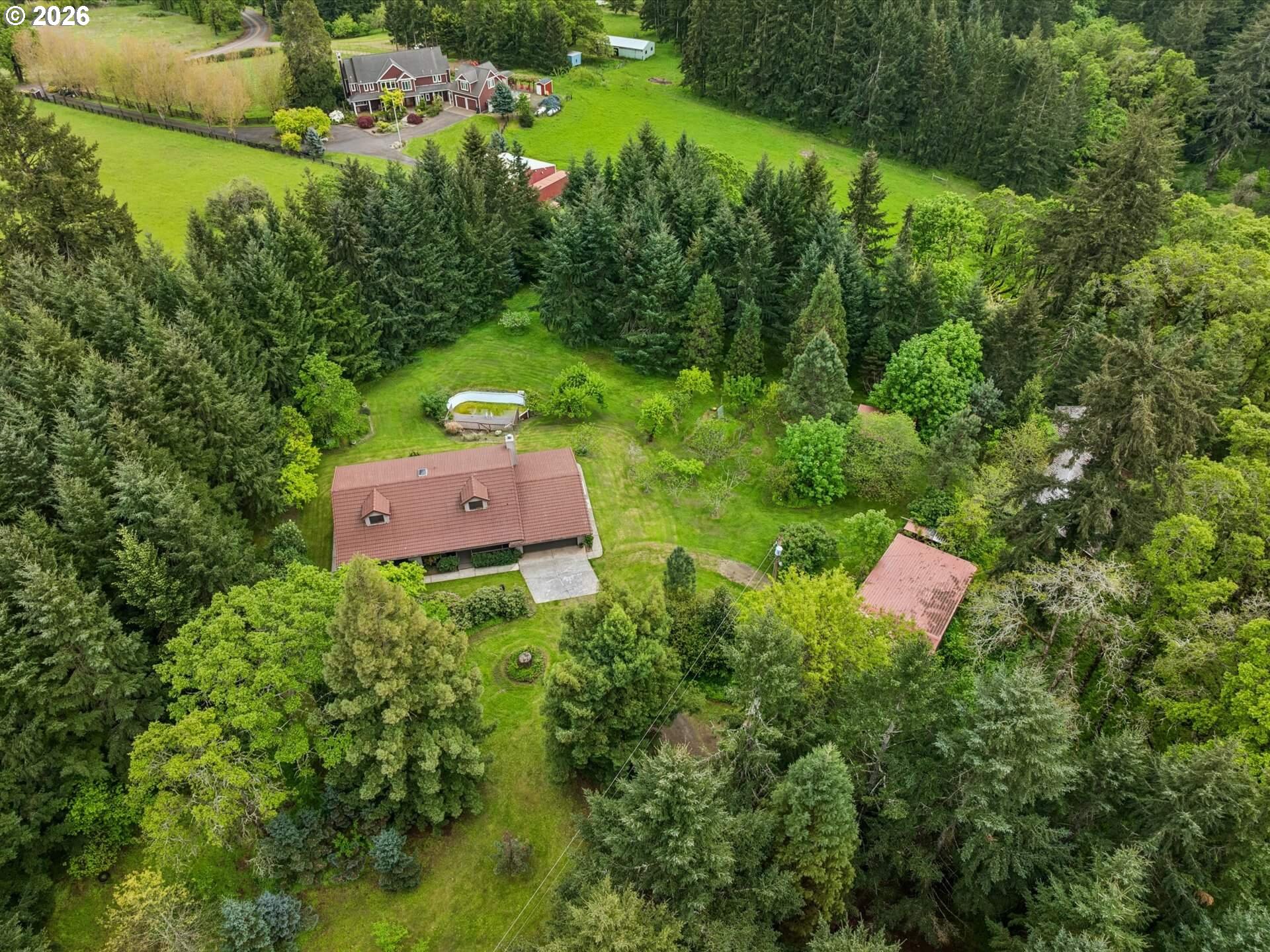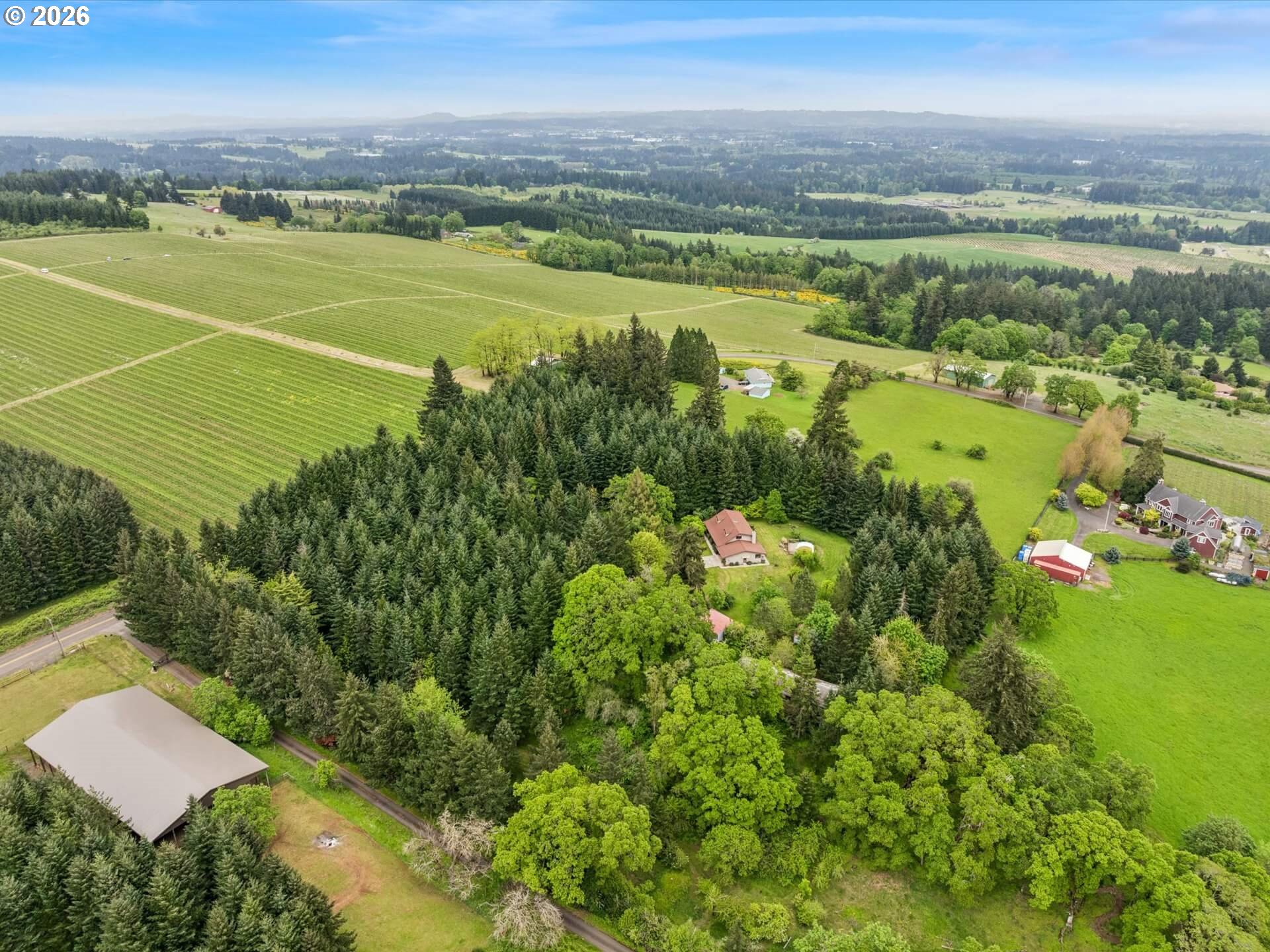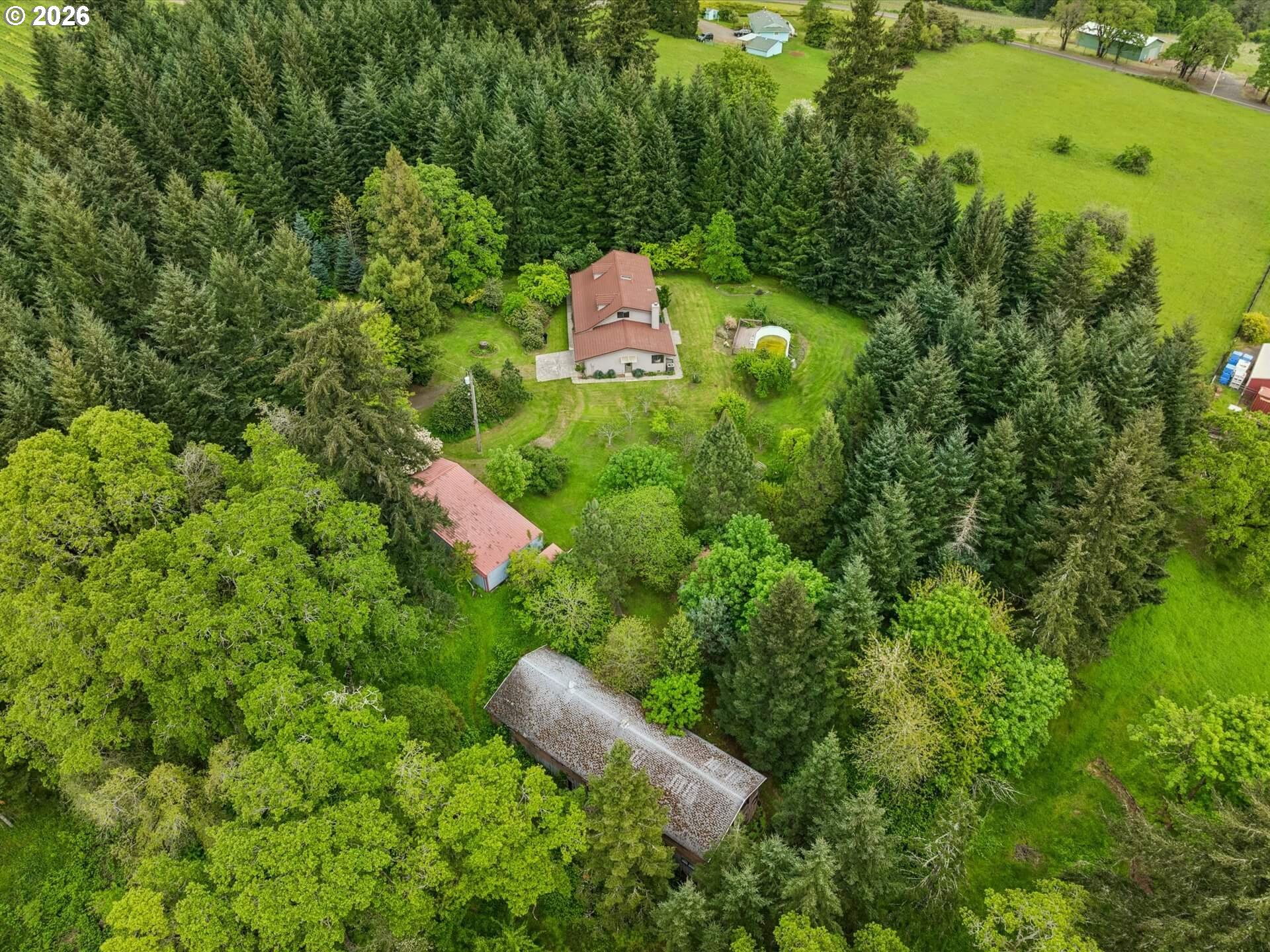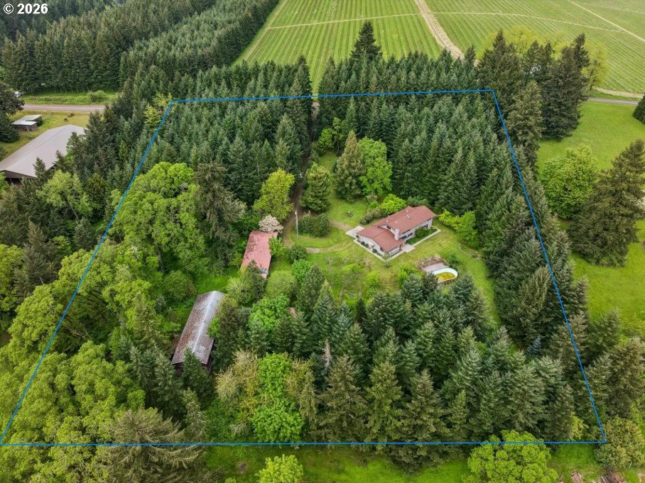 Acreage like this simply doesn’t come along. Just minutes to Wilsonville, this stunning 6+ acre setting blends curated beauty with true Northwest character—lush, manicured grounds, towering firs, rolling pasture, wooded trails, and a fruit tree orchard, all framed by private views and neighboring vineyard fields. The original-owner, custom-built 1984 home offers 5 bedrooms and 3.5 baths—solid, spacious, and ready to enjoy or elevate. Tile roof, recently painted cedar siding, newer HVAC with AC (2025), and new 200-amp panel (2025) brings comfort and peace of mind. A 360-ft well services house and property, and the large covered shed is perfect for tractors and gear. County forest deferral keeps taxes low. Private. Usable. Close-in. Rare. A true lifestyle property with space to breathe, room to grow, and endless potential—properties like this are tightly held and seldom available.