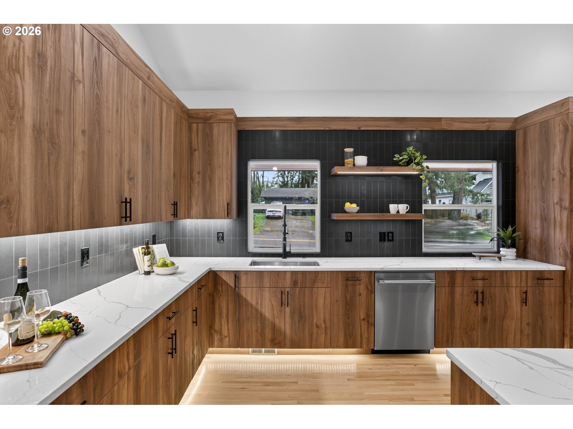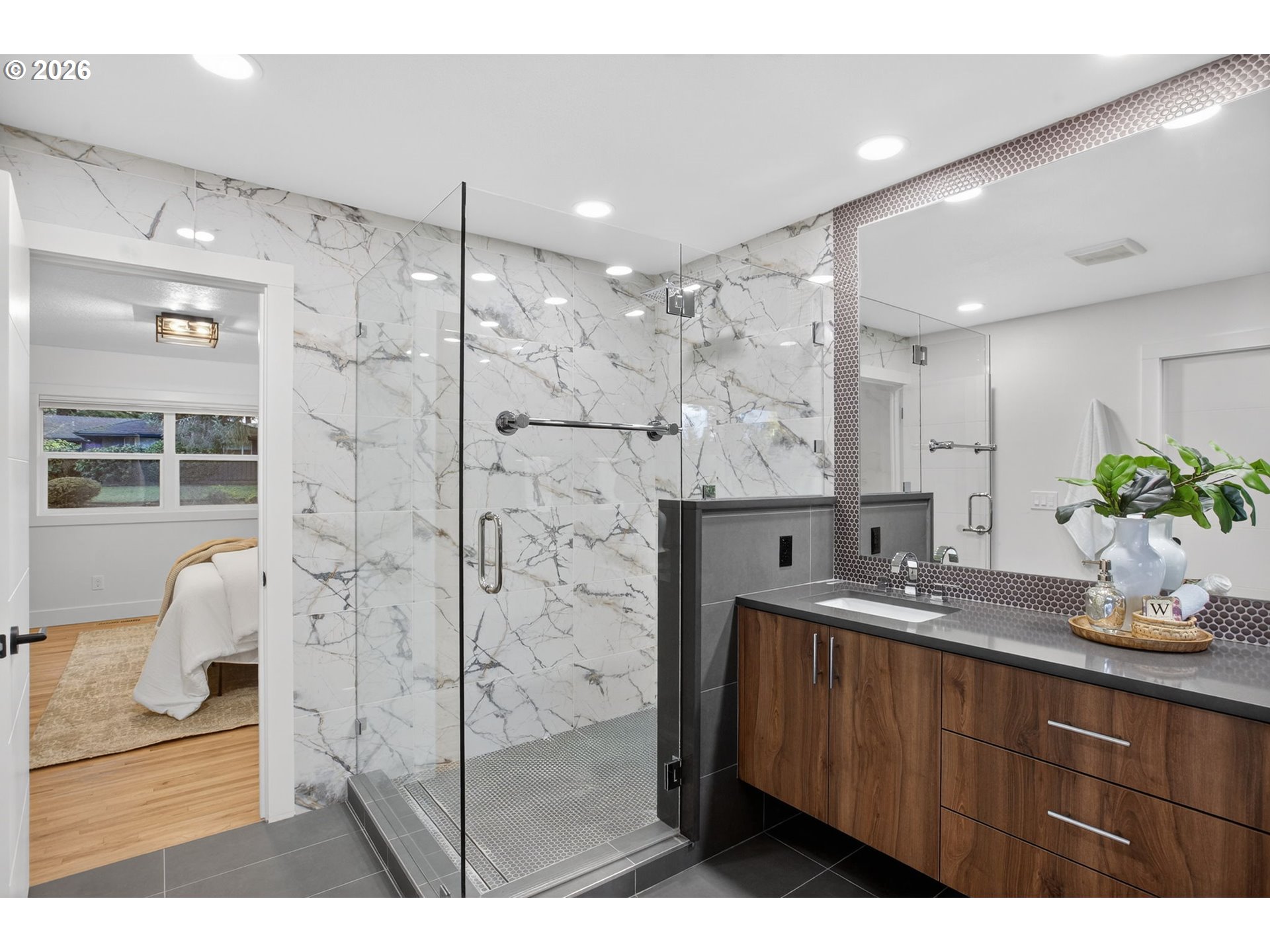 Nothing like this on the market!!! A modern gem in the heart of LO's Palisades neighborhood! The gourmet chef’s kitchen and thoughtfully designed floor plan set the tone for this mid-century influenced masterpiece, offering ideal main-level living with a serene primary suite, private office, and the ultimate convenience of dual laundry rooms. Exquisitely appointed with high-end appliances, custom features, and abundant cabinetry, the kitchen is perfectly suited for entertaining both indoors and out, flowing seamlessly to the spacious composite deck. This rare LO find lives like new construction, having been fully remodeled from top to bottom with a multitude of thoughtful seller upgrades including a whole-home generator, custom blinds, and professionally designed landscaping. Truly move-in ready in every way. Vaulted ceilings in the great room enhance the sense of scale, and the home lives far larger than the square footage with multiple flex spaces, abundant storage, wet bar, wine cellar, and easy access to the backyard. Perfect for multigenerational living, the lower level offers a private apartment-style setup with versatility and its own separate side entrance. Refined designer finishes, tasteful upgrades, oversized bedrooms, epoxy garage flooring, and coveted boat and RV parking options further elevate the home. The oversized, completely flat backyard is a true sanctuary, rare, private, and fully usable, ideal for gatherings or quiet enjoyment. Conveniently located just around the corner from the new Lake Oswego Recreation & Aquatics Center (LORAC), executive golf course, New Seasons Market, parks, coffee shops, and more. Zoned for access to the highly sought-after Greentree pool, this is an extraordinary opportunity in one of Lake Oswego’s most desirable neighborhoods, served by top-rated Lake Oswego schools.