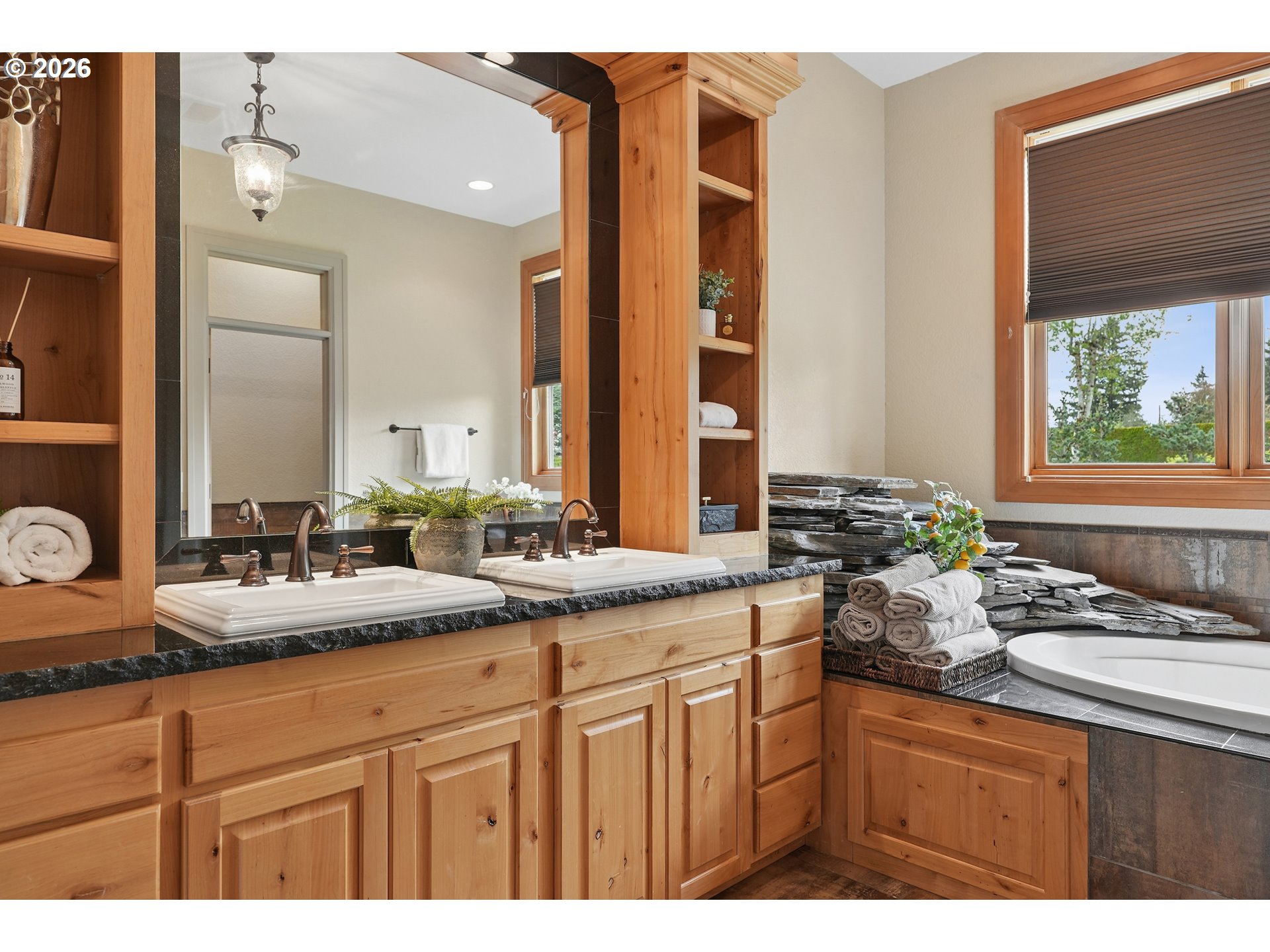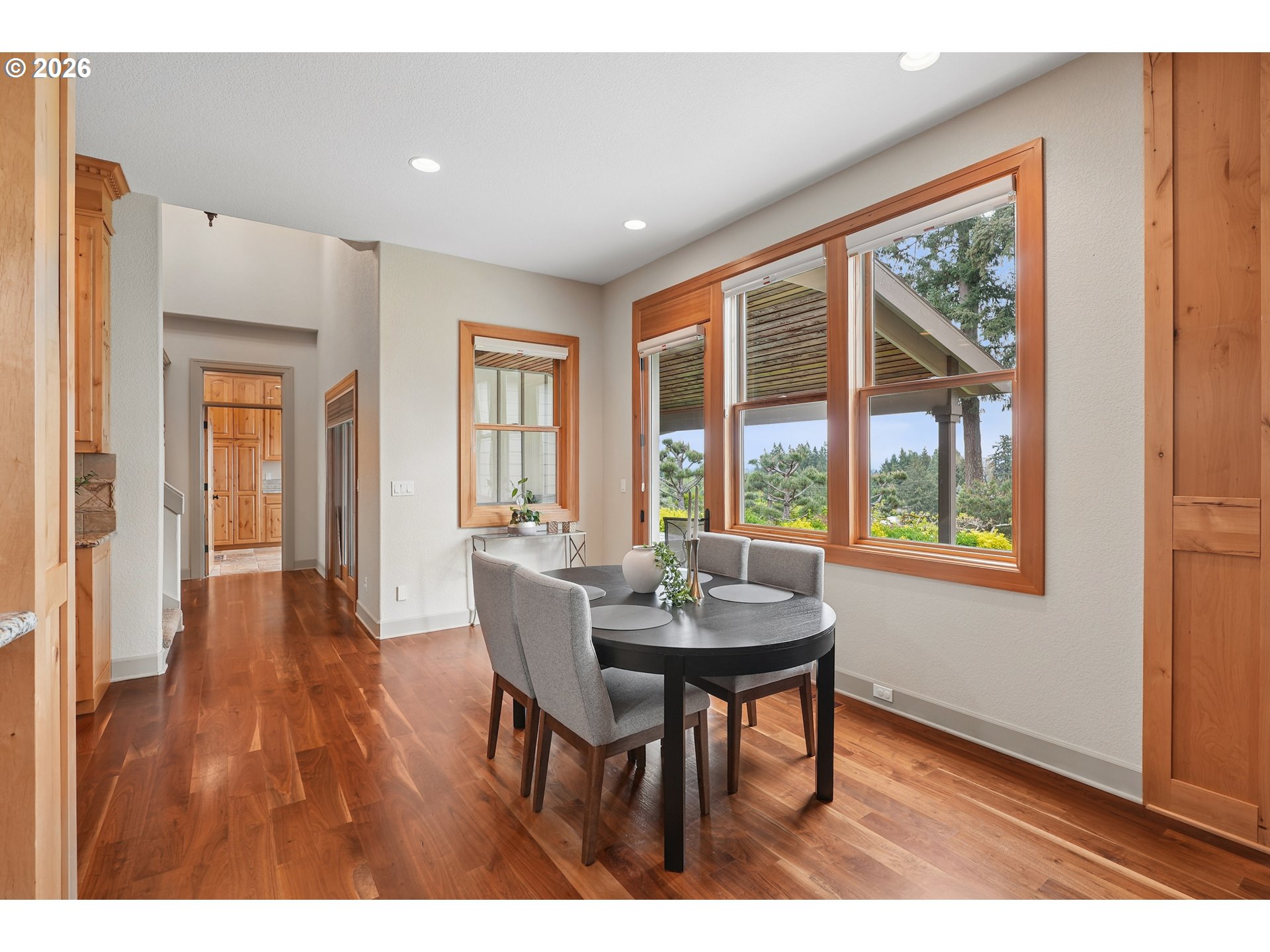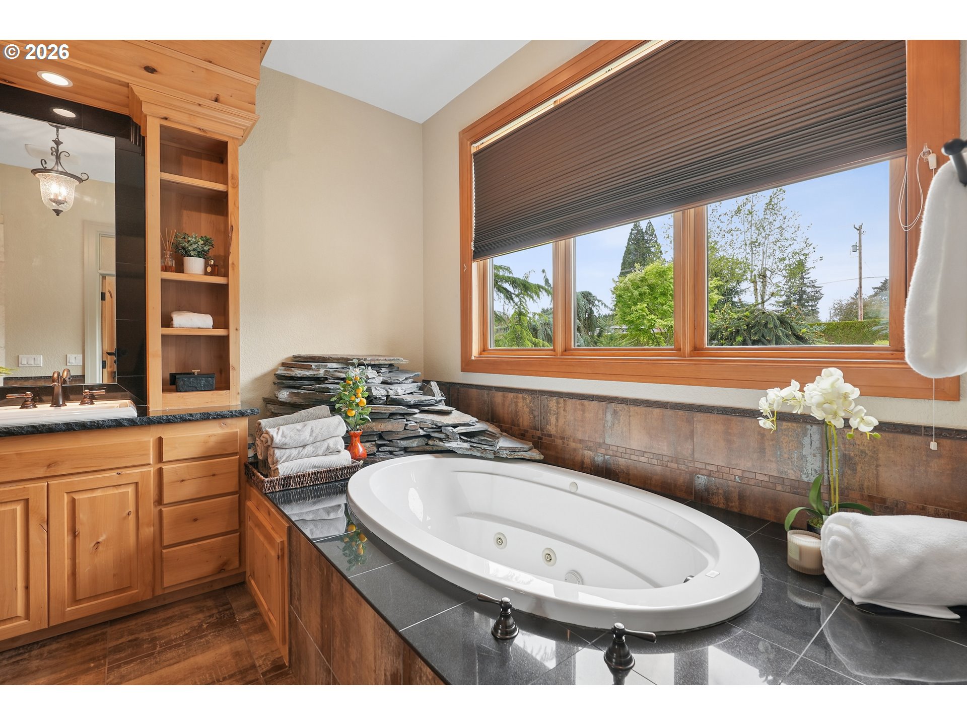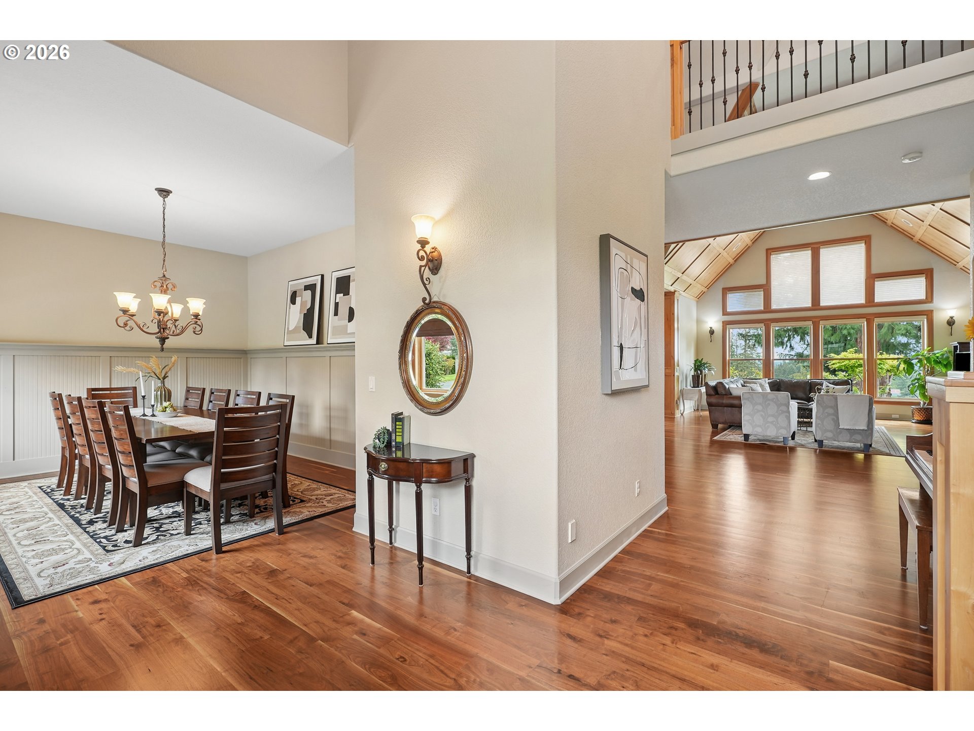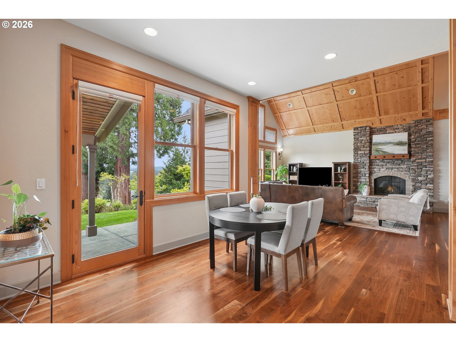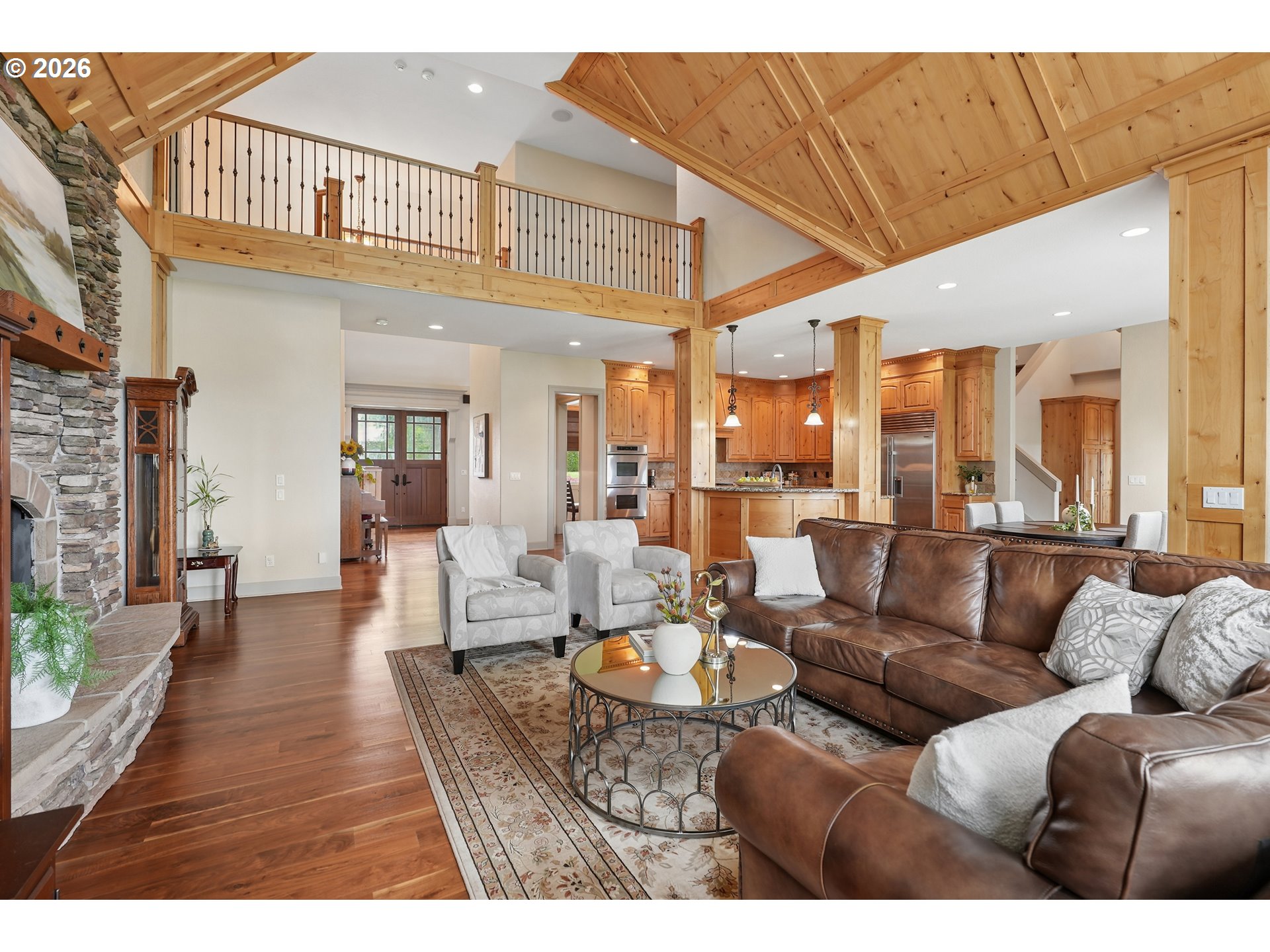 Set along the prestigious Oregon City Street of Dreams, this is a rare opportunity to own a truly exceptional estate! Nestled on over 2 private acres and behind a gated entry, this 4,791 sq ft, 4 bedrooom, 3.5 bathoom home blends rustic beauty with refined elegance in every detail. Enter into soaring ceilings and a statement rock fireplace that anchors the main living space with incredible floor to ceiling windows. The rich hardwoods, enchanting wood accents, slate, and granite create a warm and elevated feel throughout. Designed for both everyday living and unforgettable entertaining, this home features a formal dining room, a butler’s pantry, and plenty of options for the wine connoisseur. The kitchen is gorgeous, with high-end stainless steel appliances, a double oven, gas range and a curved island. You'll find the beautiful primary suite on the main level and it's a retreat of its own. It showcases a private patio, a spa-inspired ensuite, a large walk-in shower and a striking waterfall feature that flows into a jetted tub- ready to bring you peace and relaxation. All the upstairs bedrooms are generously sized and offer walk-in closets. But this home doesn't stop there! It also features a large bonus room and a dedicated home theater. Then step outside to an entertainers dream, with a gorgeous stamped concrete patio and an outdoor kitchen space ready for unbelievable PNW summer nights. You'll be surrounded by stunning and meticulously maintained lush grounds with tranquil water features, a fire pit, and breathtaking views of Mount Hood and the Willamette valley. The sunsets are spectacular! Your dream home is here, tucked into the peaceful countryside. Yet, you'll be just minutes from dining and shopping in downtown Oregon City. This home offers the perfect balance of privacy, luxury, rustic charm and convenience. With new upgrades, a spacious 4 car garage, and evident pride of ownership throughout, this is more than a home. It’s a legacy property.