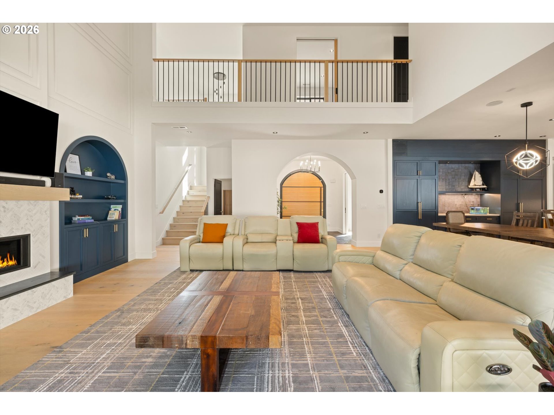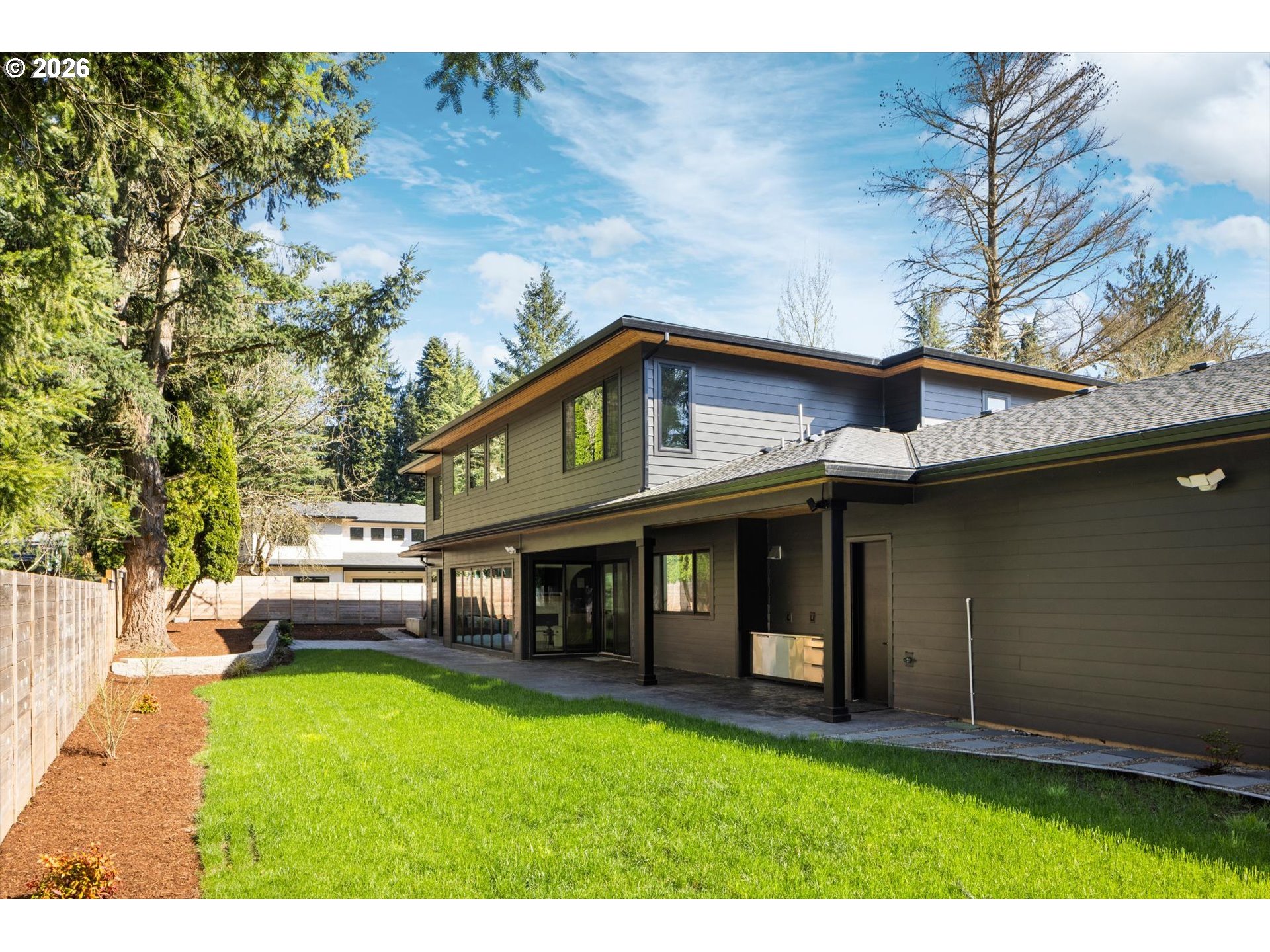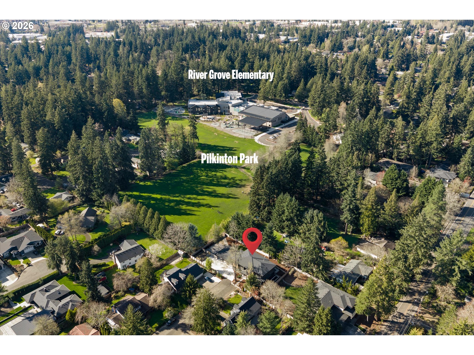 Grand transitional home situated at the end of a quiet cul-de-sac with private, direct access to Pilkington Park and the newly built River Grove Elementary School. This custom-built residence offers 5 true bedrooms, 3.5 bathrooms, and nearly 4,300 square feet of living space with a rare wide footprint ideal for separation of spaces or multi-generational living. Flexible floor plan includes multiple living options such as dual offices, bonus room, or bunk room configuration. The chef’s kitchen opens to a dramatic great room with 24-foot ceilings and expansive walls of glass providing abundant natural light. Main-level primary suite, laundry, and office allow for convenient single-level living. Additional features include generously sized guest rooms, a spacious bonus room, and an oversized garage. Outdoor amenities include a covered entertaining area, large yard, ample parking, and versatile space suitable for gardens, play areas, or RV/boat storage.