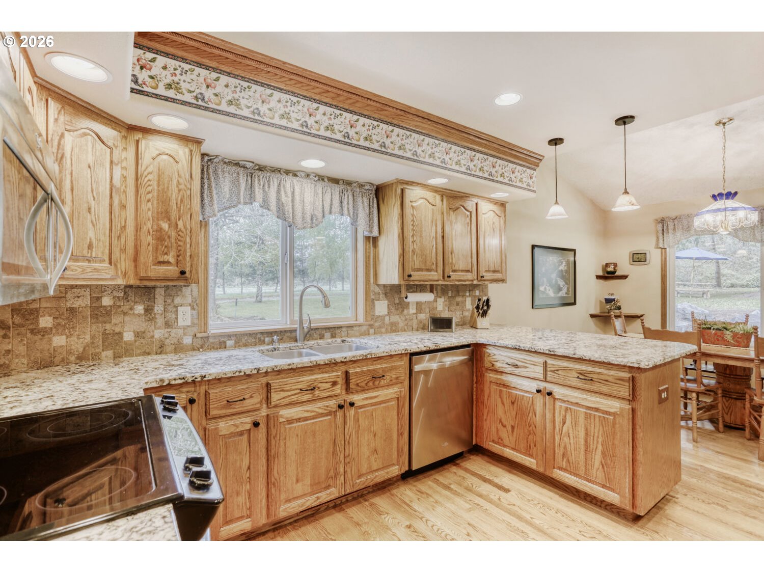 Custom-built and beautifully maintained, this exceptional single-level home in Sandy offers the perfect blend of comfort, functionality, and space on 4.9 usable acres on a park like setting. With 2,382 sq ft of thoughtfully designed living space, this one-level residence features 3 spacious bedrooms, 2 full bathrooms, plus a dedicated office—ideal for working from home, hobbies, or additional guest space. A spacious 3-car attached garage provides ample room for vehicles, storage, and projects, with an abundance of cabinetry. The impressive 28 x 44 insulated and heated shop includes 3 bays, making it ideal for car enthusiasts, contractors, hobbyists, or anyone needing serious shop space. In addition, a separate 20 x 20 outbuilding is perfect for tools, lawn equipment, mower storage, or additional workspace. The nearly 5-acre setting is conveniently close to town amenities. Less than 10 minutes to shopping, and approx. 30 minutes to Mt Hood. A true one-of-a-kind opportunity with custom quality, usable acreage, and incredible outbuildings—this is the lifestyle property buyers have been waiting for. The roof on the house was installed June 2025. The depth on the private well is 280 feet. Custom kitchen features pull out drawers, granite counter tops, newer appliances, eating bar, hardwood floors, and pantry. Soaring vaults throughout.