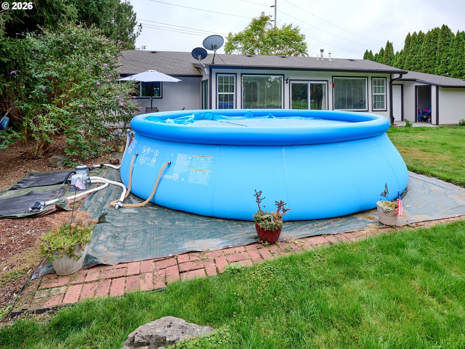 Welcome to golf course living without the HOA! This beautifully updated single-level ranch home sits right on Arrowhead Golf Course and offers a rare combination of comfort, convenience, and charm. Featuring 3 bedrooms (one currently used as a family room with dual closets), the floorplan is versatile and inviting. The primary suite boasts a walk-in closet and a spacious walk-in tile shower, while the guest bedroom also includes a walk-in closet for ample storage. Recent updates shine throughout, including a modern kitchen, refreshed bathrooms, new carpet in the living room, and luxury laminate flooring. The tandem garage is ideal for vehicles, storage, and even a golf cart with direct access to the course. The outdoor space is designed for year-round enjoyment with a fully fenced yard, storage shed, workshop, firepit, and plenty of parking for cars, RV, or a boat. In the warmer months, relax in the above-ground pool, then easily convert the paver area into a perfect patio spot for dining and entertaining during cooler seasons. Enjoy the beauty of large yard living, golf course views, and an easy commute to the city—all from your very own Arrowhead retreat.