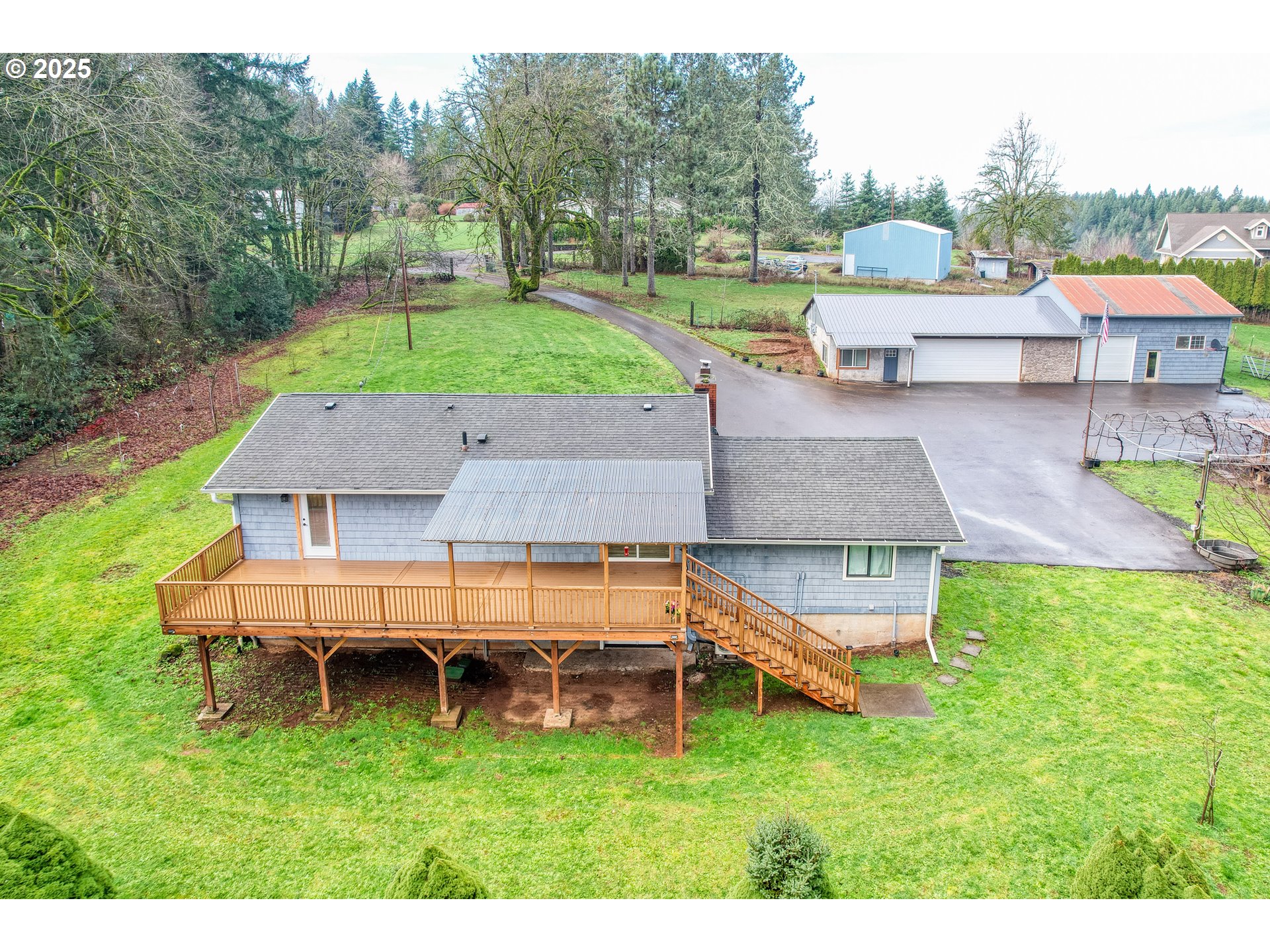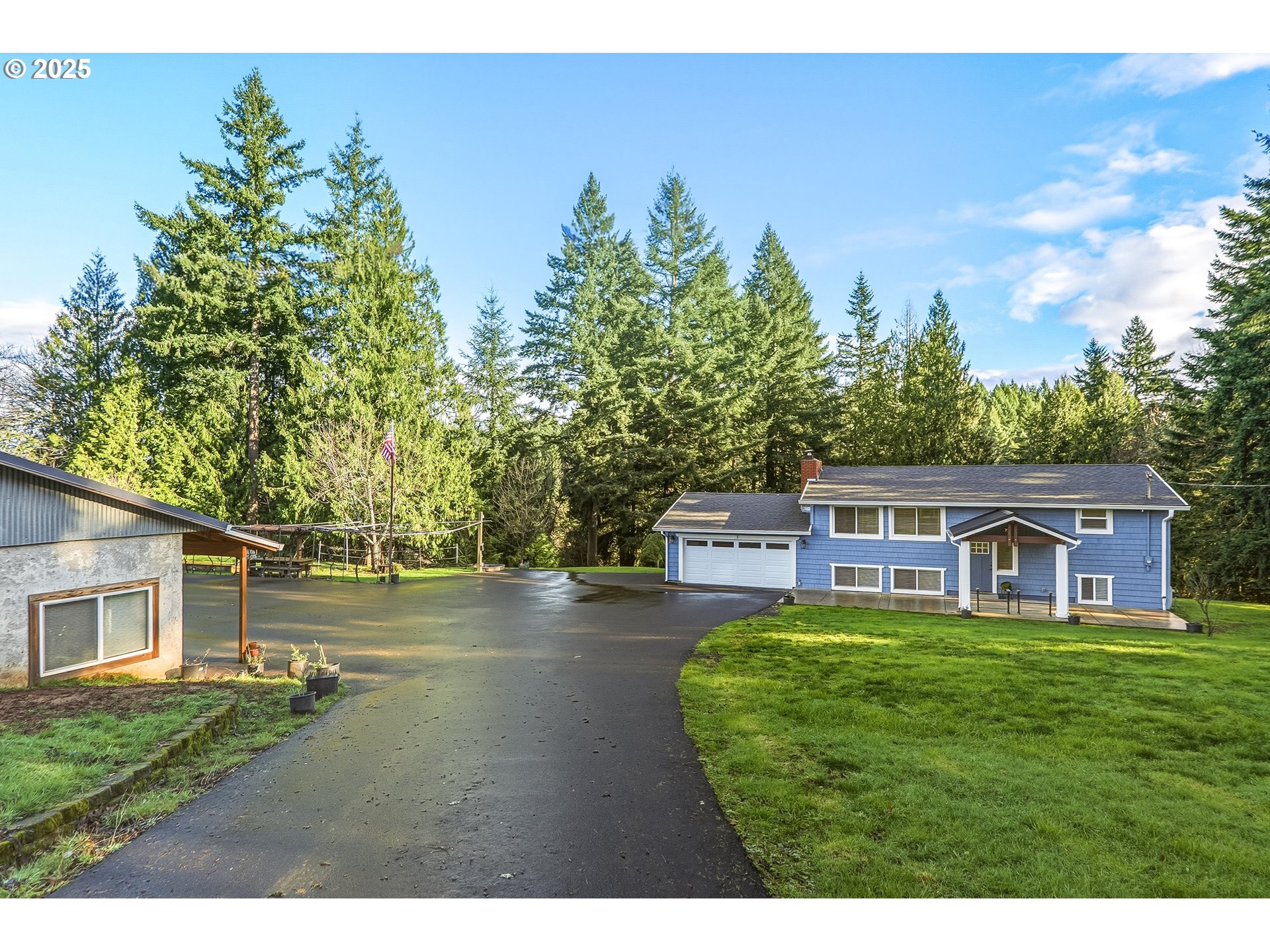 Stunning 2,000 sq ft remodeled home on 7.4 private, wooded acres in highly desirable Boring, OR, with breathtaking Mt. Hood views! This home perfectly blends mid-century modern and contemporary style, featuring an open-concept kitchen with vaulted ceilings, a huge quartz island, mosaic backsplash, and abundant natural light, ideal for entertaining or gathering with family. The lower level boasts a cozy living room with a stone fireplace and wood-burning stove, three bedrooms and a bathroom with a walk-in shower and double vanity. The spacious primary suite offers two closets and private deck access with expansive deck views over serene natural surroundings. Enjoy the peace and privacy of country living while remaining conveniently close to schools, grocery stores, gas stations, and other essentials. This incredible property also includes guest quarters attached to the shop (studio with kitchen and full bath), 3-bay shop, manufactured home, barn, and two sheds, offering endless possibilities for hobbies, storage, or multi-use living. Don’t miss this one-of-a-kind opportunity to have the best of both worlds—country tranquility with everyday convenience nearby!