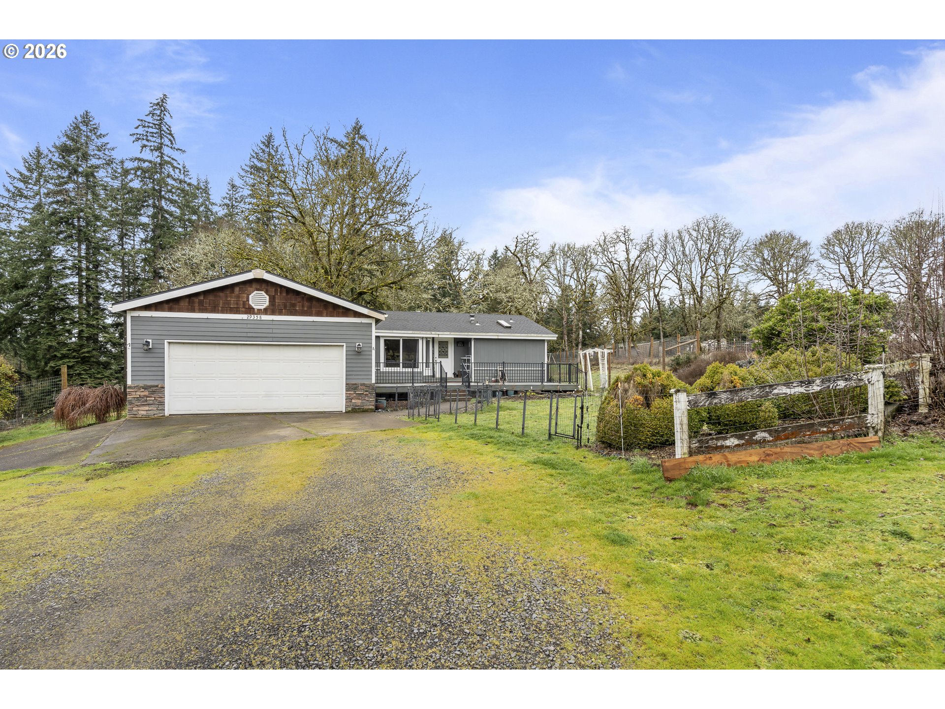 One-level country living on more than 5 acres of meadow and forest, peaceful and seemingly a world away yet only 10 minutes from schools and shopping. The house features high ceilings and plentiful windows, newer plank flooring and scenic views of the forest. A combination floorplan blends living/dining/kitchen but also includes a massive bonus room. The kitchen is well-equipped with food prep island, built-in microwave and dishwasher and free-standing range/oven. The primary suite includes walk-in closet, soak tub and walk-in shower. Trex decks flank both front and back of the house for nightime star-watching or summer entertaining. The property is fully fenced for your horses/livestock and includes both a 12x12 equipment building and 3-stall barn with tack room and more covered storage. Begin your country life here!