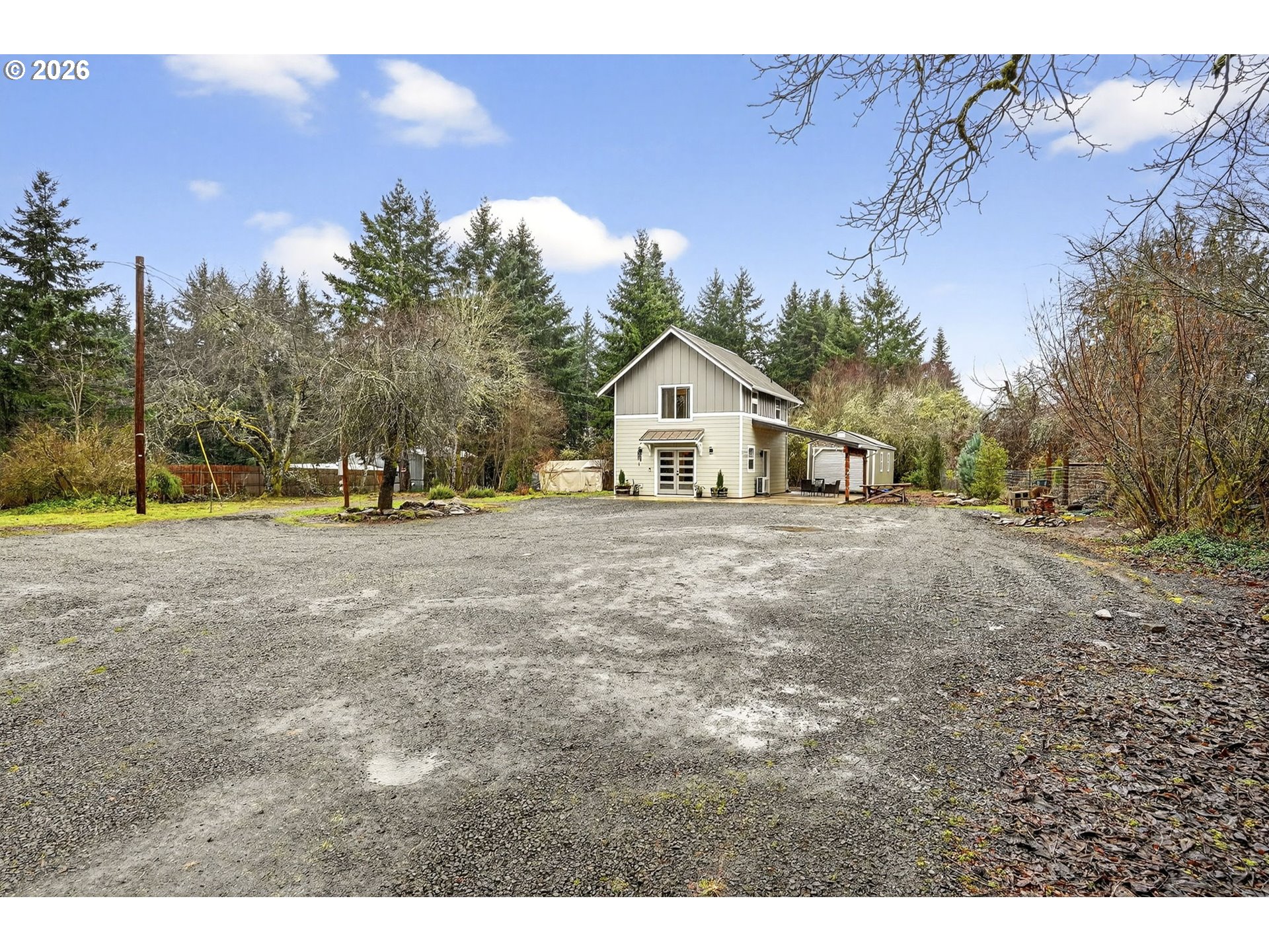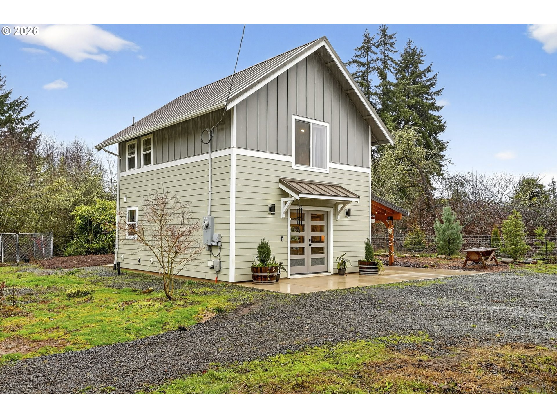 Set on nearly an acre of gated, private grounds with peaceful rural surroundings, this beautiful newly built home blends modern comfort, quality craftsmanship, and peaceful country living. The exterior features a durable metal roof, James Hardie fiber cement siding, and a high efficiency Daikin mini split system for year round heating and cooling. Inside, double entry doors open to a bright, open concept layout with wide plank engineered oak flooring and an inviting living space. The kitchen is well appointed with stainless steel appliances, including a Café by GE refrigerator, induction range, and microwave, along with quartz countertops and custom white oak cabinetry. The main level includes a laundry area with stainless LG washer and dryer and a half bath. Upstairs are two light filled bedrooms and a full bath with large format tile flooring. Recent upgrades include an expanded concrete patio with a beautifully built lean to covered area, creating an ideal space for summer entertaining, outdoor dining, and relaxing in the shade, along with a large tool shed and workshop just off the patio for added storage and workspace. Conveniently located with easy access to Highway 211, the home is approximately 30 minutes from Oregon City and 15 minutes from Molalla and Estacada for shopping and dining. This special property offers privacy, versatility, and quality construction in a setting that truly feels like home. Schedule your private tour today!
