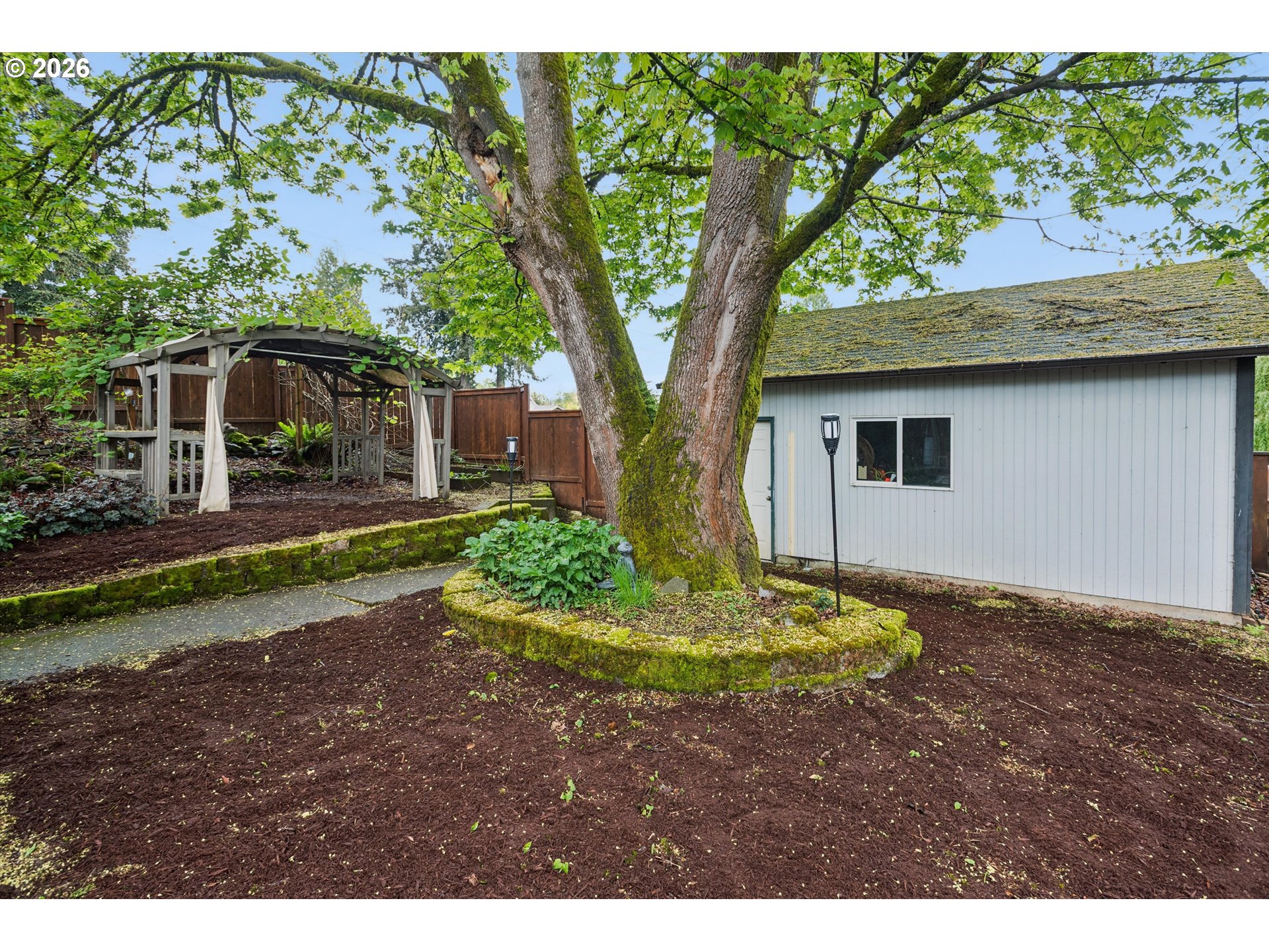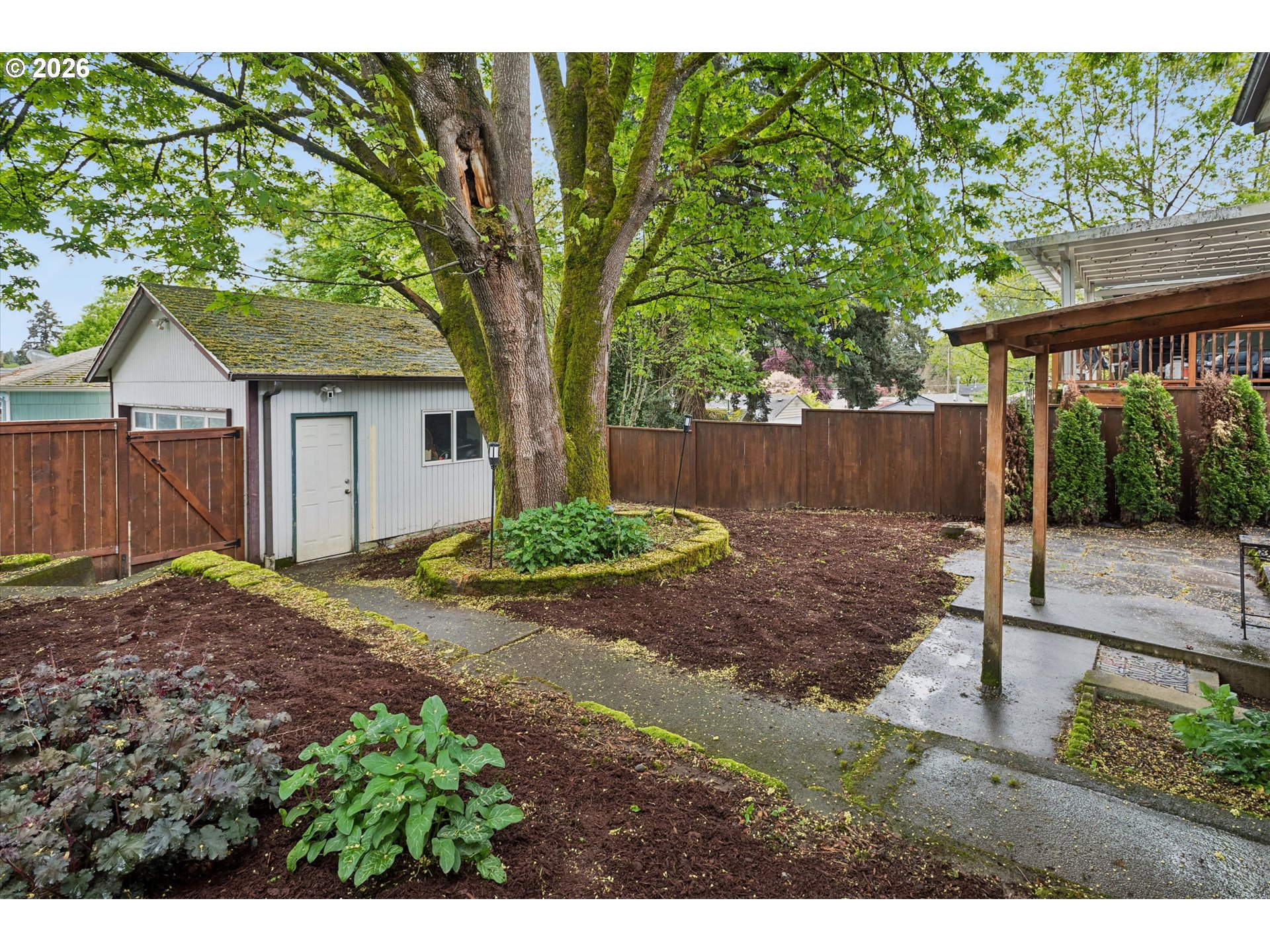 This artful home with a welcoming front porch offers the charm and flexibility you’ve been searching for. Situated on a spacious corner lot, the property features a fully fenced yard with a newly installed stained fence (2025), ample room to garden, and an abundance of plantings including pear trees, a kiwi vine, vegetable garden, and fragrant honeysuckle. Enjoy added privacy with newly planted arborvitae (2024) and relax on the stone patio—perfect for outdoor entertaining or quiet mornings. Additional exterior upgrades include gutter covers (2024) and maple tree branch stabilizing cables (2024).Inside, the home is filled with natural light and showcases thoughtful built-in features that add both character and functionality. The kitchen is well-appointed with stainless steel appliances, custom granite countertops, natural stone flooring, and a new refrigerator (2025). Recent system updates provide peace of mind, including a new hot water heater (2024) and radon mitigation system (2024), along with new ceiling fans (2025) for added comfort.Flexible living arrangements allow for a primary bedroom on either the main or lower level to suit your needs, while the lower level also includes a cozy fireplace. A detached two-car garage offers plenty of storage and convenience.Ideally located just a 1-minute walk to Century Park and about a 15-minute walk to downtown Milwaukie, where you can enjoy local favorites including the new Pfriem Brewery location, this home also provides easy access to the MAX line, farmers market, and nearby parks and trails such as Milwaukie Bay Riverfront Park. This property offers a wonderful blend of lifestyle, updates, and location. Mortgage savings may be available for buyers of this listing.
