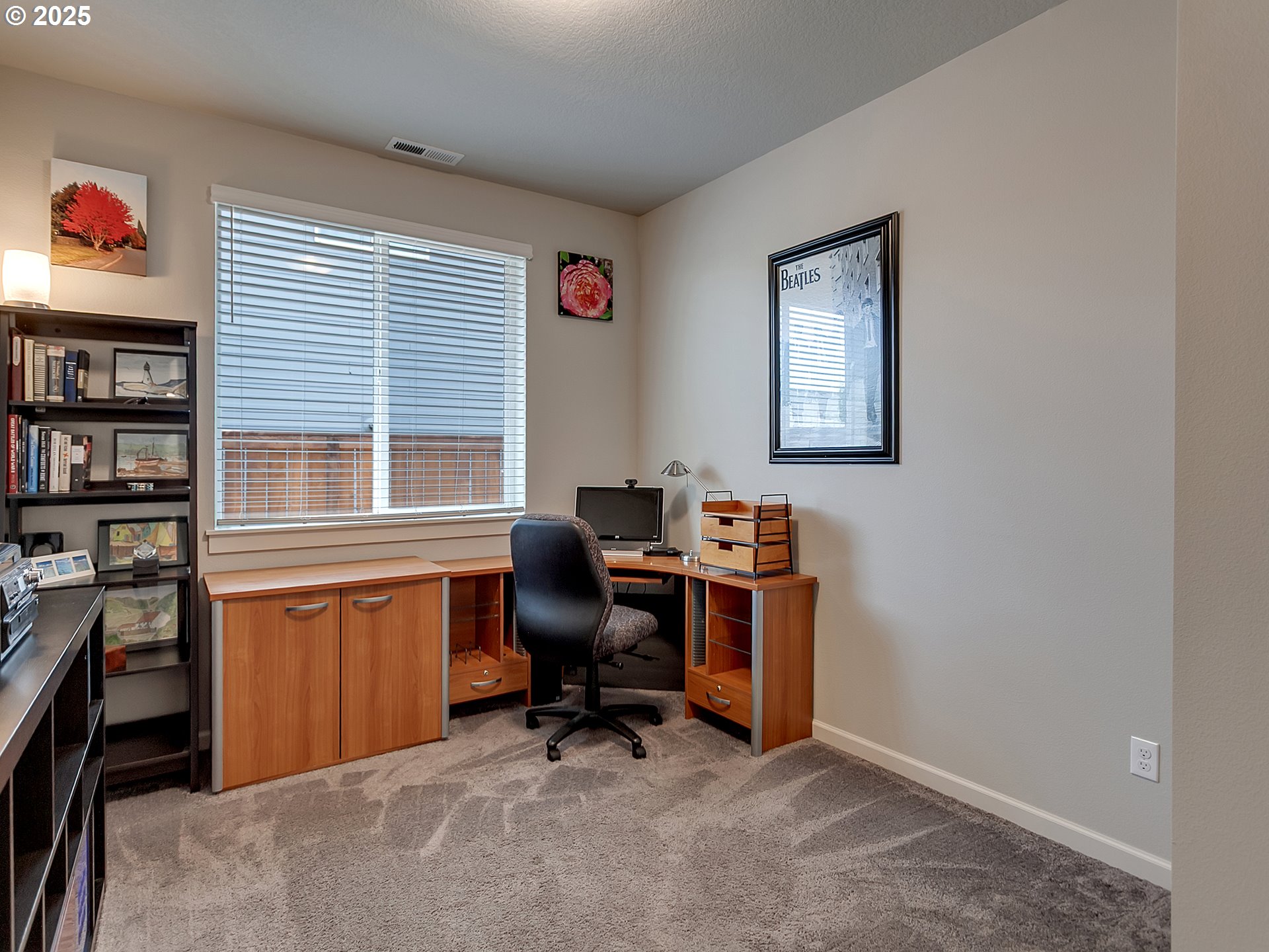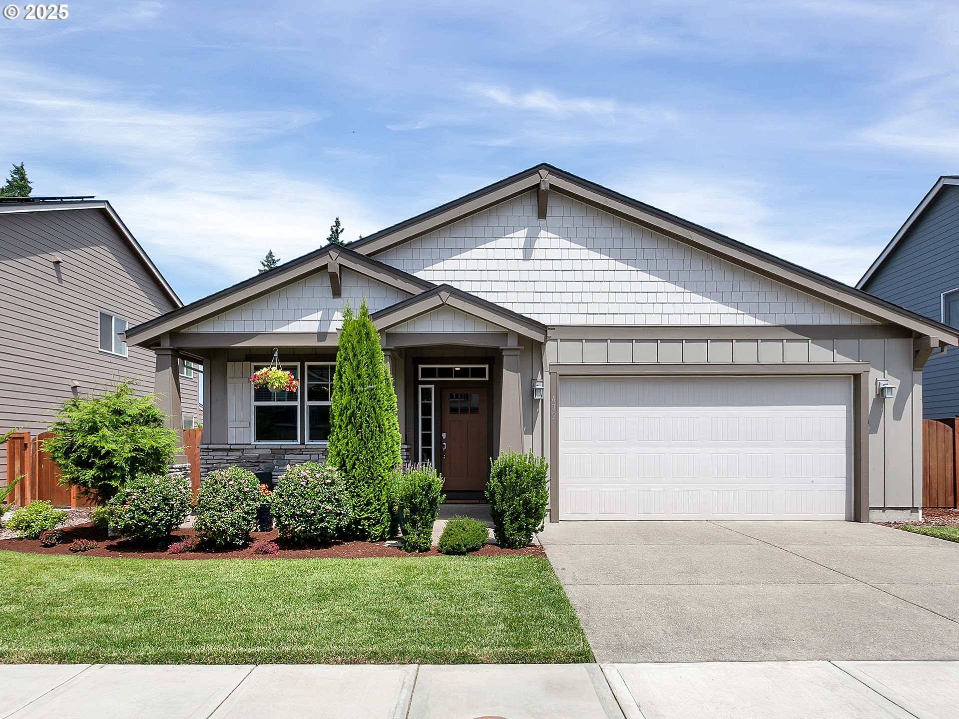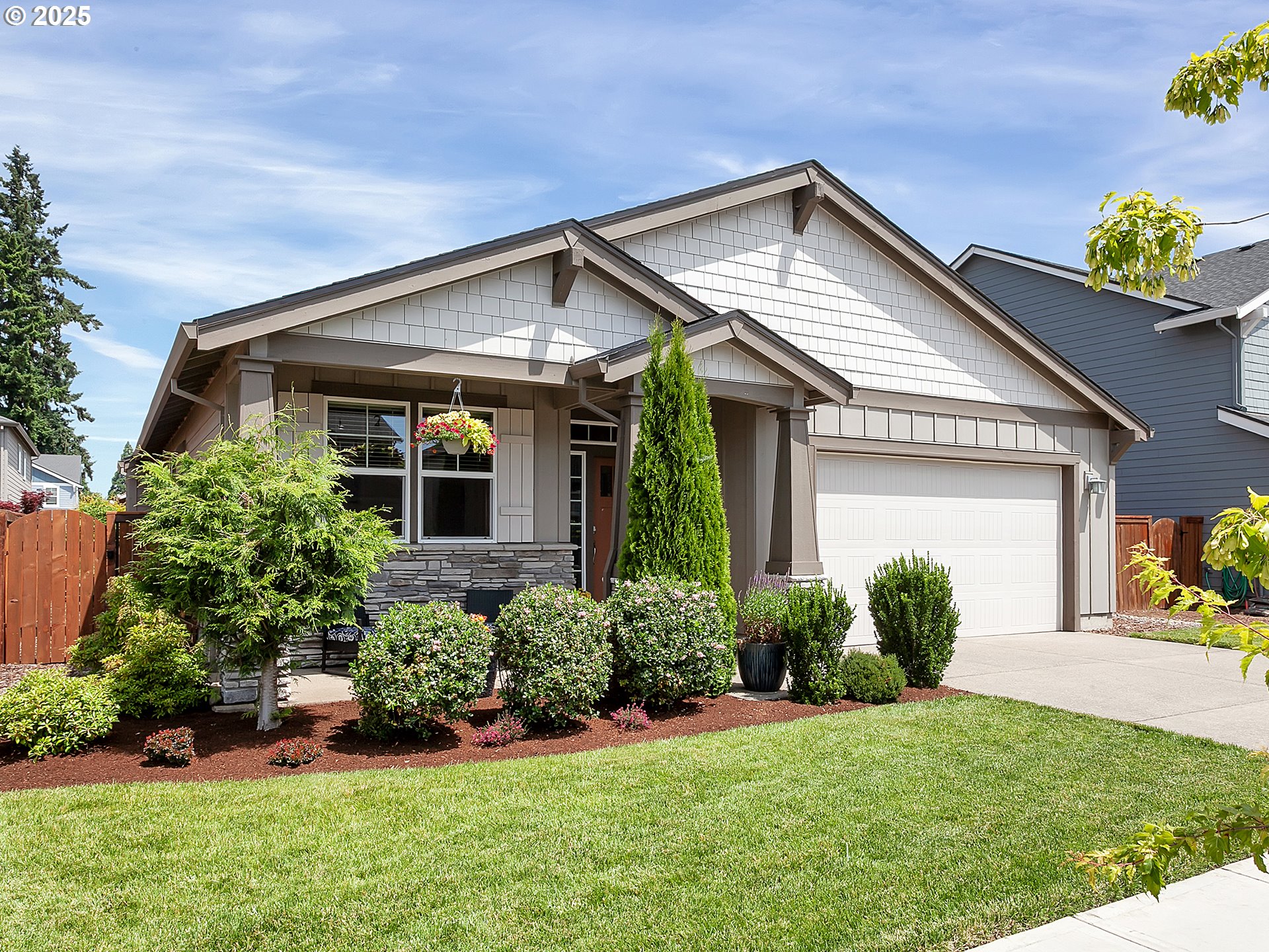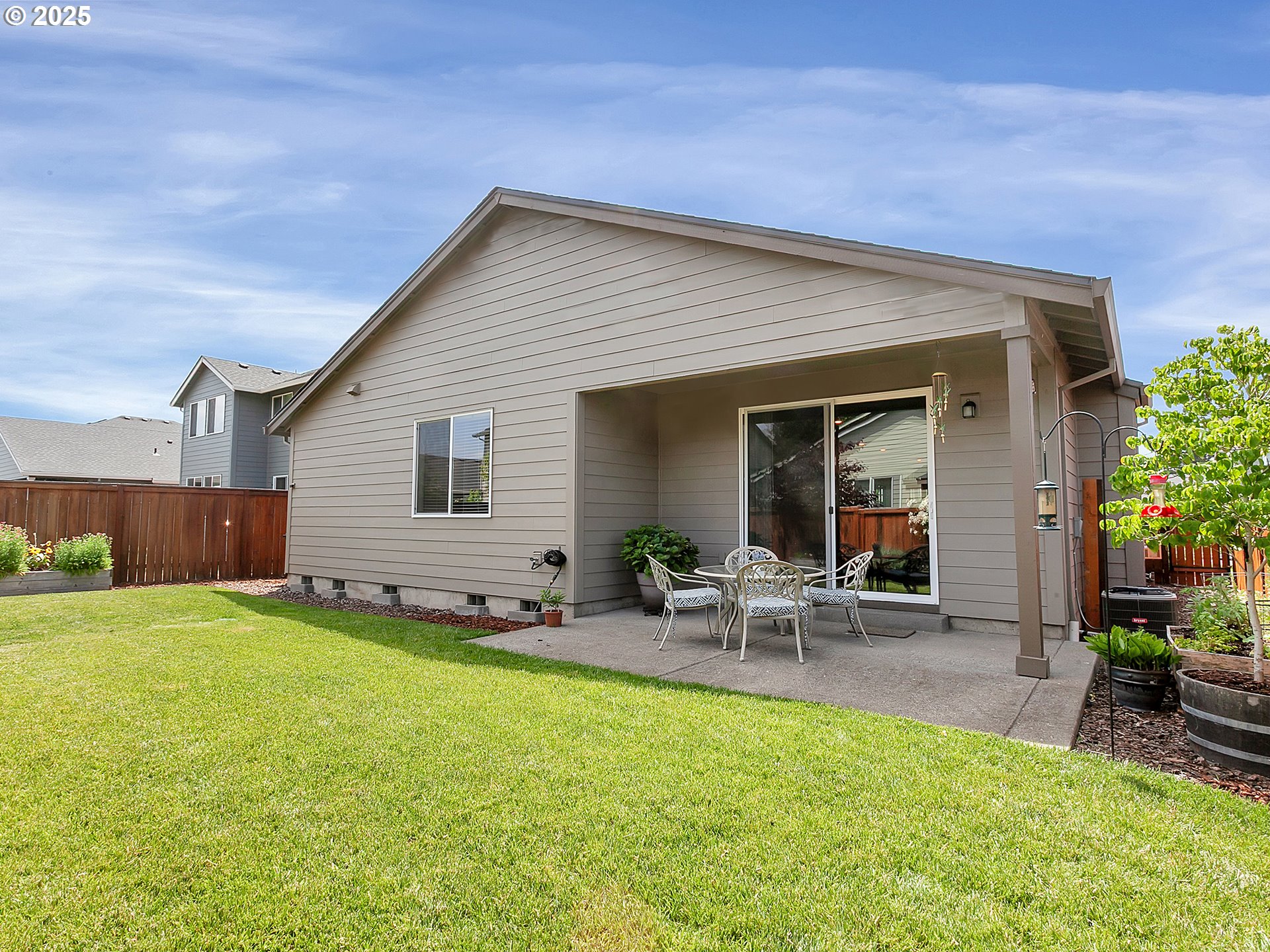 Open House Saturday 4/4, 10-12. Welcome to this newer, meticulously maintained one-level garden sanctuary. Easy living is yours in this thoughtfully designed floor plan. Enter through the front door to an open entryway with a double glass door office or studio — perfect for working or creating in peace and quiet. The hallway opens to a spacious kitchen, dining area, and living room, all in a large, open shared space. A glass slider door leads to your garden paradise with a patio, grassy area, and planters filled with established landscaping, flowers, and fresh herbs — ideal for hobby gardeners or chefs. Enjoy summer BBQs on the patio, gardening, or relaxing in the peaceful, private backyard while birdwatching. Three additional bedrooms await down the hallway, along with a full bathroom featuring a tub and shower, plus a laundry room with direct access to the two-car garage. At the end of the hall, overlooking the quiet backyard, is the primary suite with a walk-in closet, walk-in shower, and double vanity. Nestled in a newer neighborhood, this home is a perfect base for exploring all Canby and the surrounding area have to offer: the river, Canby Ferry, Historic Downtown Canby, shops, groceries, restaurants, and parks. Enjoy the fairs, rodeos, and concerts at the Clackamas County Fairgrounds this summer!