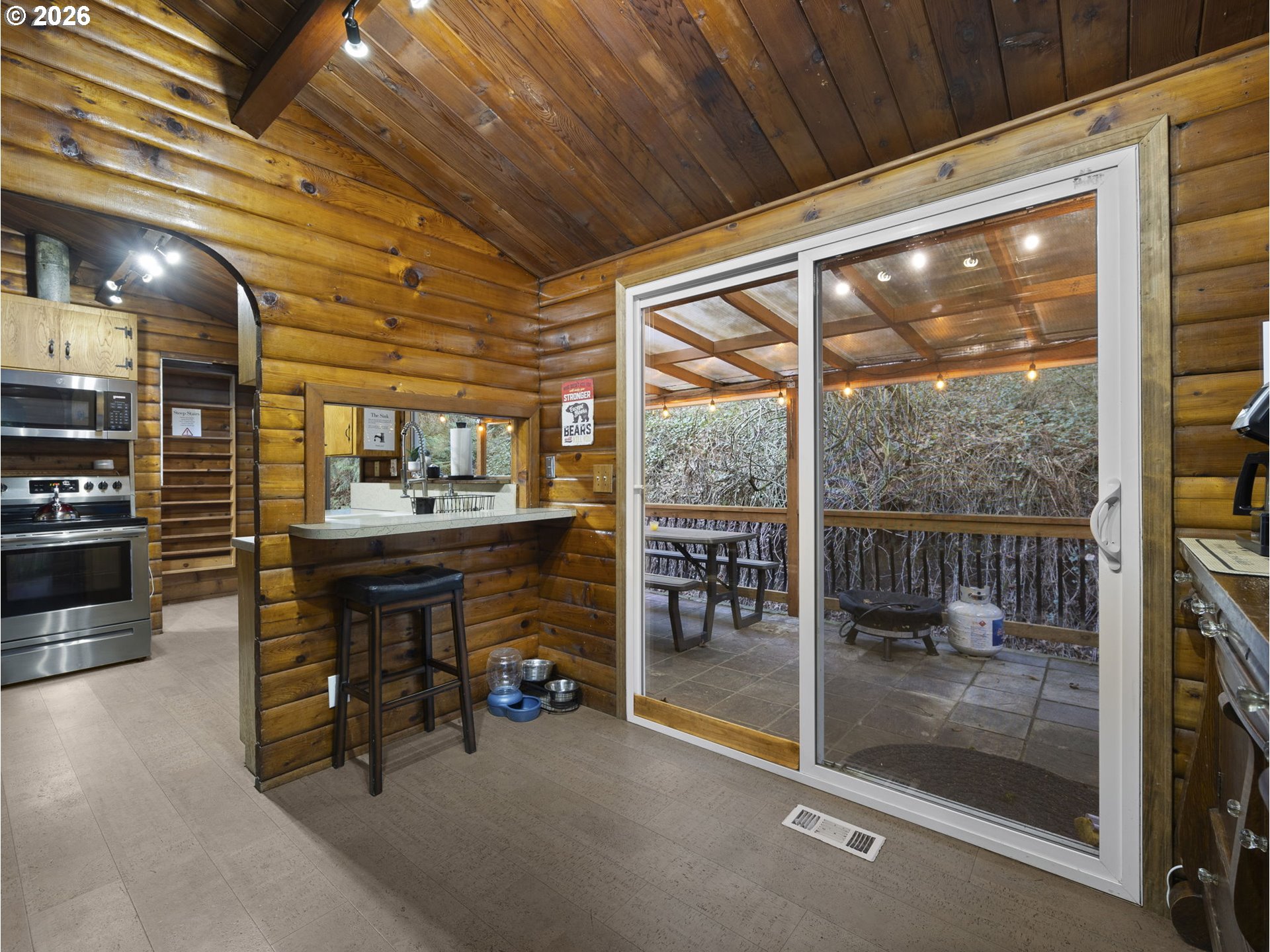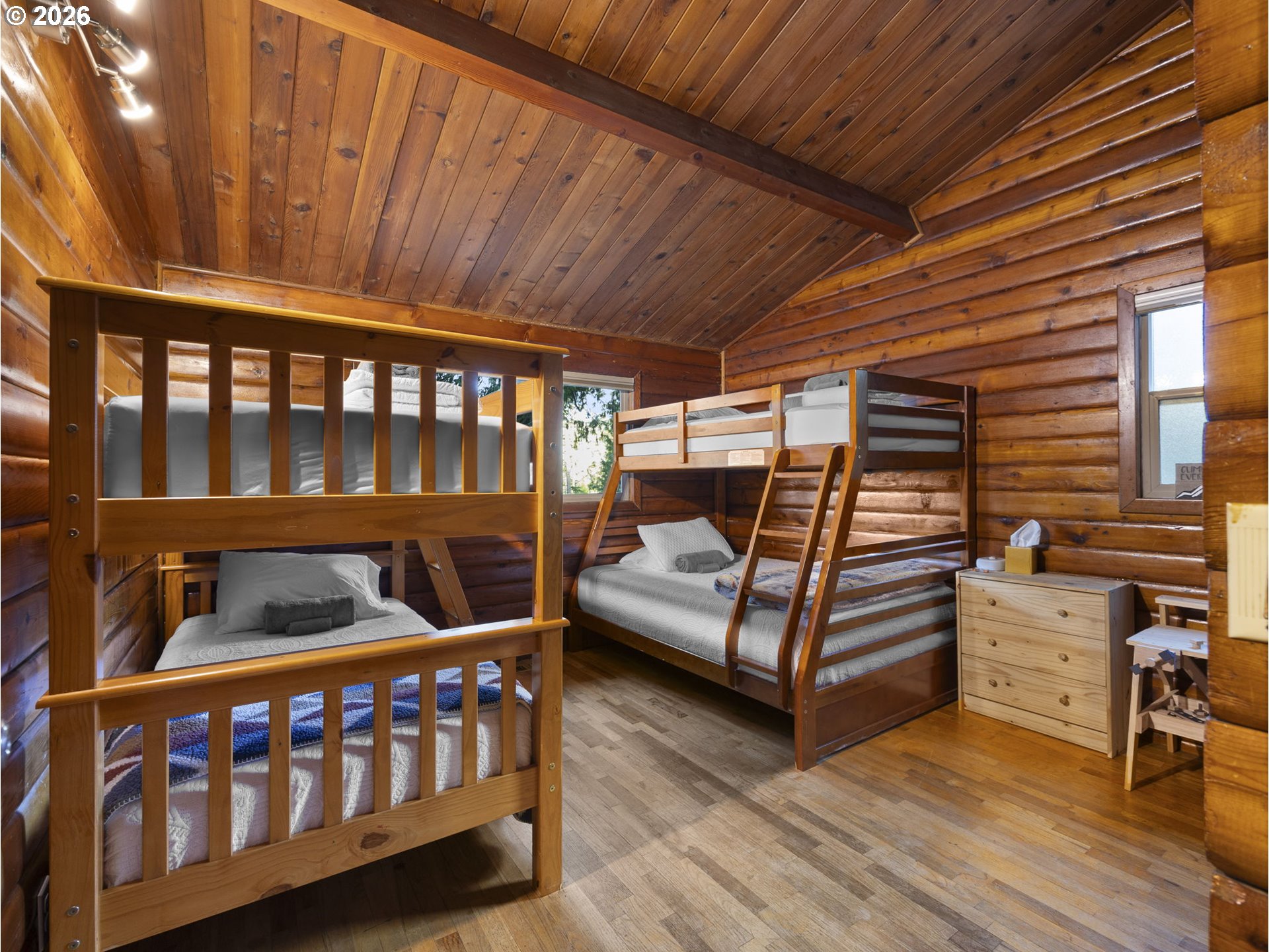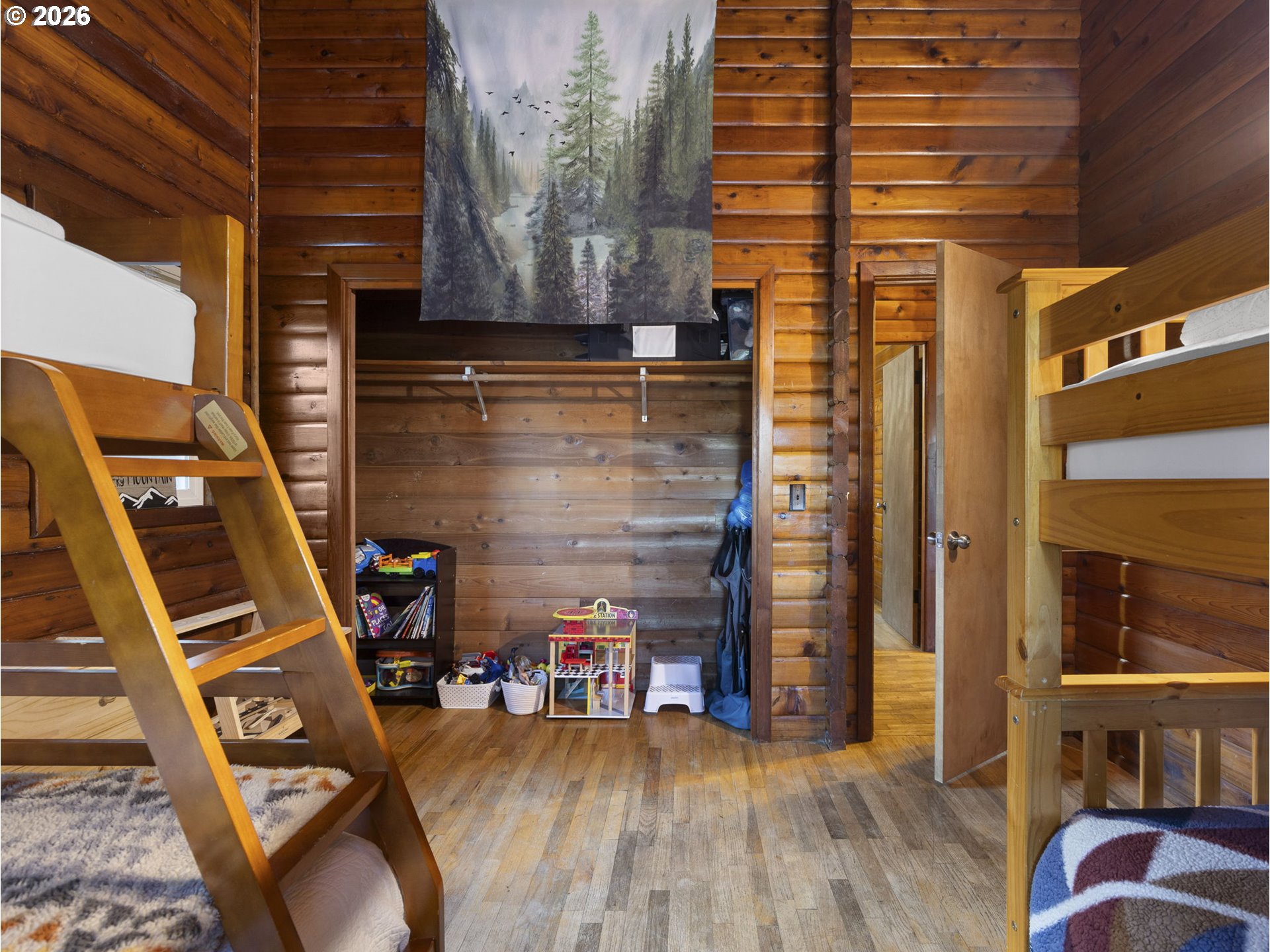 Inside this 4-bedroom, 2-bath home, nestled at the base of Mt. Hood, lives a beautiful log cabin with the complete mountain vibe boasting vaulted tongue n groove ceilings and open beams. The main level offers a large living room with fireplace insert, dining room with pellet stove, upgraded kitchen with access to the covered back deck, 3 bedrooms and 1 bathroom. The lower level has front and rear yard exterior access. Descending to the great room below from inside, you will find a large open family room with woodburning fireplace and game area as well as 4th bedroom, remodeled bathroom laundry/utility area door to the attached garage. Covered hot tub sits outside the rear door on the lower level for privacy. Quaint bridge off the upper back deck leads to the remainder of the acreage up the slope for a little extra adventure. New roof and HVAC system within the last 2 years!