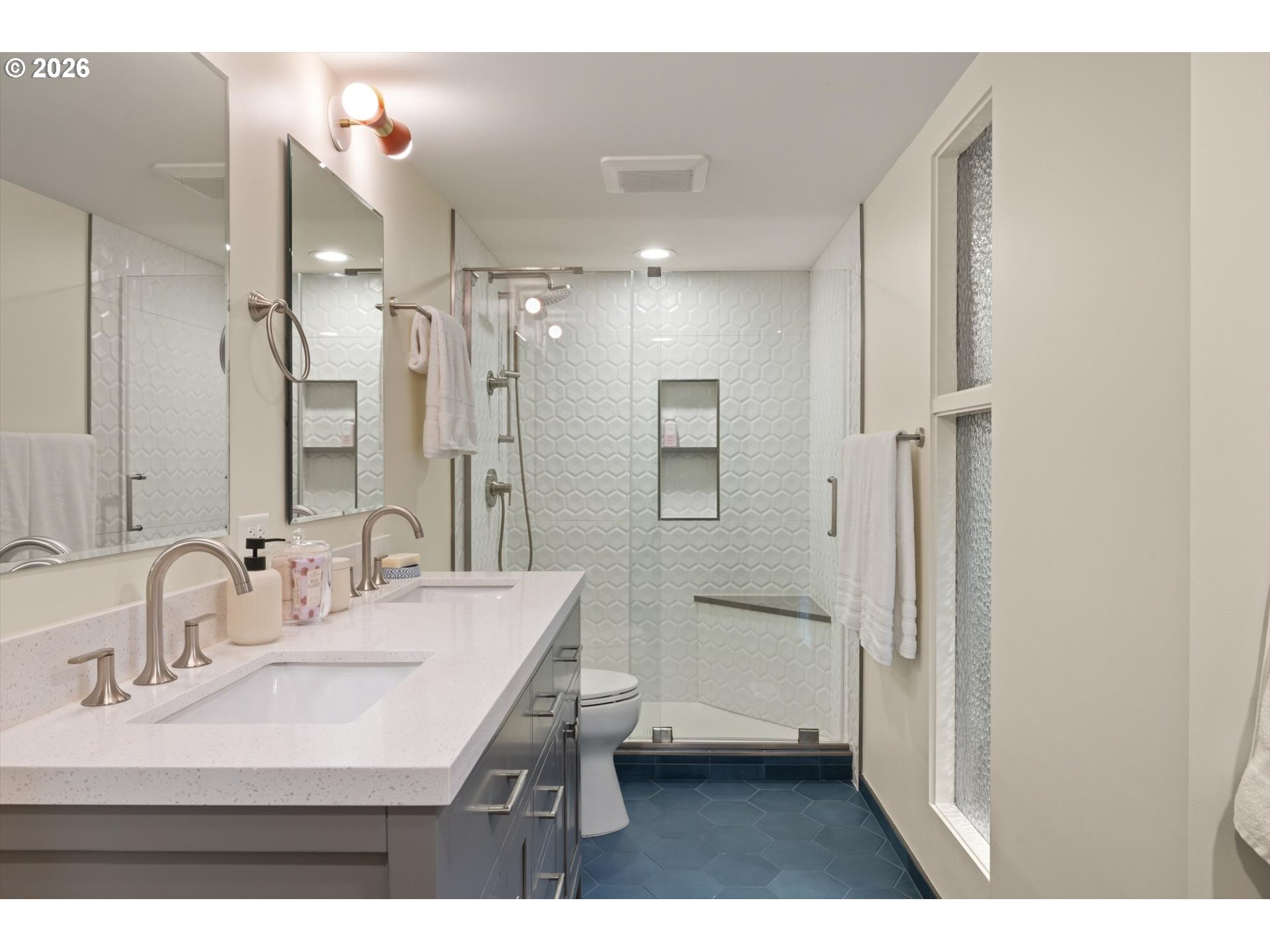 Mid-century retreat in prestigious Forest Highlands neighborhood. Tucked into a serene, tree-lined enclave just moments from Tryon Creek State Park, this 1962-built home offers the rare combination of architectural character, natural beauty, and meaningful system upgrades—creating an ideal canvas for your personal vision. Inside, classic mid-century design elements take center stage: soaring vaulted ceilings, exposed beams, and warm tongue-and-groove detailing that bring volume, texture, and timeless style. With 5 bedrooms, 3 full baths, and 4,146 square feet, the floor plan offers flexibility for a variety of living arrangements, creative spaces, or multi-generational needs. The heavy lifting has already been done. A meticulously maintained concrete tile roof, updated HVAC and water heater, electrical improvements, whole-house generator, updated water main, repaired sewer line, and refreshed front deck framing provide peace of mind—freeing you to focus on the design and style of the home. Separate exterior entrance to the lower level opens the door to a distinct living area—well-suited for multi-generational living, guest quarters, or flexible use depending on your needs. Wooded exteriors surrounding a calming back yard with apple, fig, pear and plum trees as well as producing blueberry bushes. Backing to protected greenspace within the Tryon Creek watershed, the property offers a tranquil, almost meditative connection to nature—yet remains just minutes from trailheads, bustling First Addition Lake Oswego, and top-rated Forest Hills Elementary School. Surrounded by luxury homes in one of the area’s most sought after neighborhoods, this is a rare opportunity to bring your vision to life in a setting that supports it. A compelling blend of location, architecture, and investment opportunity — ready for its next chapter.