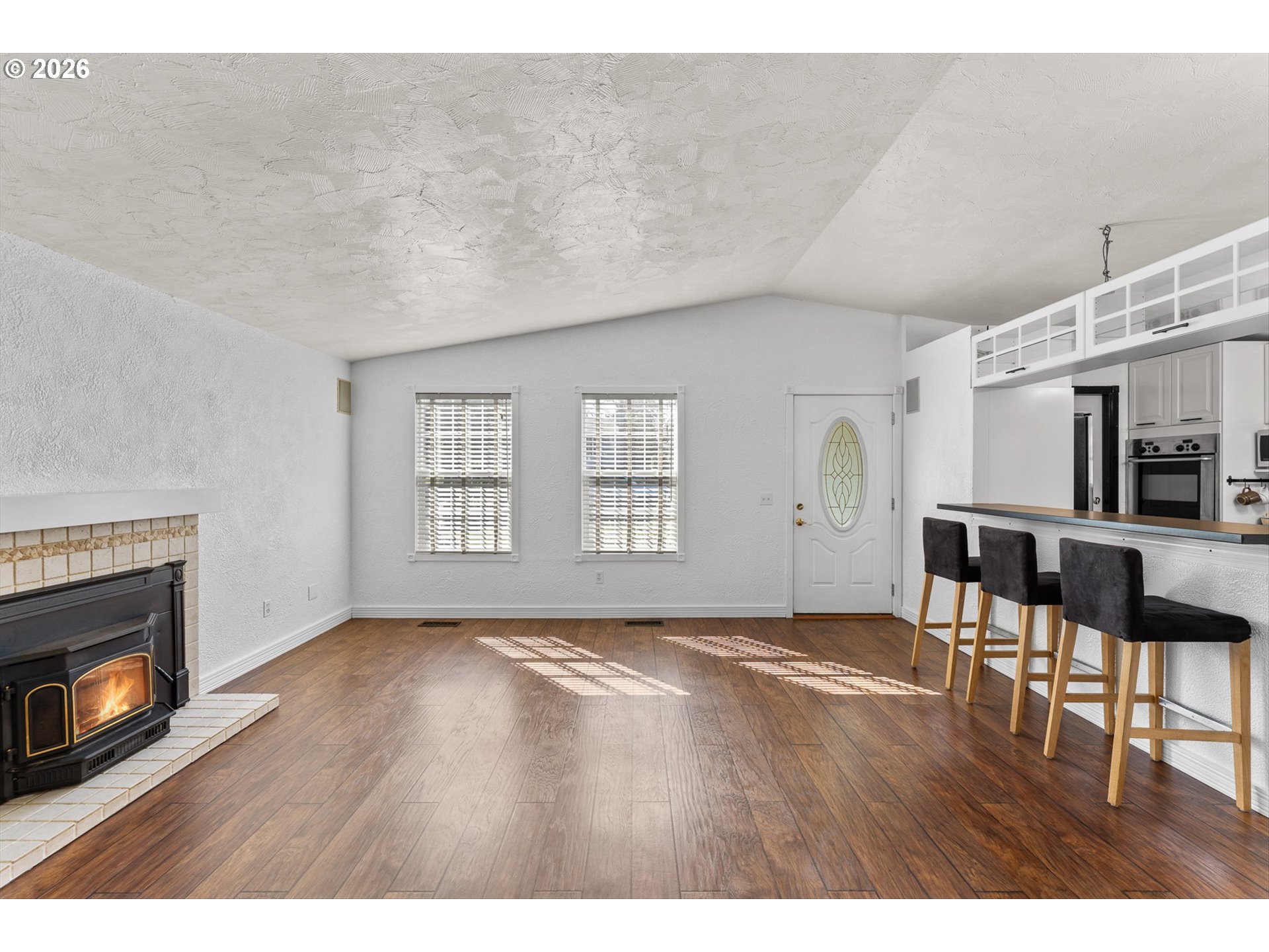 Single level living with south facing sunlight exposure and a serene entryway featuring a small pond and lots of space for gardening. Inside, a freshly painted interior, dark hardwood floors throughout, and an open living room with vaulted ceilings, a wood burning fireplace insert, and built-in surround sound speakers. The living room flows into an updated kitchen with an open peninsula, electric stove, built in dishwasher, and double ovens. Both bedrooms include built in storage and an updated bathroom. Outside, a fully fenced yard with a concrete patio perfect for a hot tub or outdoor seating, and a large sun filled lawn. Generous storage with an attached 2-car garage, large detached storage shed, and RV or boat parking. A strong investment opportunity in a sought after Milwaukie neighborhood.