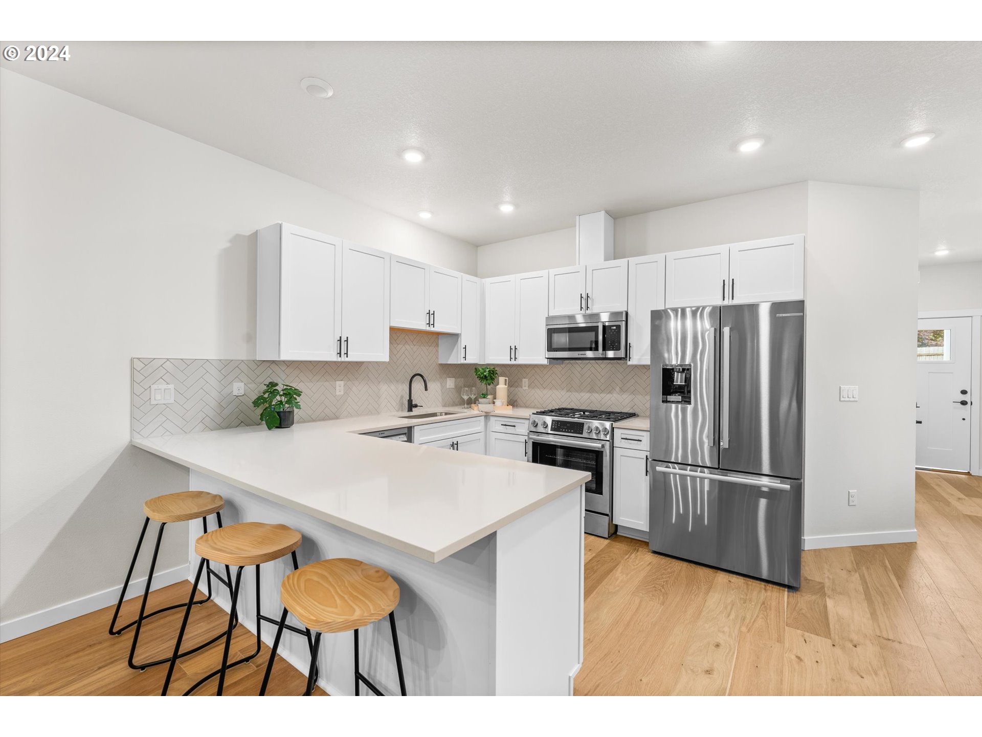 This newly completed 3-bedroom, 2.5-bath home offers approximately 1,700 sq. ft. of thoughtfully designed living space in a desirable Milwaukie setting. Interior finishes include quartz countertops, luxury vinyl plank flooring, tile accents, and timeless shaker-style cabinetry. The open-concept main level is warmed by a gas fireplace and filled with natural light, creating an inviting and functional layout. Enjoy outdoor living on the private deck overlooking peaceful green space—ideal for relaxing or entertaining. Not your typical condo, with low HOA dues and minimal HOA involvement, offering the benefits of a well-maintained community without excessive restrictions.