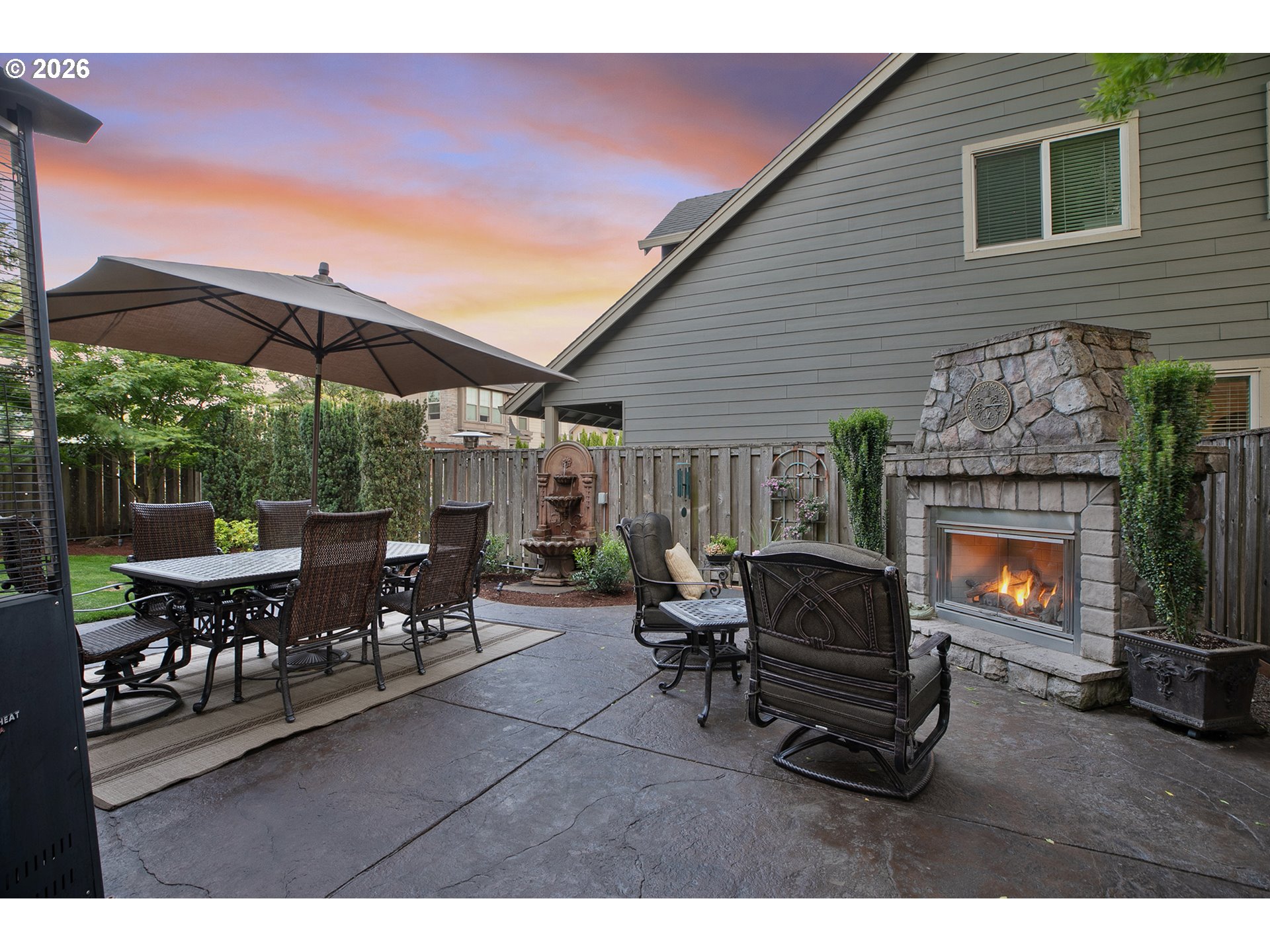 CoveredPatio, Fenced, GasHookup, OutdoorFireplace, Patio, Sprinkler, WaterFeature, Yard
