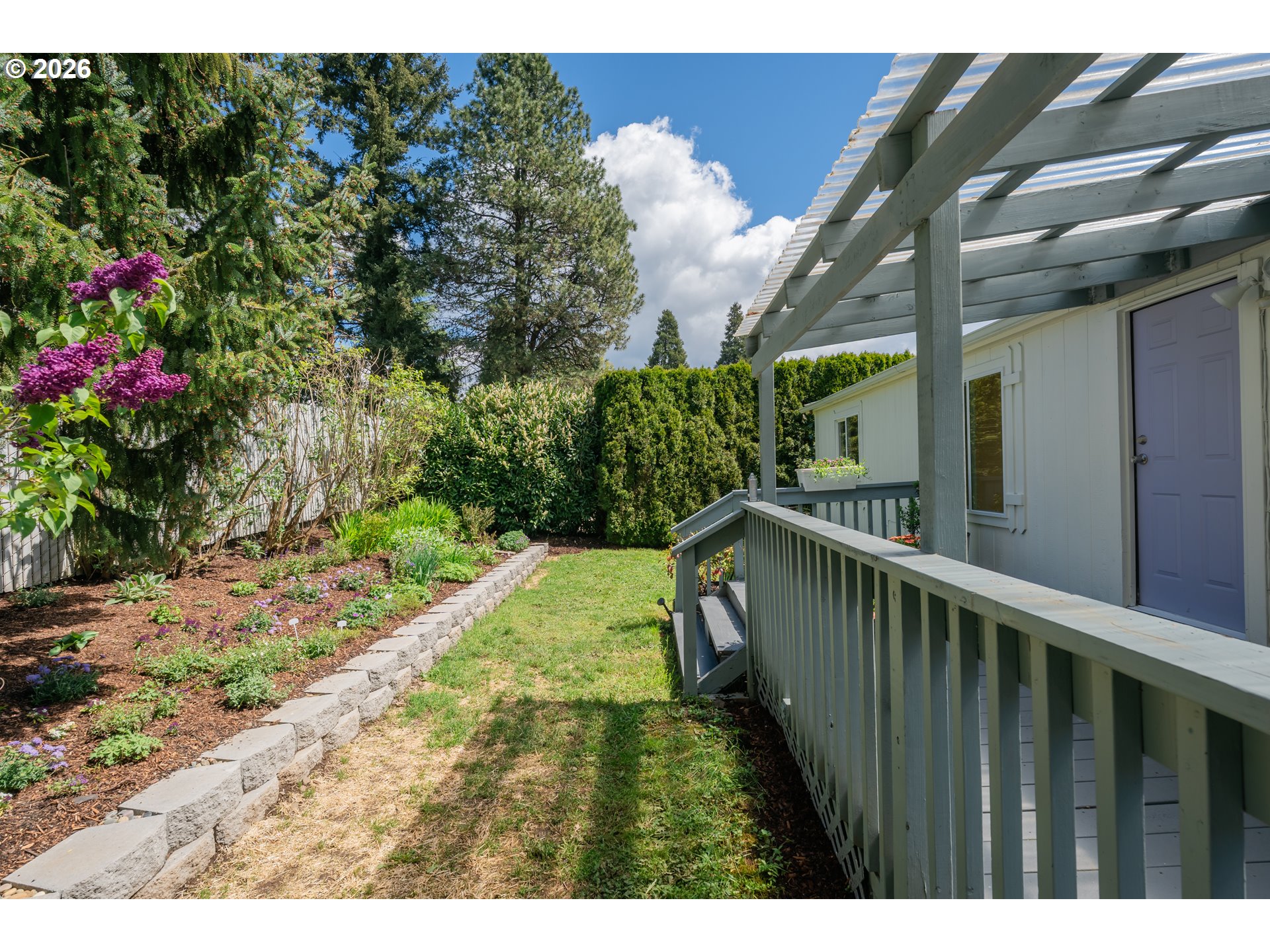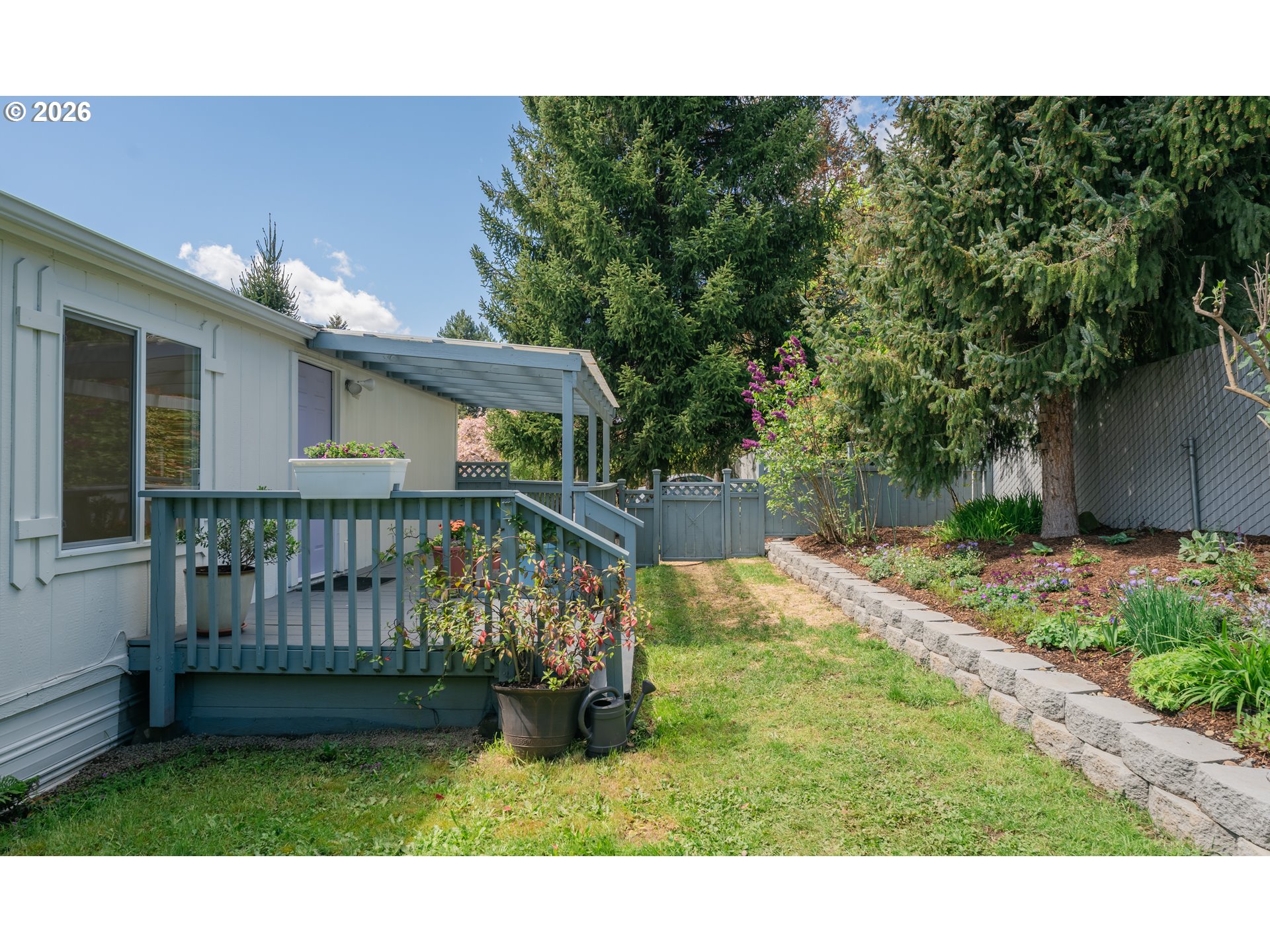 This 3bdrm/2bath manufactured home has one of the best spots in the entire park! This move-in ready home has been meticulously maintained and has new top-of-the-line pex plumbing and a newer Smart System HVAC that offers efficient heating & cooling. This home is light and bright and feels so spacious with it's vaulted ceilings and 2 skylights. The primary bedroom has a vaulted ceiling, a walk-in closet and ensuite bath with dual sinks. Two other bedrooms and a second full bath give you plenty of space. Outside there is a nice deck to relax or enjoy your morning coffee in your fenced private backyard while enjoying your own private little oasis. The beautiful yard is a gardener's paradise and features a brand new retaining wall with freshly planted flowers like sweet alyssum, star jasmine, peonies, beautiful ferns, pink lilac trees, butterfly bushes, skip laurels, and many other established perennials and shrubs for spring through summer enjoyment.