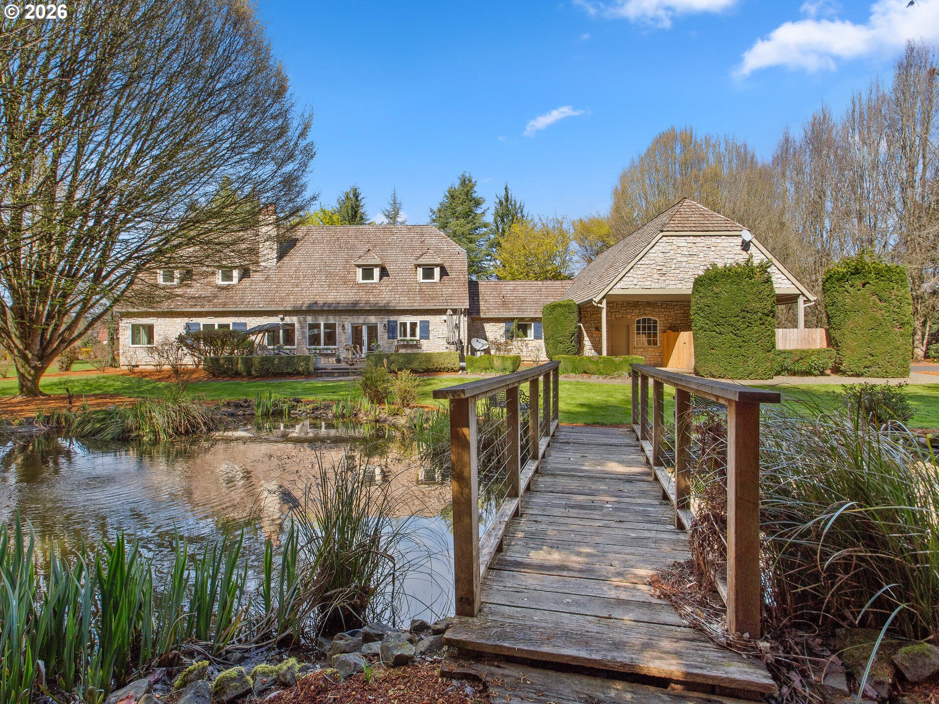 Step into an incredible lifestyle where luxury blends with timeless charm on 2.38 acres within a gated community in the sought-after Westminster neighborhood! Quality shines through with beautiful stone exterior, a classic cedar roof, and elegant solid wood doors with black iron hardware built beautifully to last! Inside you'll be immediately captivated by the soaring exposed beams, hardwood floors and three incredible Italian stone fireplaces. The gourmet kitchen is an entertainer's dream with a fantastic island, dual farmhouse sinks, limestone counters and a gas stove. The main-level primary suite is your personal sanctuary, featuring a spa-like ensuite and a massive walk-in closet. Upstairs this home offers a second primary suite or bonus room and two additional welcoming bedrooms sharing a convenient Jack-and-Jill bathroom and ample storage throughout. Outdoors explore paver patios and inviting walkways that wind through the landscaped grounds leading you across a charming walking bridge over the tranquil KOI pond. Fire up the grill at your dedicated BBQ area and let the kids explore the outdoor playhouse. Don't miss your opportunity to own this lovely home! Schedule your showing today!