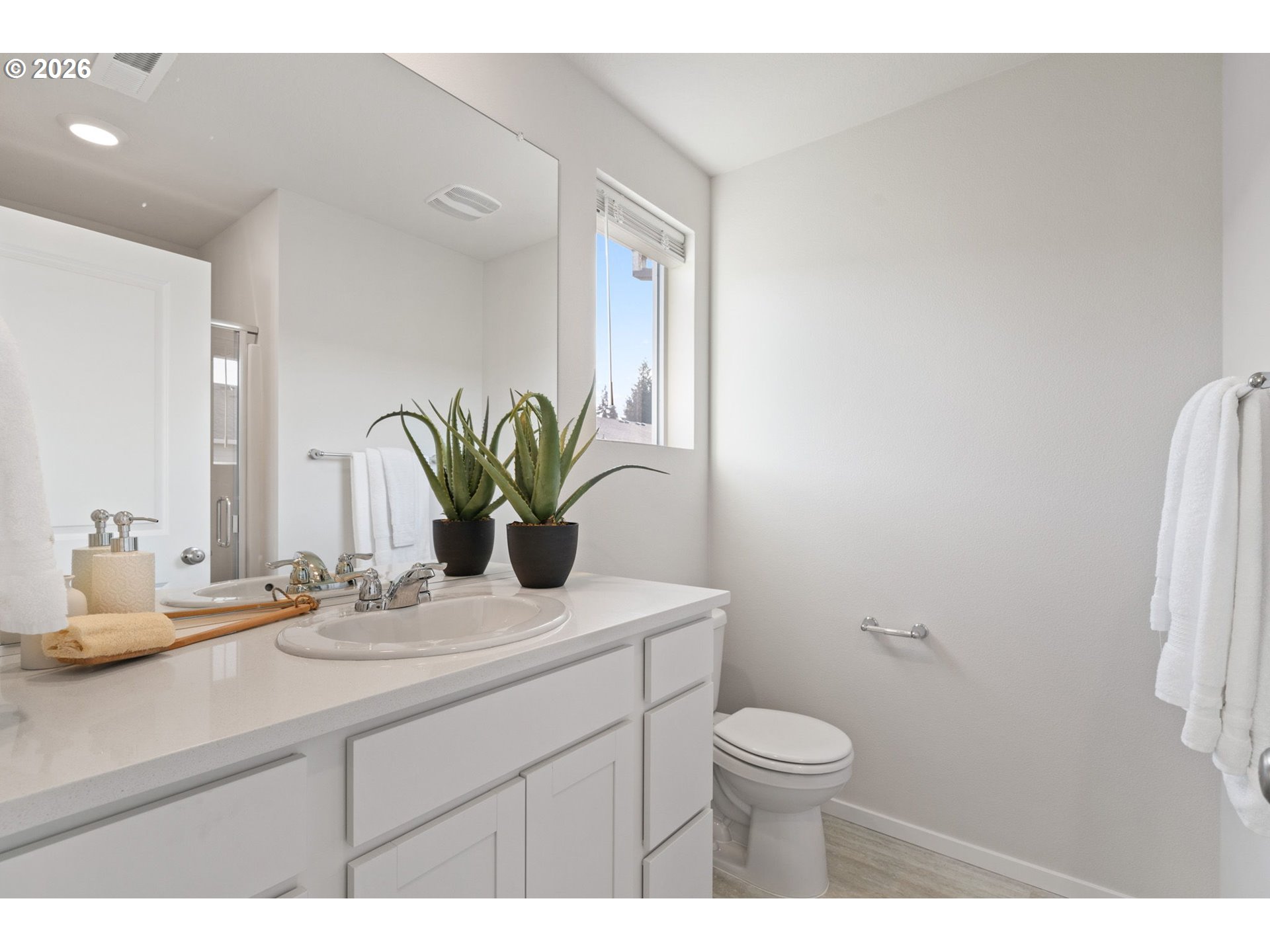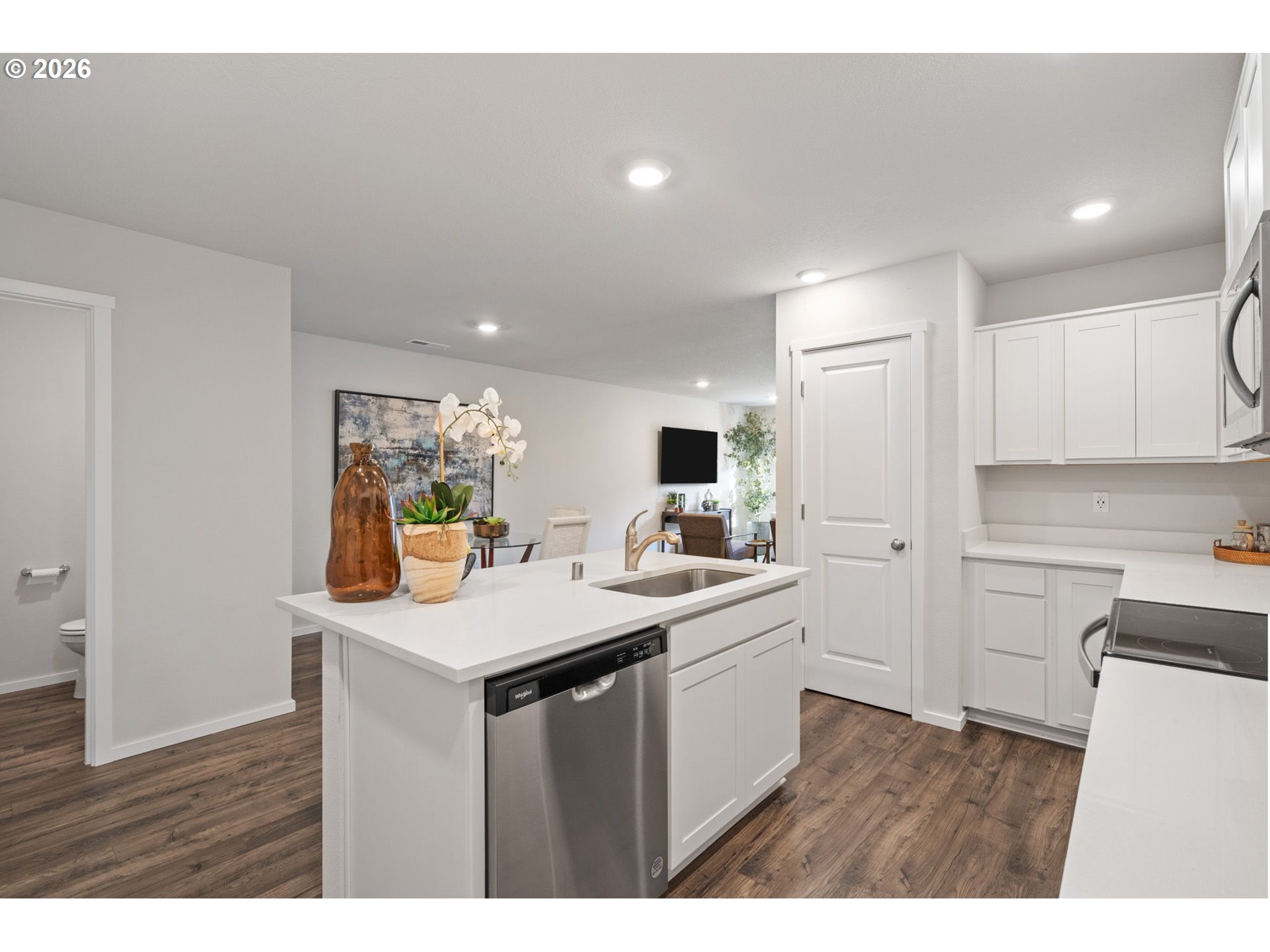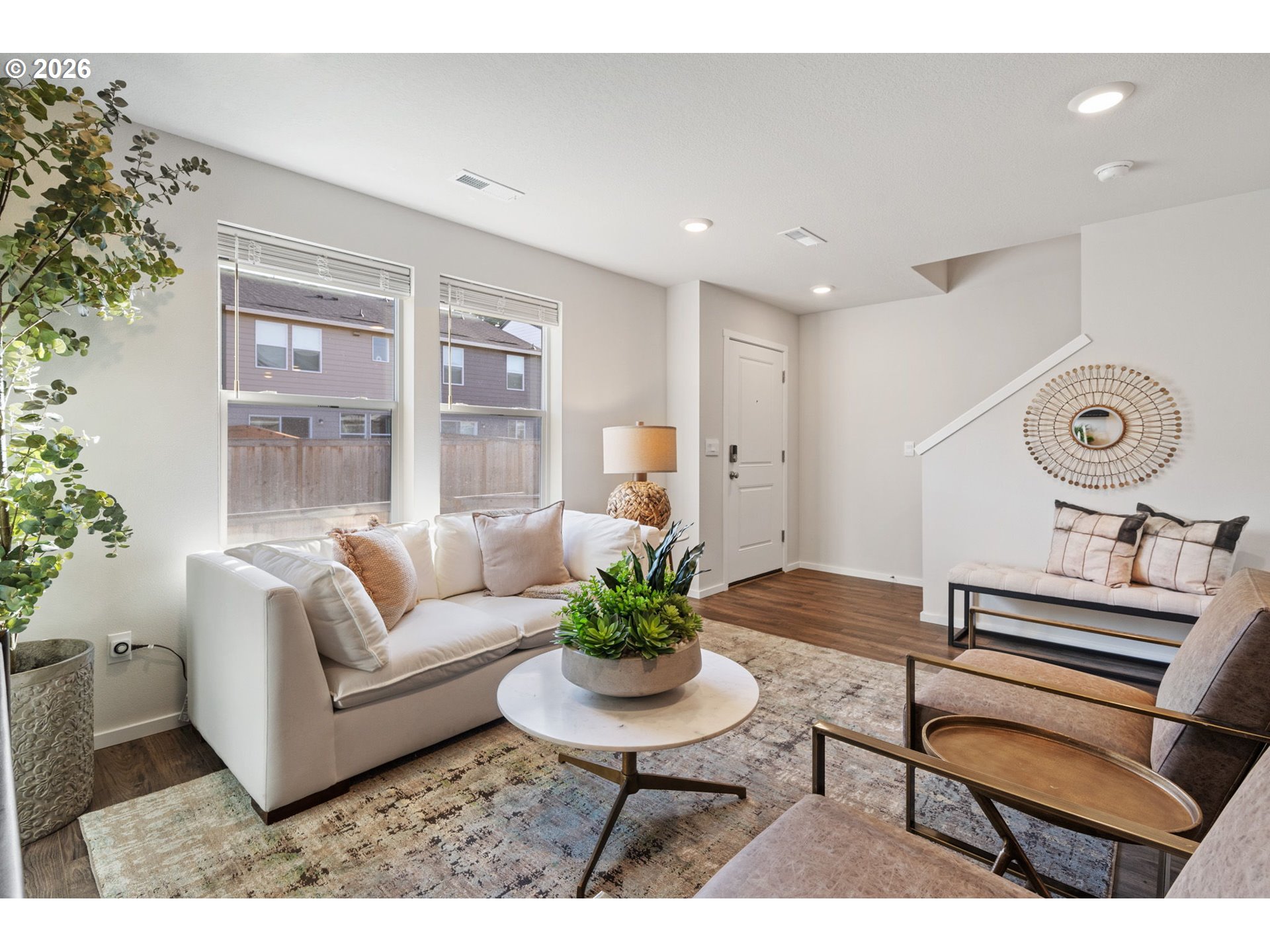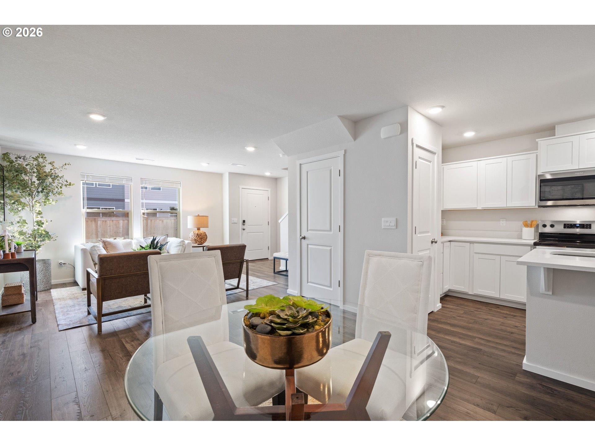 Welcome home to this beautifully designed townhome offering 1,434 square feet of thoughtfully planned living space, complete with 3 bedrooms, 2.5 bathrooms, and an attached 2-car garage. A winding, green-scaped pathway leads you to a charming, fenced front yard with low-maintenance irrigated landscaping—cute, clean, and carefree year-round. Inside, the bright open-concept main floor is made for both everyday living and easy entertaining. The modern kitchen shines with quartz countertops, shaker-style cabinetry, stainless-steel appliances, and island that anchors the space beautifully. Upstairs, a versatile tech nook provides the perfect work-from-home or homework station, while a full laundry room keeps life organized. Two spacious secondary bedrooms share a well-appointed hall bath, while the private primary suite is thoughtfully separated at the opposite end of the floor—complete with two closets and ensuite bath for your own personal retreat. Ideally located for commuters, enjoy quick access to I-205 and SR-500 for easy travel to Portland, PDX, and downtown Vancouver. Just minutes away are Fred Meyer, Costco, and a variety of dining and shopping options. Around the corner, Dogwood Neighborhood Park offers walking paths and mature trees, while the community itself features a playground and basketball court for added recreation.