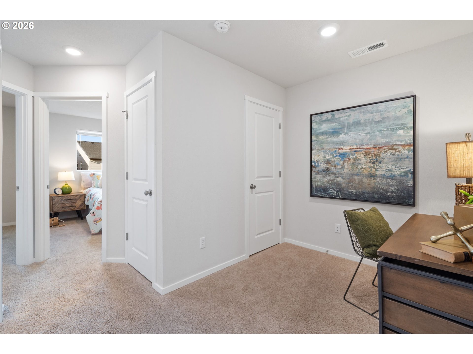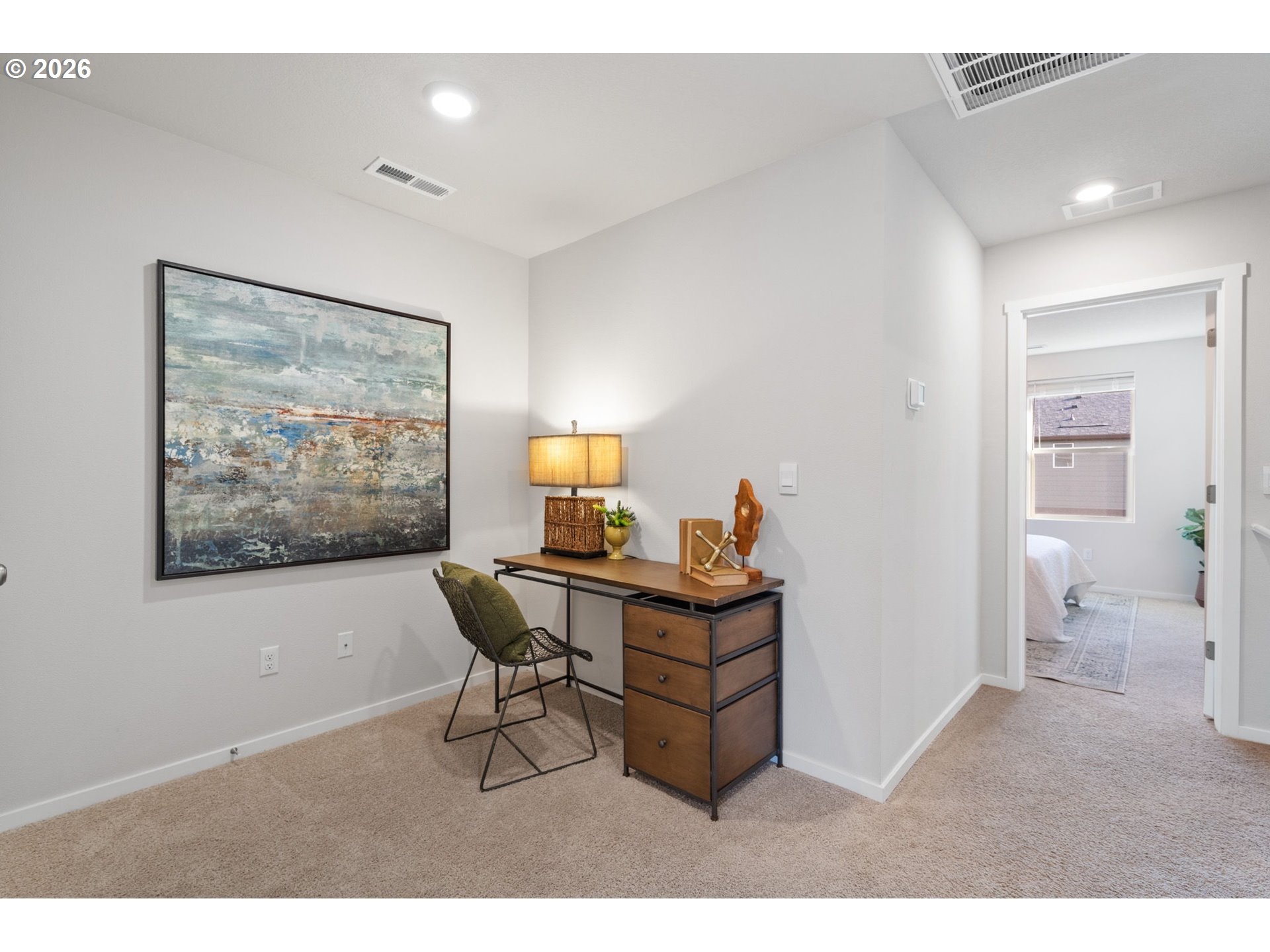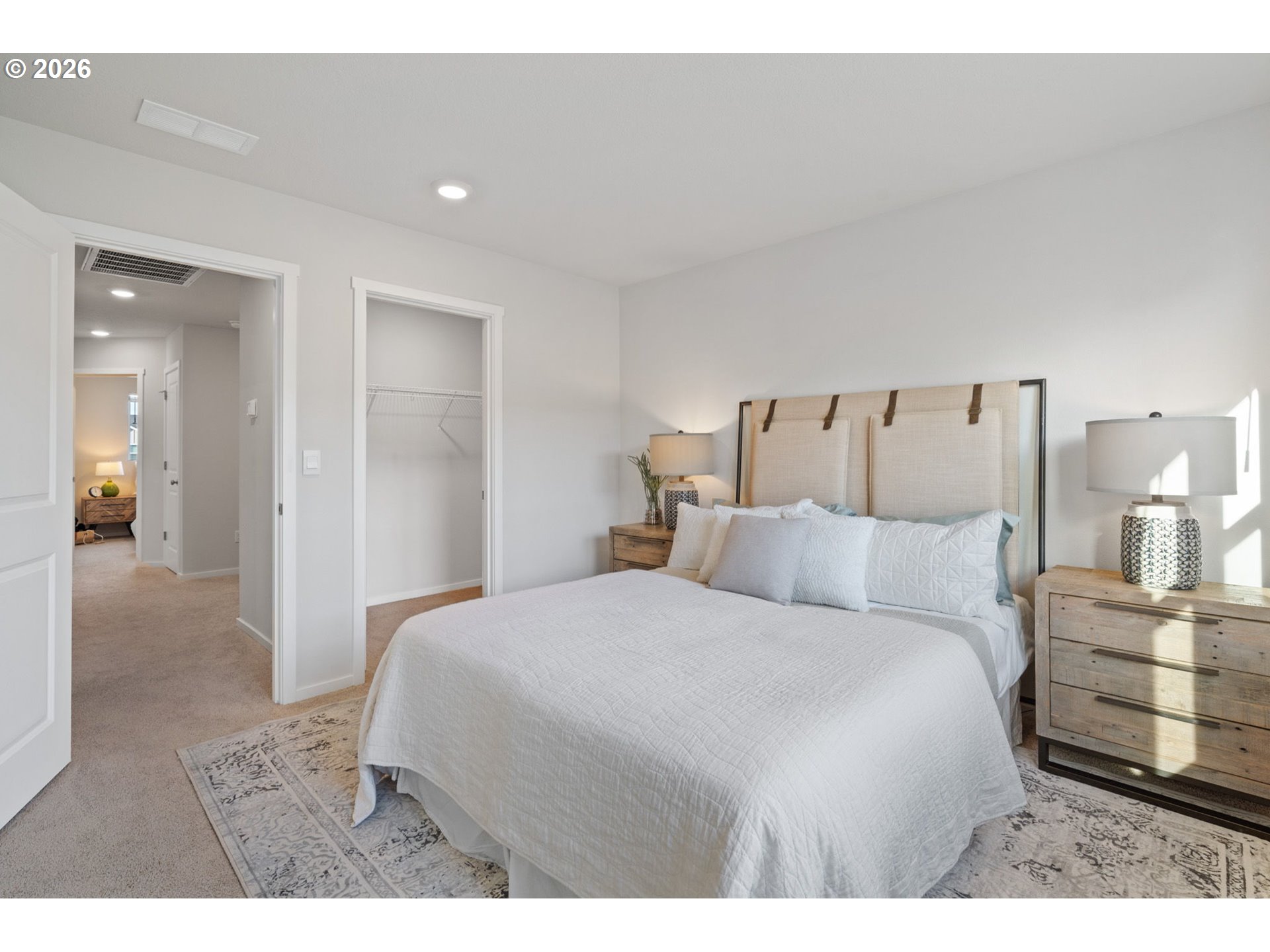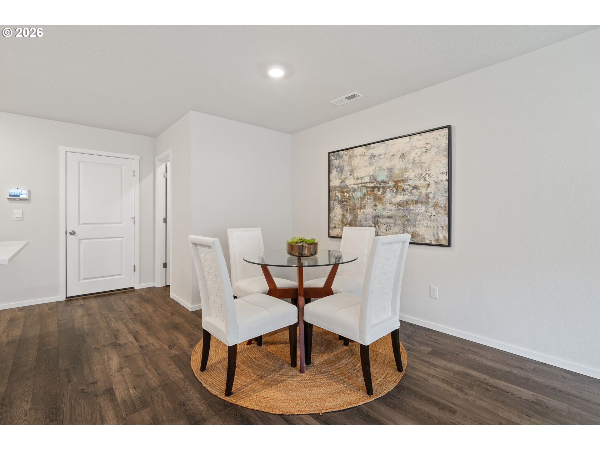 Welcome home to this beautifully designed townhome offering 1,434 square feet of thoughtfully planned living space, complete with 3 bedrooms, 2.5 bathrooms, and an attached 2-car garage. A winding, green-scaped pathway leads you to a charming, fenced front yard with low-maintenance irrigated landscaping—cute, clean, and carefree year-round. Inside, the bright open-concept main floor is made for both everyday living and easy entertaining. The modern kitchen shines with quartz countertops, shaker-style cabinetry, stainless-steel appliances, and island that anchors the space beautifully. Upstairs, a versatile tech nook provides the perfect work-from-home or homework station, while a full laundry room keeps life organized. Two spacious secondary bedrooms share a well-appointed hall bath, while the private primary suite is thoughtfully separated at the opposite end of the floor—complete with two closets and ensuite bath for your own personal retreat. Ideally located for commuters, enjoy quick access to I-205 and SR-500 for easy travel to Portland, PDX, and downtown Vancouver. Just minutes away are Fred Meyer, Costco, and a variety of dining and shopping options. Around the corner, Dogwood Neighborhood Park offers walking paths and mature trees, while the community itself features a playground and basketball court for added recreation.