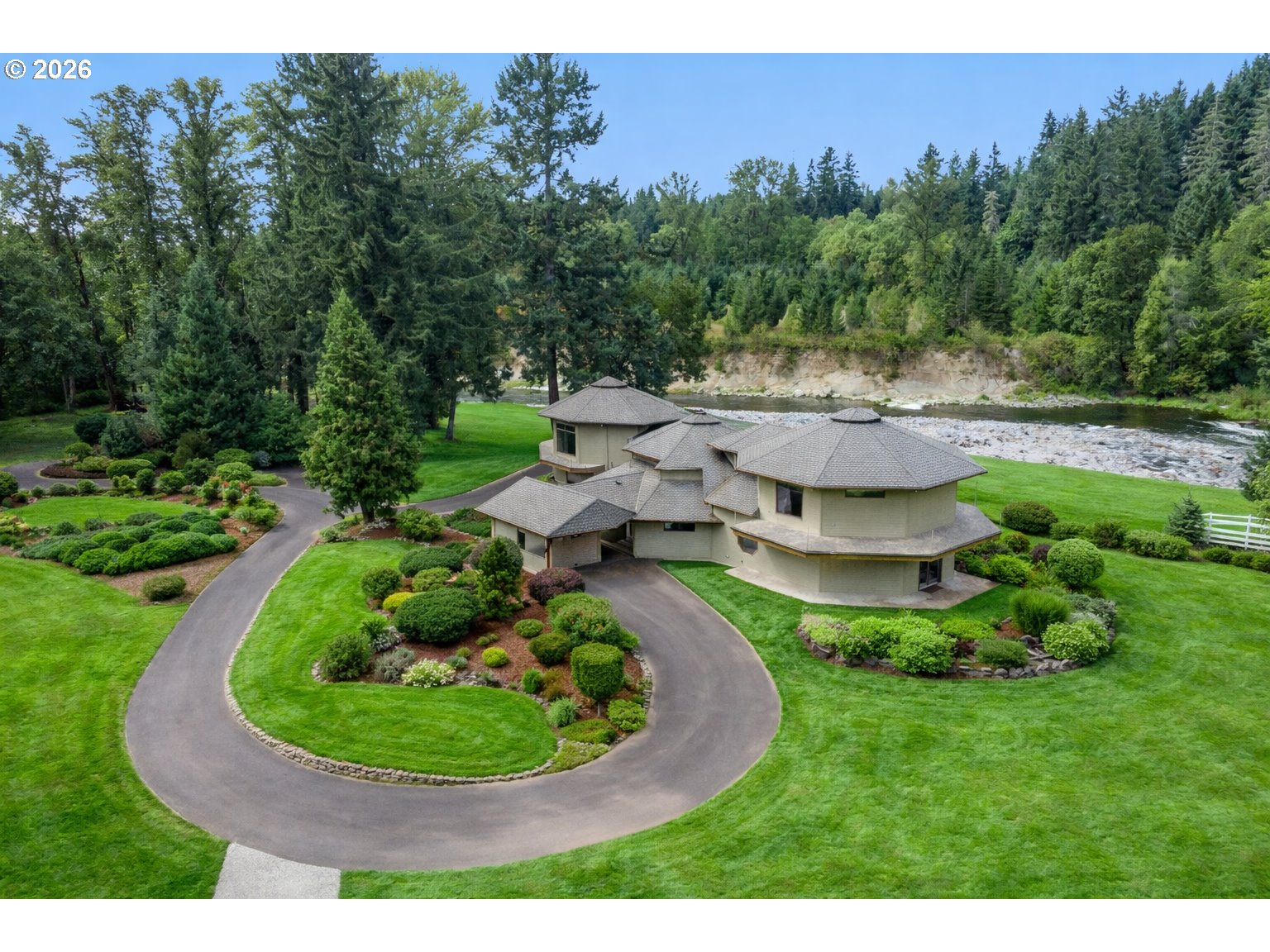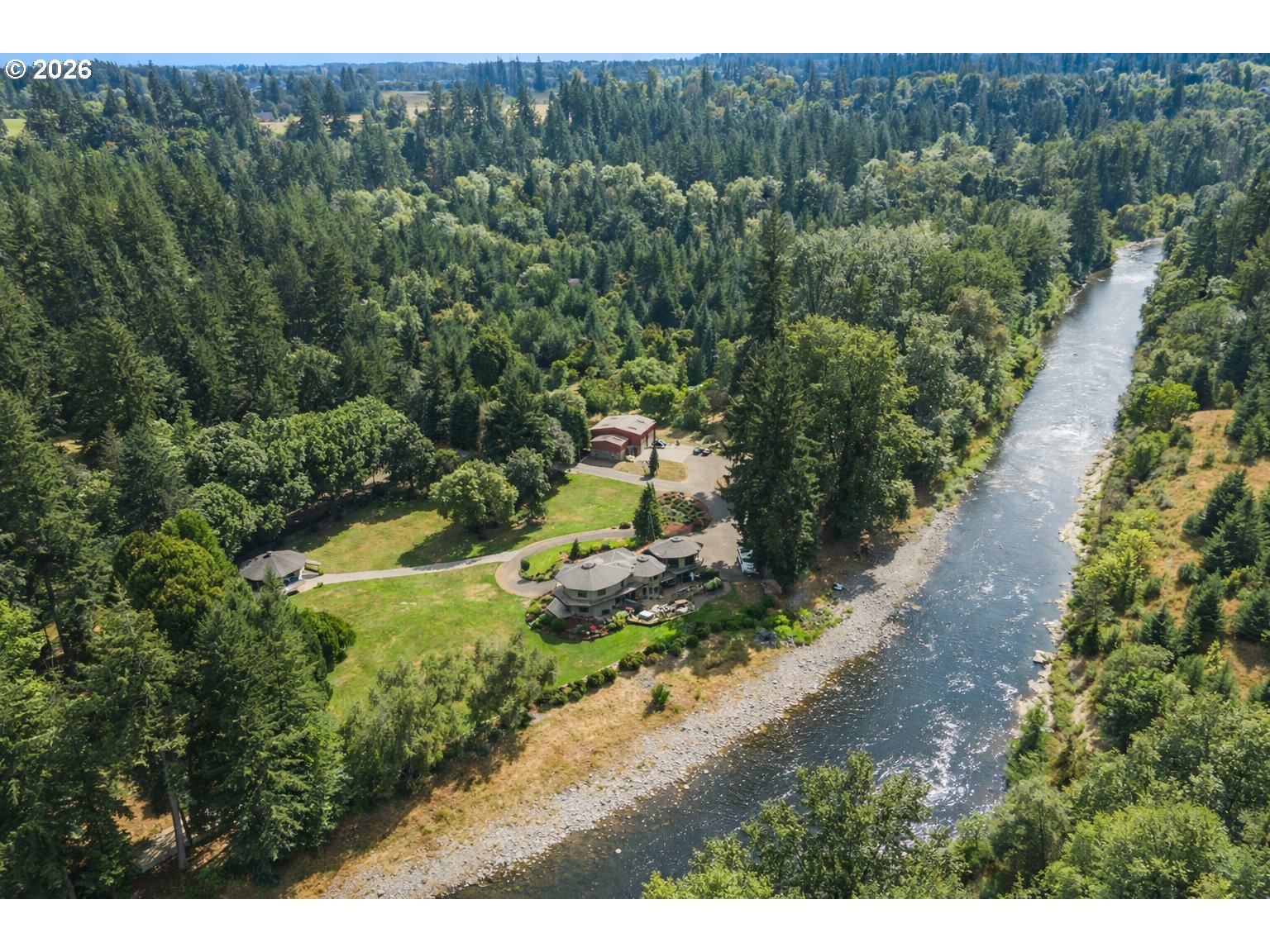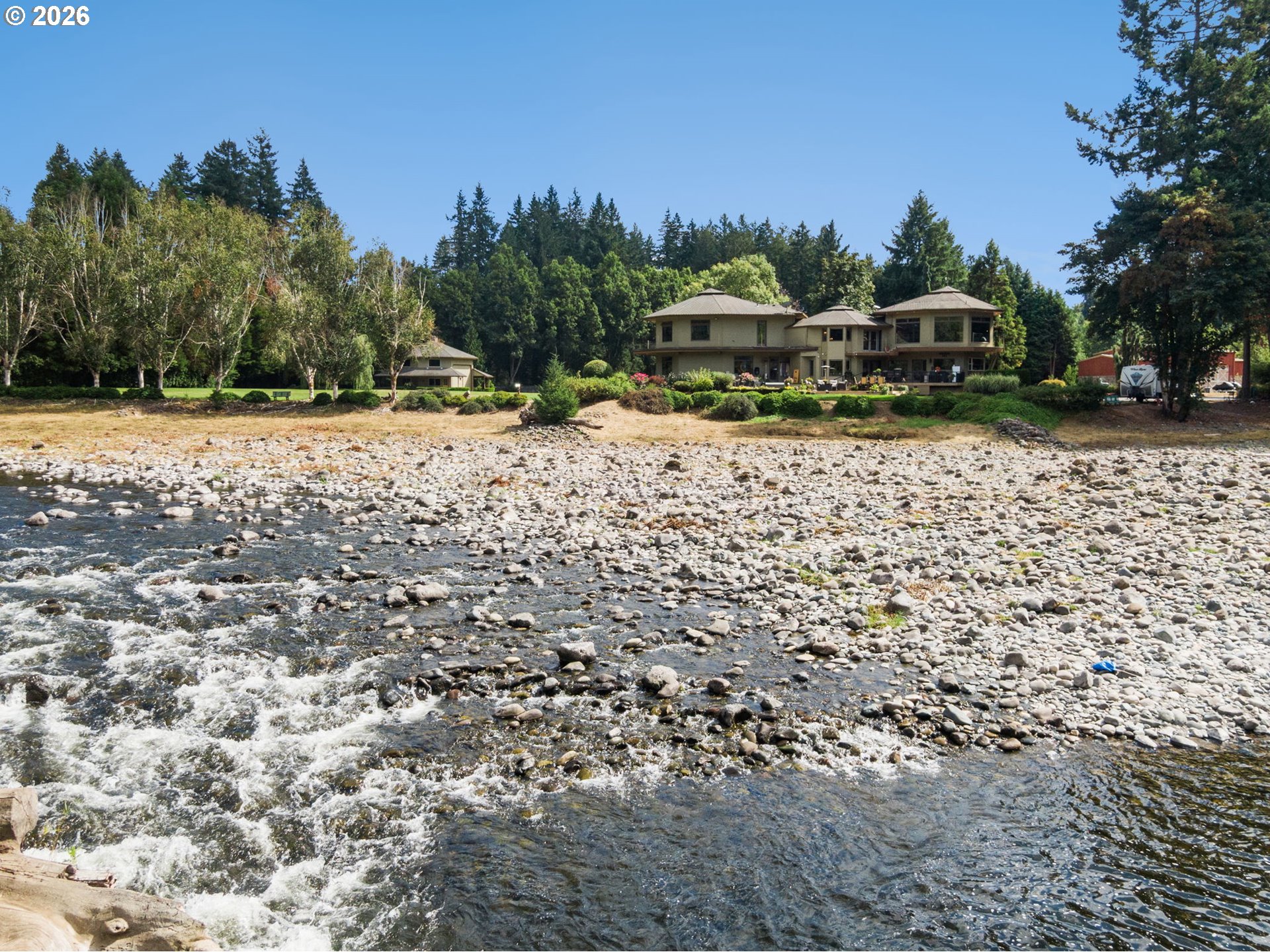 Exceptional waterfront estate on nearly 7 acres of flat, manicured, usable acreage—ideal for events, weddings, small business-partially fenced & gated with over 600 feet of breath taking river frontage, designated boat launch, and paved access just outside downtown Battle Ground, delivering a rare balance of privacy and convenience. This custom-built, legacy estate, showcases timeless craftsmanship with exposed cedar beams, vaulted ceilings, rich knotty alder finishes, expansive windows framing panoramic views, and an architectural roof.The expansive main-level primary suite lives like a private wing with double doors to the river, spa-inspired ensuite featuring heated floors, soaking tub, enclosed tile shower with multiple body sprayers, towel dryer, and expansive California Closets with stackable washer and dryer, plus hidden safe room. The open concept kitchen offers Miele built-in ovens, wine fridge, granite counters and backsplash and flows seamlessly to a wrap-around Trex deck with hot tub overlooking the water.Spacious laundry room with separate entry. Dual pantries. Upstairs includes a large bonus room with sweeping river views, office nook, two bedrooms, full bath, and steam room. The newly finished basement off, of the garage, offers media/game room space and small wine cellar.Recent updates include fresh interior paint, new carpet and pad, and newer LVP flooring.Grounds feature 836 sqft carport, 2,000 sqft heated shop(2007) with loft and separate-entry apartment with quartz counters, microwave, mini fridge, mini split, TV, full bath, water heater, and electrical. Additional 1,164 sqft detached garage with loft, electricity, and plumbing for potential second ADU (buyer to verify). Separate irrigation well, garden, apple orchard, fruit trees, and weeping willows create a private setting rich with wildlife including salmon, steelhead, deer, and beaver—offering a true Pacific Northwest lifestyle with space to gather, entertain, and create lasting experiences.