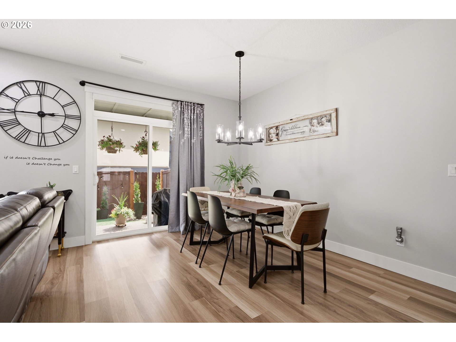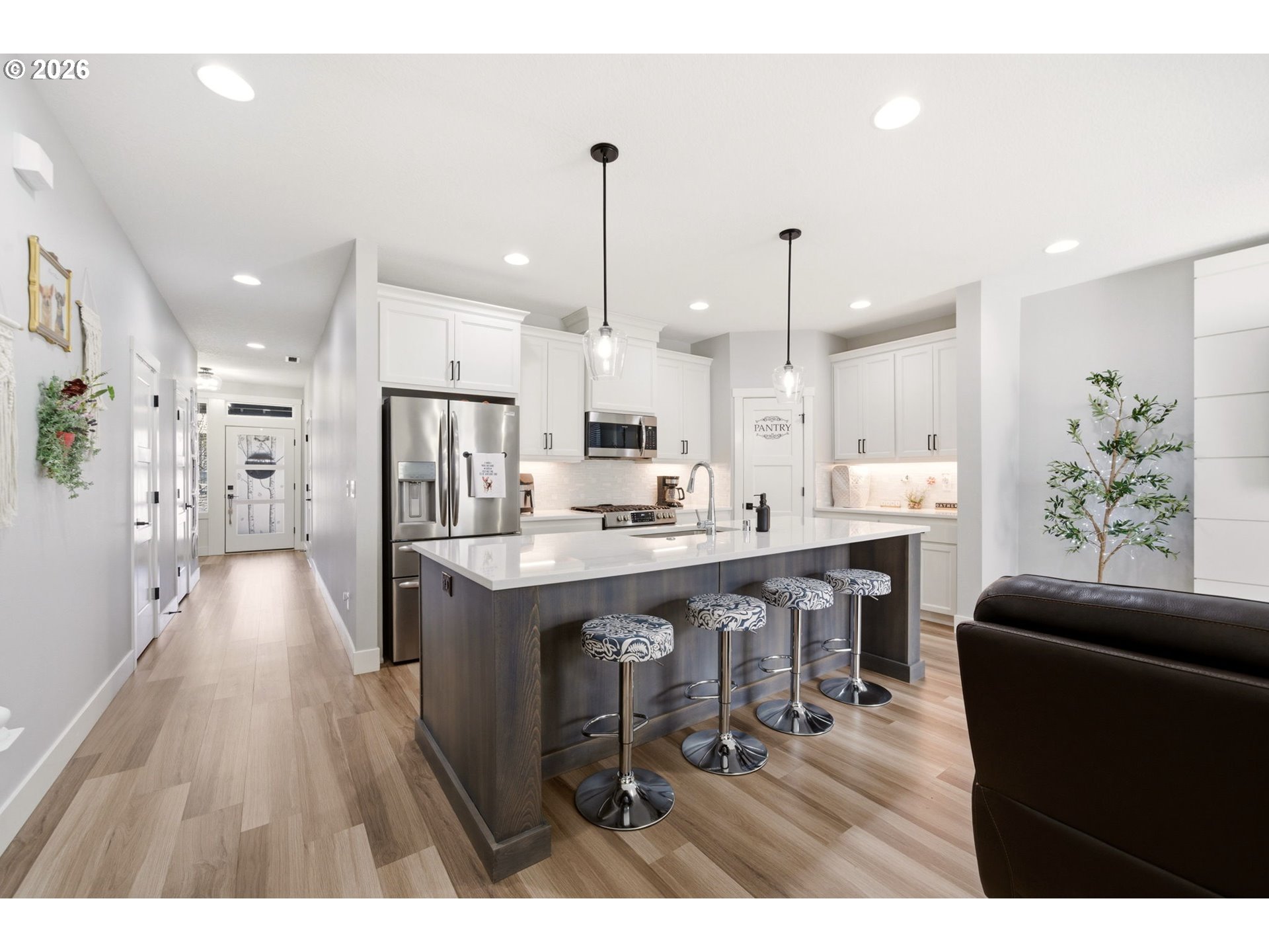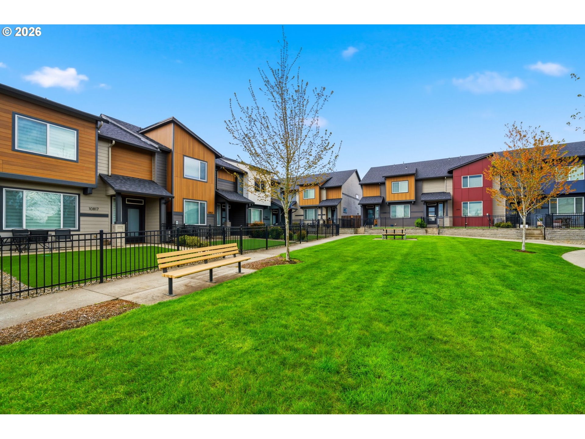 Welcome to this modern townhome that offers exquisite finishes and luxurious living throughout. The main level features a bright, open great room designed for both everyday living and effortless entertaining. This expansive space brings together the kitchen, dining, and living areas in one seamless, cohesive layout, offering an open yet comfortable flow throughout. The kitchen is beautifully appointed with an extra large eating island, gas cooktop, and stainless steel appliances. Quartz countertops add a refined, sophisticated surface, while soft white cabinetry delivers a clean, modern elegance that enhances the overall design. A sleek linear electric fireplace with a shiplap surround anchors the room, adding a warm and elegant focal point to the contemporary design. Upstairs, there are three spacious bedrooms. The primary suite is a true retreat, featuring a beautifully finished ensuite bath with dual sinks, quartz countertops, a spacious walk in shower, and an impressive walk in closet. The additional two bedrooms are generously sized. A conveniently located upper level laundry room with built in features adds ease to everyday living. The outdoor space is designed for low maintenance living, featuring durable turf, a covered patio for year round enjoyment, full fencing for privacy and HOA maintained front yard . Community amenities include walking paths, a play area, and open green spaces with benches and picnic tables, creating a welcoming and well maintained environment.