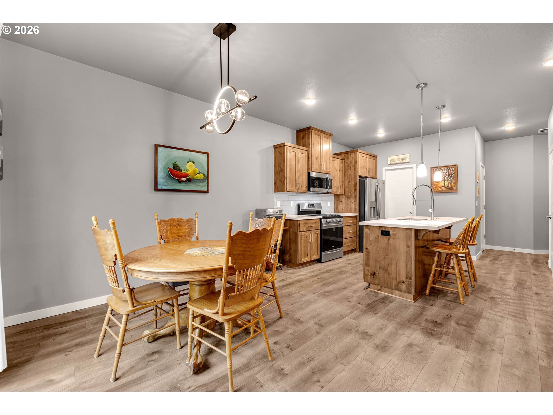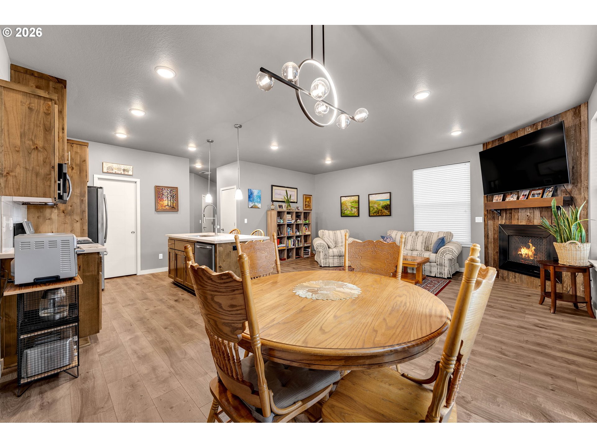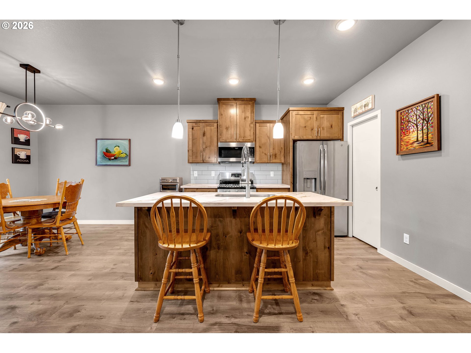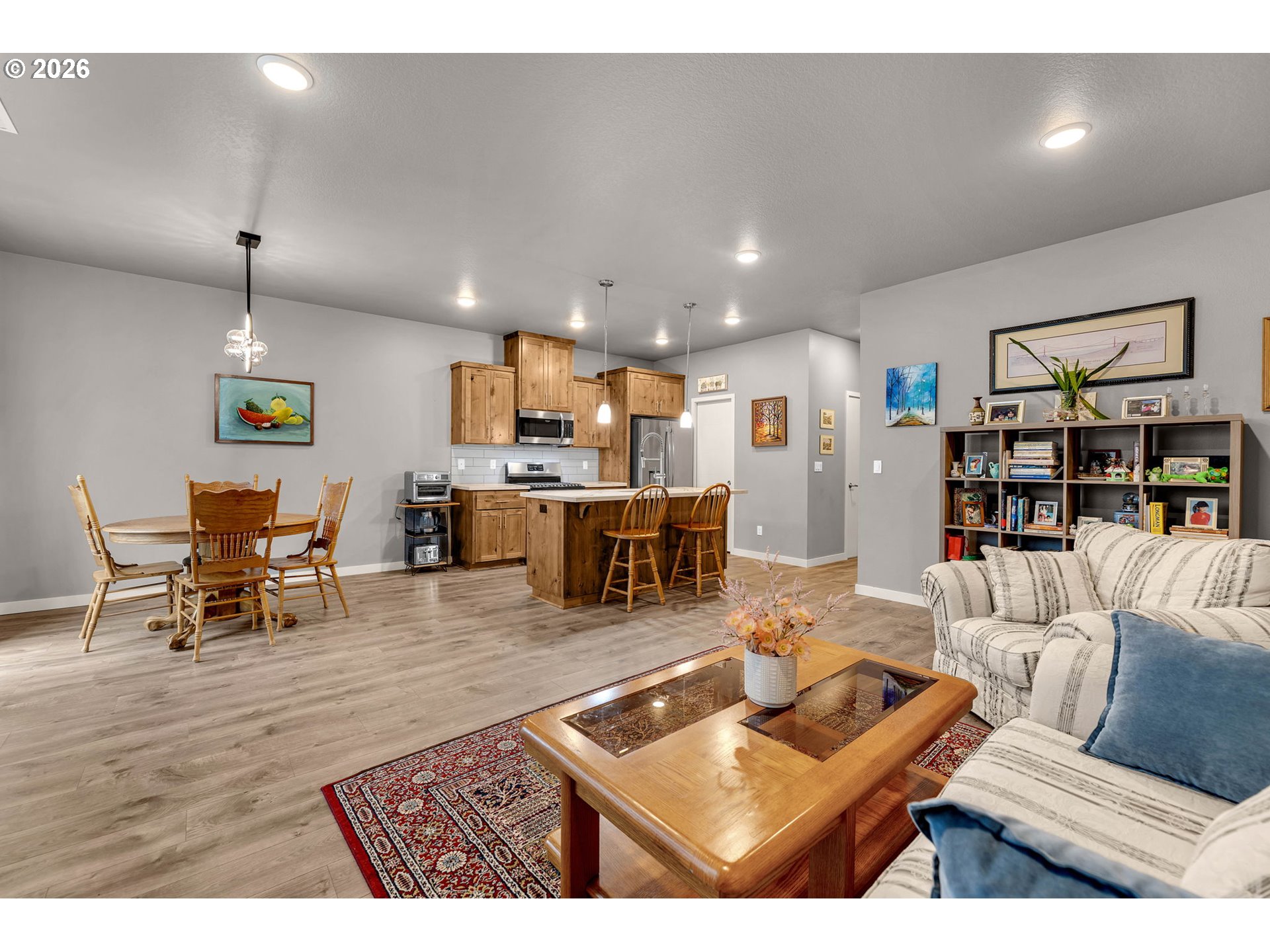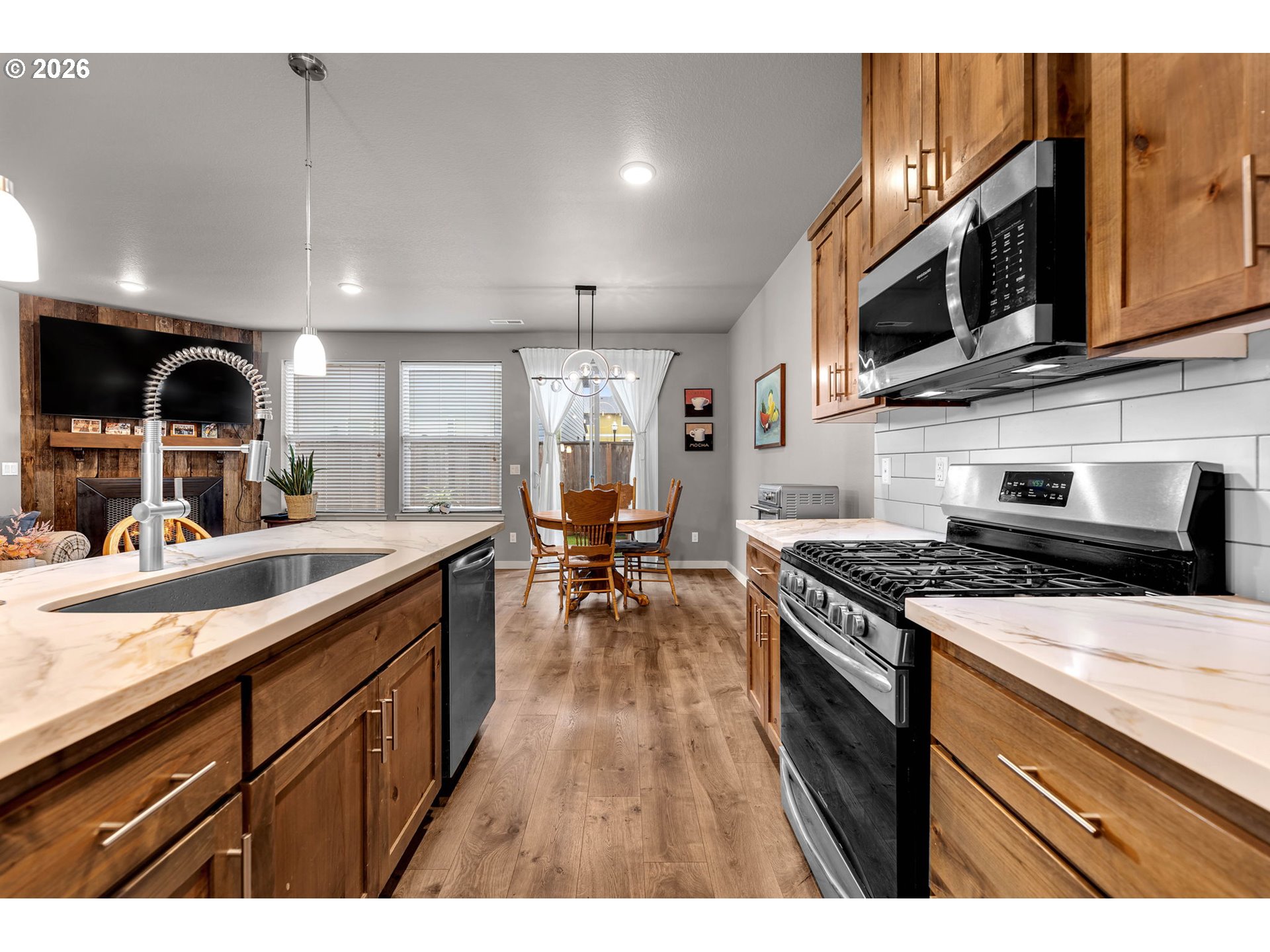 Beautifully designed townhouse offering modern comfort and functional living! This 3-bedroom, 2.5-bath home features an open-concept great room with a seamless flow between the kitchen, dining, and living areas—perfect for everyday living and entertaining. The inviting living room includes a cozy gas fireplace for added warmth and ambiance. The kitchen is a standout with quartz countertops, a gas range, walk-in pantry, and a spacious eat-at island—ideal for meal prep and casual dining. Upstairs, you’ll find all three bedrooms, two full bathrooms, a versatile loft/office space, and a convenient laundry room. The primary suite provides a comfortable retreat with ample space and natural light. Additional highlights include luxury vinyl flooring throughout the main living areas, with durable tile flooring in the bathrooms and laundry room. A half bath is conveniently located on the main level for guests. Enjoy outdoor living in the fenced backyard featuring a patio and low-maintenance turf—perfect for relaxing or entertaining without the upkeep. Complete with a 2-car garage, this home combines style, efficiency, and practicality in a desirable layout.