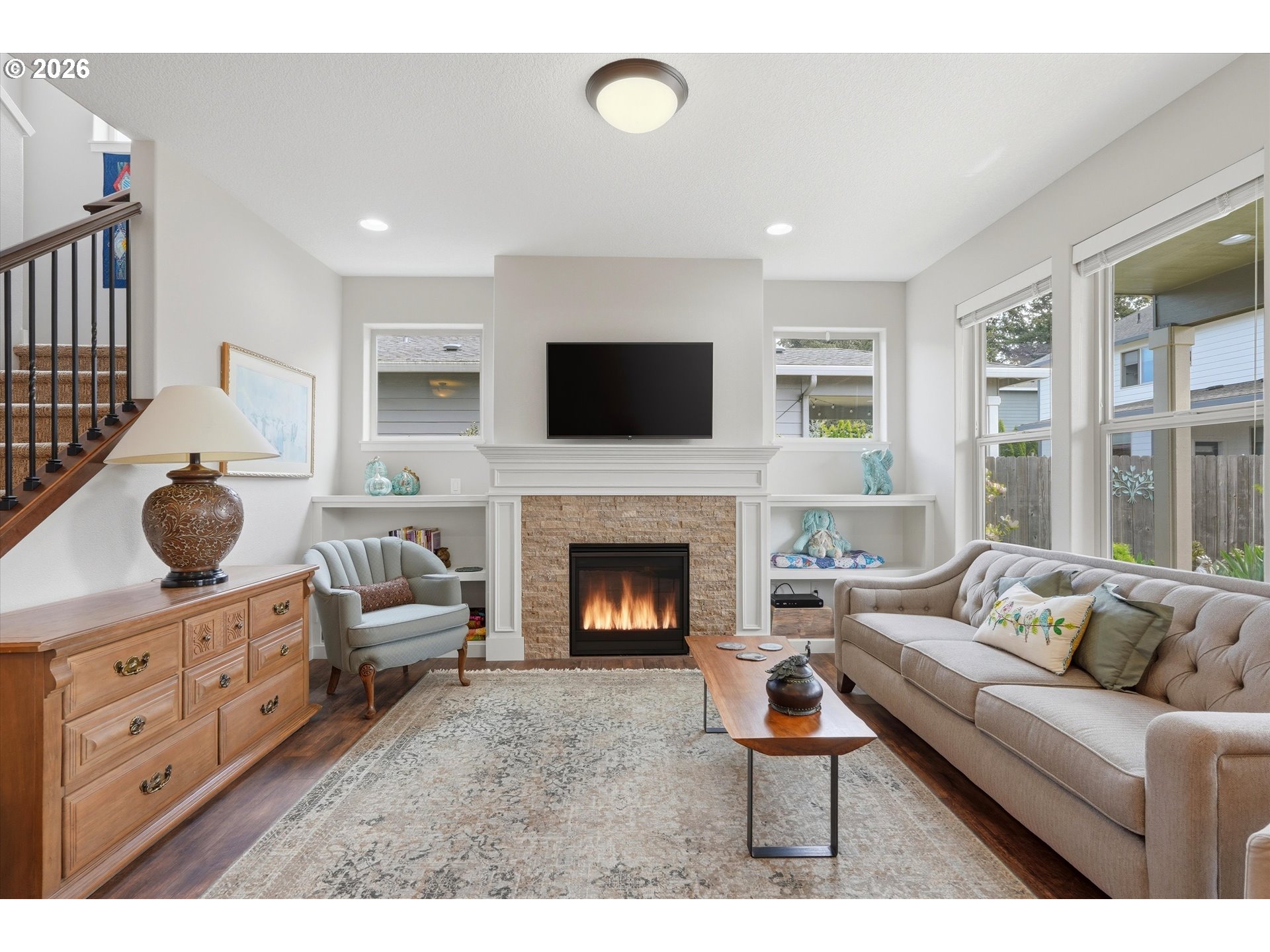 Welcome to this light-filled 2018-built home by Manor Homes, offering a thoughtful layout designed for both comfort and everyday living, less than a minute away from Dogwood Park! The main level features a full bathroom, providing flexibility for guests or the option for convenient main-level living. The living area is warm and inviting, centered around a gas fireplace with built-in shelving—perfect for cozy nights or hosting friends and family. Just off the garage, you’ll find a walk-in pantry that adds extra storage and makes day-to-day living even more functional. The 3-car tandem garage offers plenty of space for parking, storage, or hobbies. Upstairs, you’ll find two guest bedrooms, a dedicated laundry room, and a spacious primary suite with double sinks, a tiled shower, and a soaking tub—creating a comfortable space to unwind at the end of the day. Step outside to enjoy a beautifully maintained garden with established plants, offering a peaceful outdoor setting to relax or entertain.