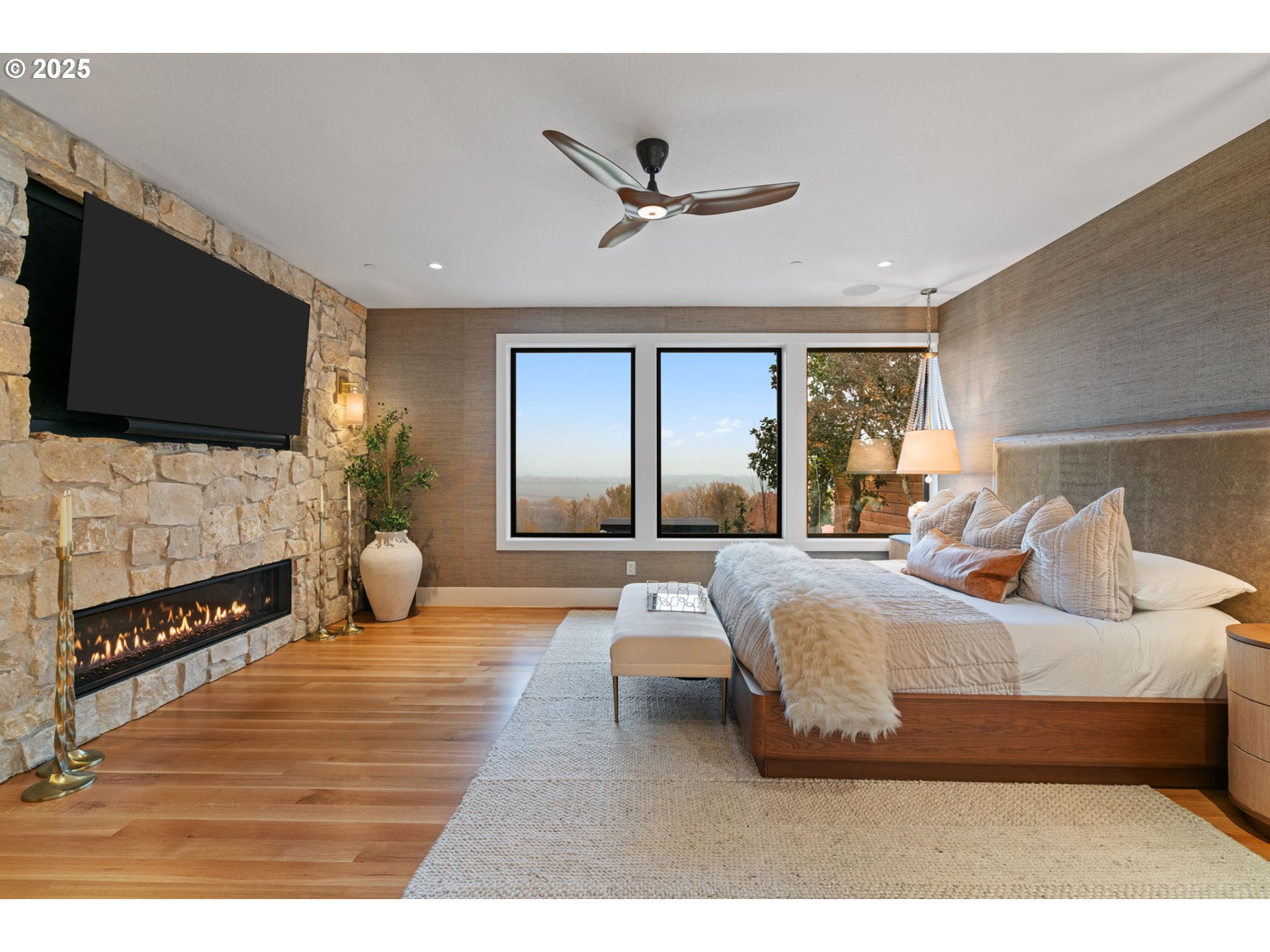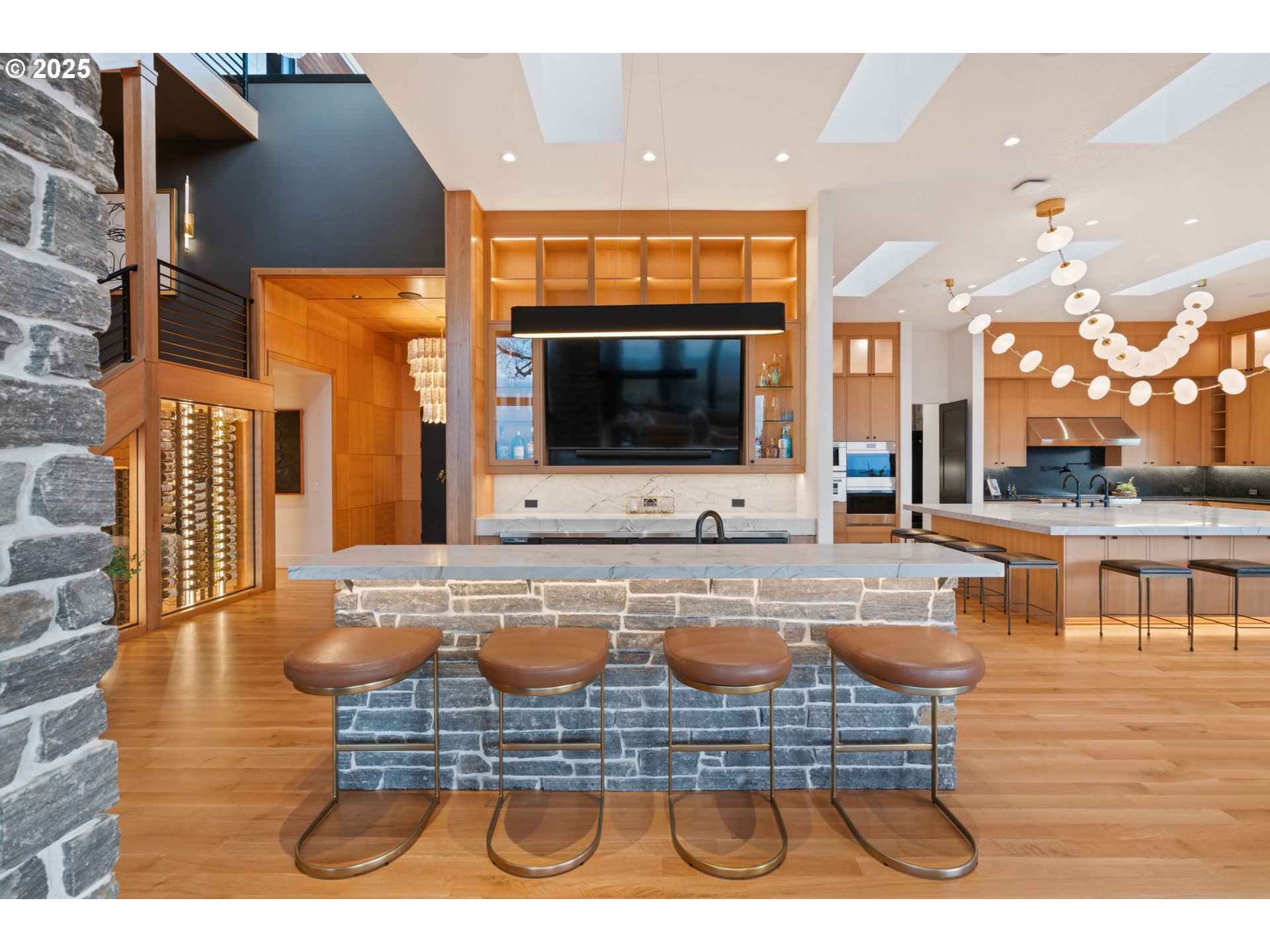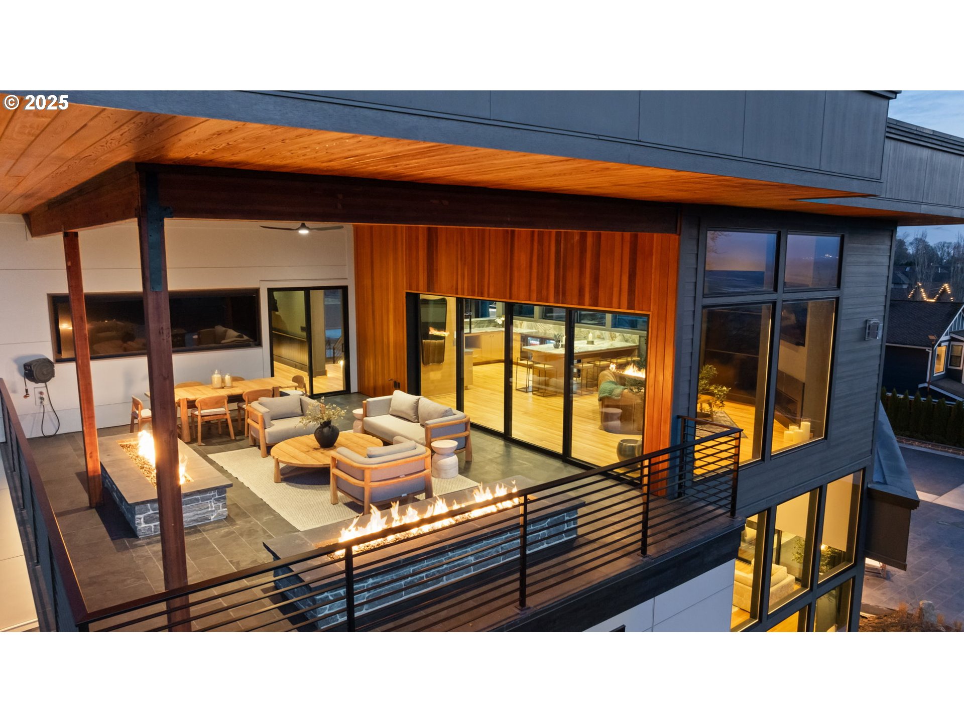 This newly constructed modern estate delivers a rare level of design, livability, and setting. Thoughtfully designed and custom-built, the home reflects intentional craftsmanship and curated interior styling throughout, where every finish and design element supports a cohesive modern lifestyle. Floor-to-ceiling windows and multi-slide doors create seamless indoor/outdoor living and constant connection to panoramic west-facing views. The layout includes 7 bedrooms and 7.5 bathrooms, including a fully permitted ADU with its own kitchen and laundry, offering comfortable multigenerational living or exceptional work-from-home flexibility. An interior elevator provides effortless access across all three floors. Natural stone, Oak rift-cut hardwood floors, oak-lined walls, designer lighting, smart-home, TVs, Security, Sonos audio, and multiple laundry areas enhance everyday comfort. The chef’s kitchen features commercial-grade Wolf, Sub-Zero, Thermador, and True appliances, a generous island, and a butler’s pantry. A temperature-controlled 1700-bottle wine display leads to an upper-level lounge with a full bar and 180-degree sunset views, ideal for gatherings and elevated entertaining. A dedicated golf simulator lounge offers immersive recreation. Outdoor living feels like a private retreat with covered terraces, heaters, stone fire features, dining and seating zones, a pickleball court, and an expansive landscaped one-acre lot designed for year-round enjoyment. Spa-style bathrooms and boutique-level closets elevate long-term comfort. The home is beautiful in photographs, but its true impact is how it feels in person—refined, quiet, warm, dramatic, and unforgettable. A luxury indoor/outdoor lifestyle with sunset views and modern design meant to be experienced firsthand.