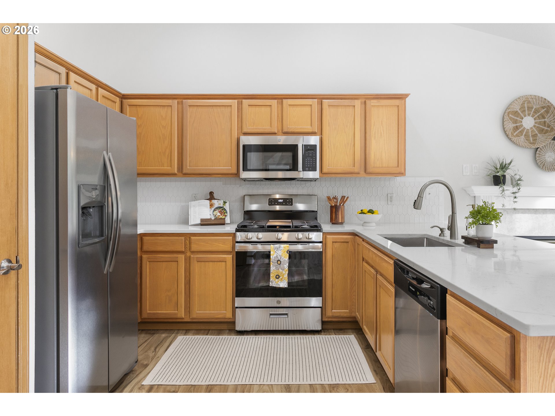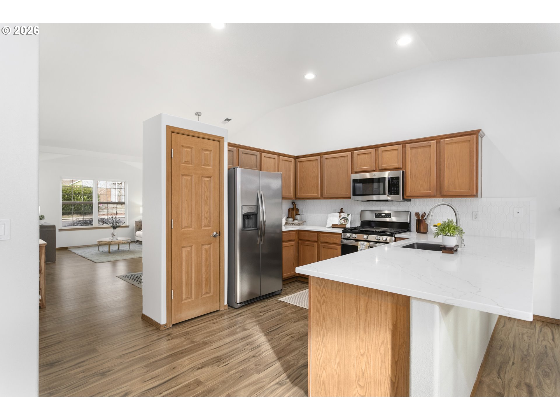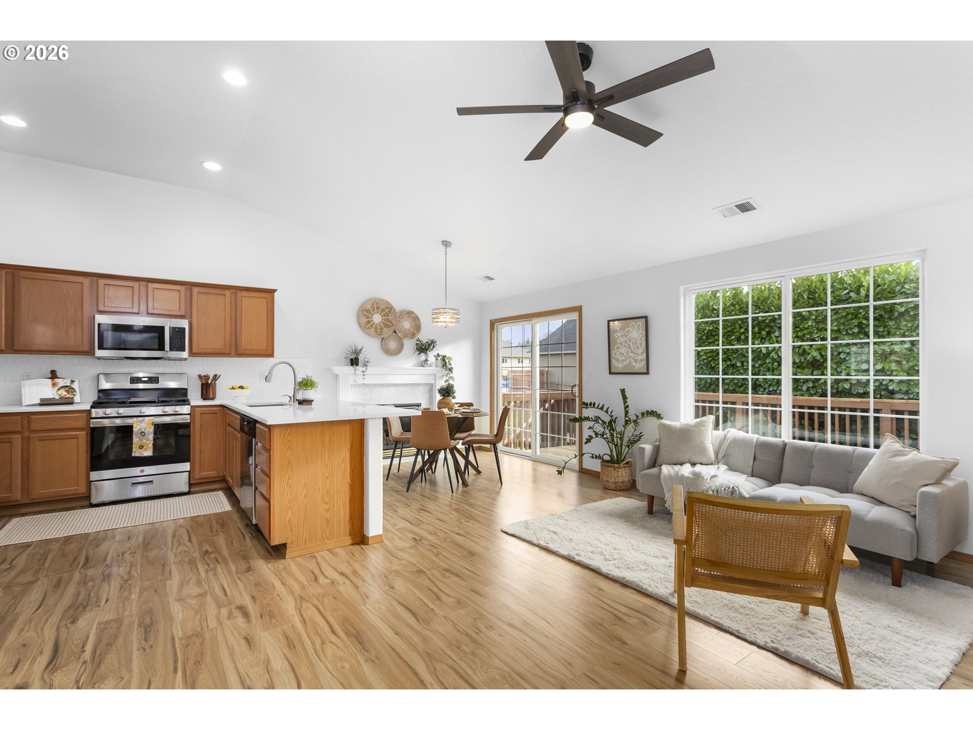 Freshly Updated & Move-In Ready! Welcome home to this beautifully refreshed one-level home with a 3-car garage, offering comfort, style, and convenience. Step inside to discover abundant natural light streaming through large windows, highlighting the brand new wood laminate flooring and fresh interior paint throughout. All new light fixtures for a bright, welcoming feel. The recently updated kitchen features stunning quartz countertops, full tile backsplash, a new stainless steel gas range and new microwave, and a new sink and garbage disposal. Both bathrooms shine with new quartz counters, new fixtures and finishes. Two of the bedrooms feature brand new carpet, adding a cozy touch. Enjoy easy indoor-outdoor living — step out onto your spacious deck, perfect for entertaining or relaxing. The fenced backyard includes a dog run, a large shed, and a sprinkler system to keep everything lush and green. Plenty of room for your RV or boat storage, plus extra storage under the house. New roof in summer of 2023. Located close to the golf course, this turn-key home truly has it all. Don’t wait — this one won’t last long! OPEN HOUSES on Saturday, 1/24/26 from 11am-2pm and Sunday, 1/25/26 from 12pm-3pm.