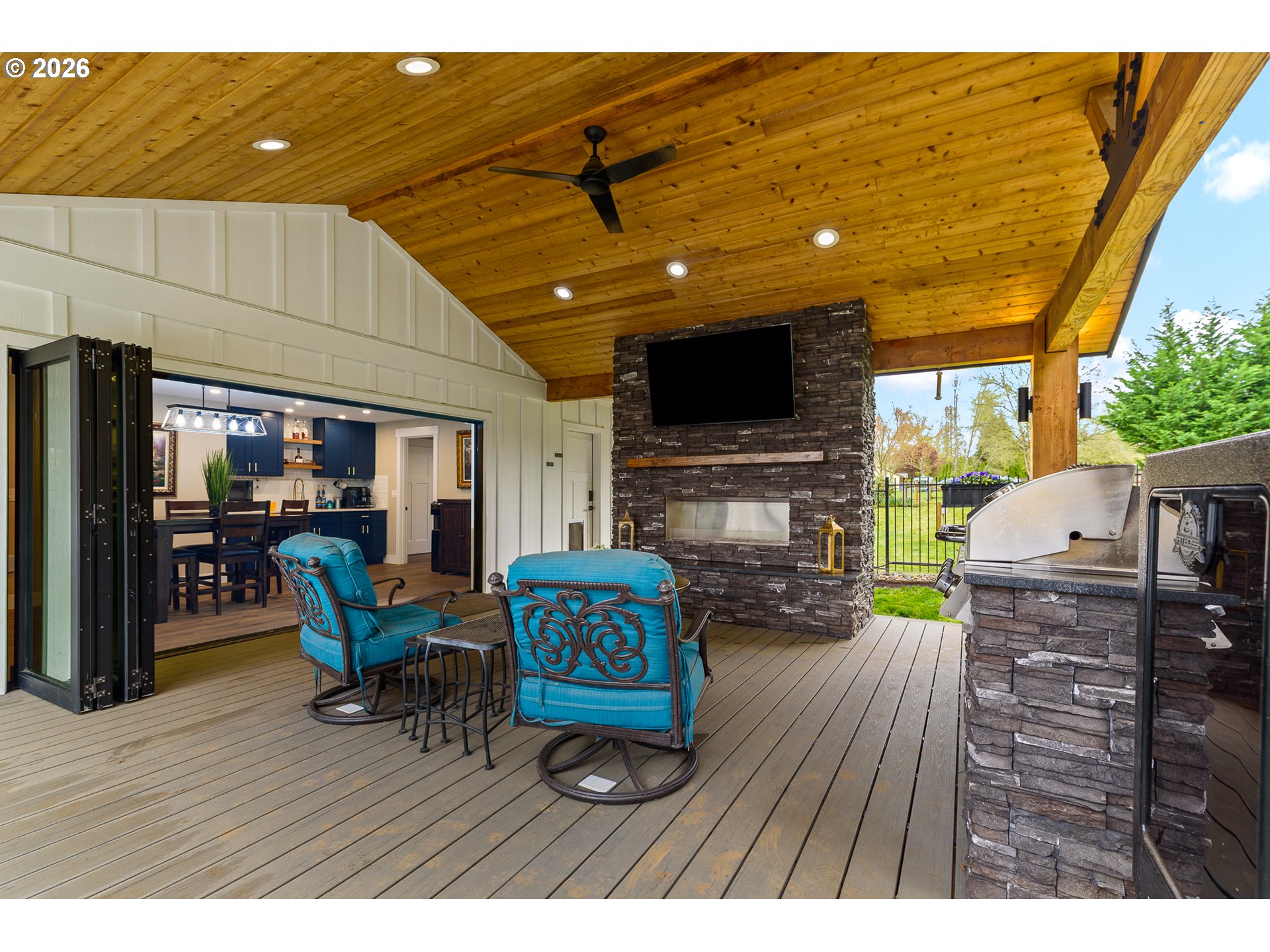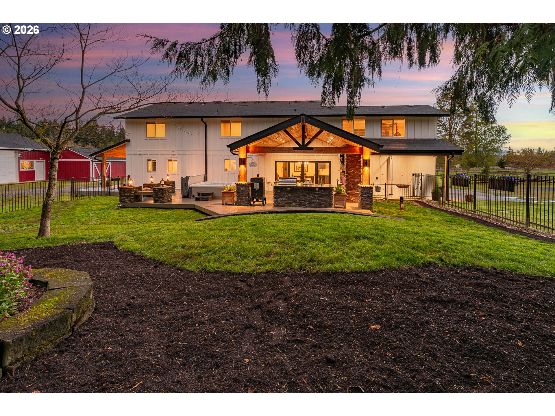 Situated on a 1.44-acre corner lot, this beautifully remodeled and expanded home offers 5 bedrooms, including two primary suites, and 4.5 bathrooms. The layout includes a main-level office, a spacious upstairs bonus room, and convenient utility rooms on both levels. The kitchen features a large island, gas appliances, and flows seamlessly into the dining area. The main-level primary suite offers a walk-in closet, additional shoe closet, and a spacious bath with soaking tub, walk-in shower, and double sinks.Designed for entertaining, the home opens to an impressive outdoor living space with a 12-foot panoramic door, covered cedar wrap-around porch, gas fireplace, outdoor kitchen, built-in seating, TV, and an 8-person hot tub, all within a fenced backyard.The property also includes a 900 sq ft insulated shop with power and water, a 2-stall barn, greenhouse, raised garden beds, and two 50-amp RV pads with electric and water hookups. This home offers the perfect blend of comfort, space, and functionality. Don’t miss this opportunity to make it yours!