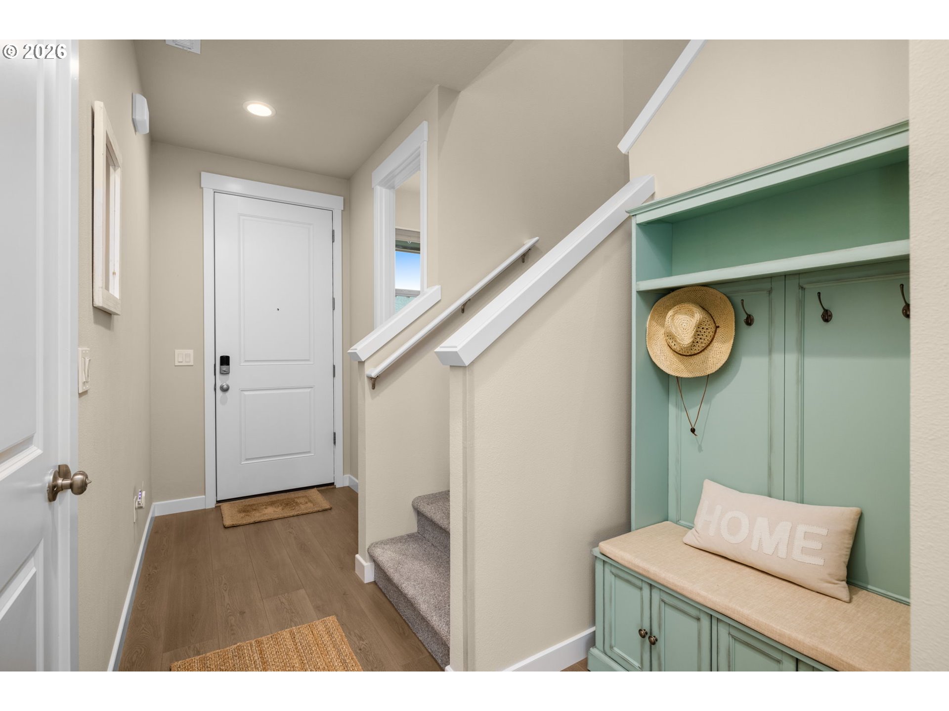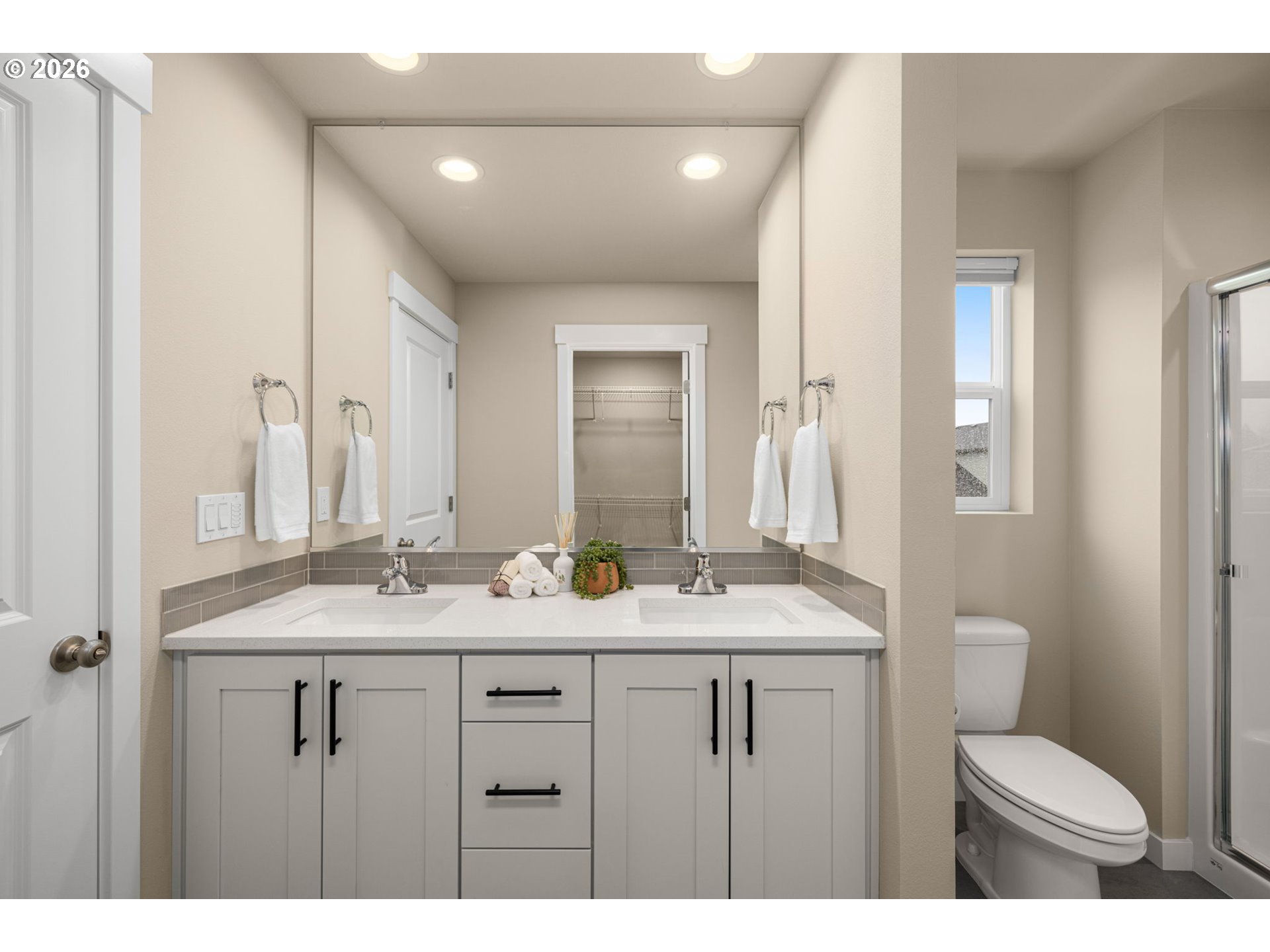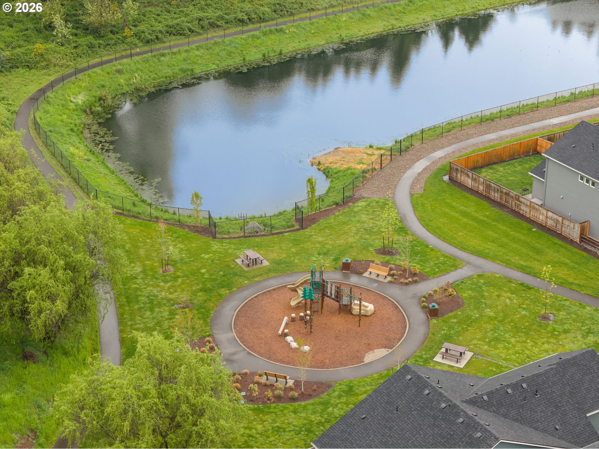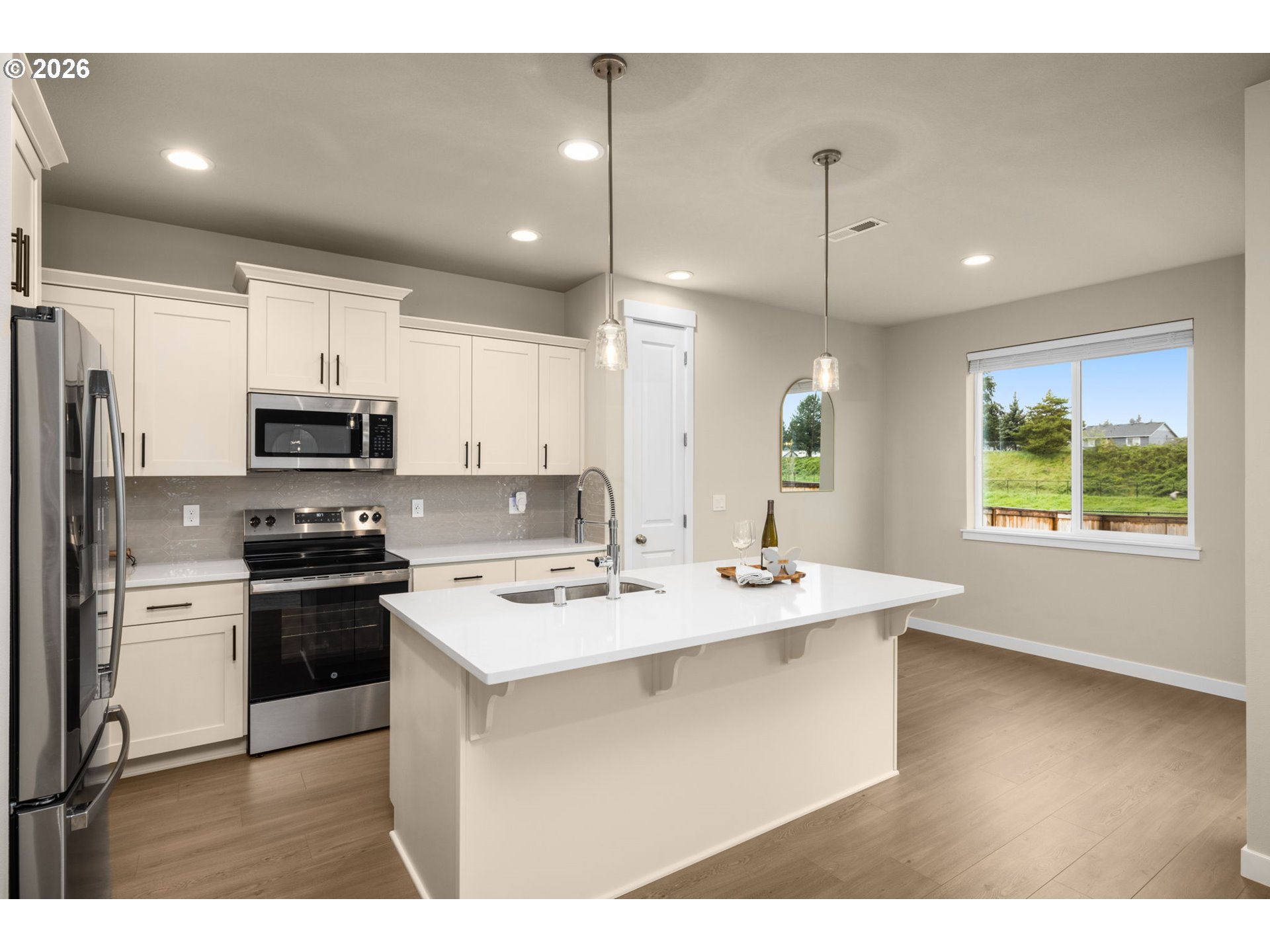 Set in one of the most coveted locations in the neighborhood, this better-than-new 3-bedroom, 2.5-bath home—just one year old—offers peaceful pond views and the rare privacy of no neighbors behind. Enjoy the soothing sounds of seagulls, geese and visiting birds while taking in the tranquil setting that feels like living beside your own nature park plus a neighborhood playground at the end of the block.Designed with a highly functional floorplan, the main level features a spacious living area centered around a cozy fireplace—perfect for relaxing or entertaining. The upgraded kitchen combines style and efficiency with quartz countertops, ample cabinetry, a pantry and eating bar. Quality window treatments throughout, while easy-care laminate flooring enhances the main level. A sliding door off the dining space opens to a patio and large backyard with garden boxes—ideal for outdoor living and enjoying the serene surroundings.Upstairs, you’ll find three bedrooms and a conveniently located laundry room. The primary suite offers a tray ceiling, ensuite bath with walk-in shower, and an oversized closet, creating a comfortable private retreat.Additional conveniences include a garage with extra shelving and HOA-maintained front landscaping, making day-to-day living effortlessly low maintenance. A large nearby dog park adds to the lifestyle appeal, while neighborhood coffee shops and restaurants are just moments away. Commuters will appreciate the easy 15-minute drive to PDX, offering both accessibility and a peaceful retreat to come home to.