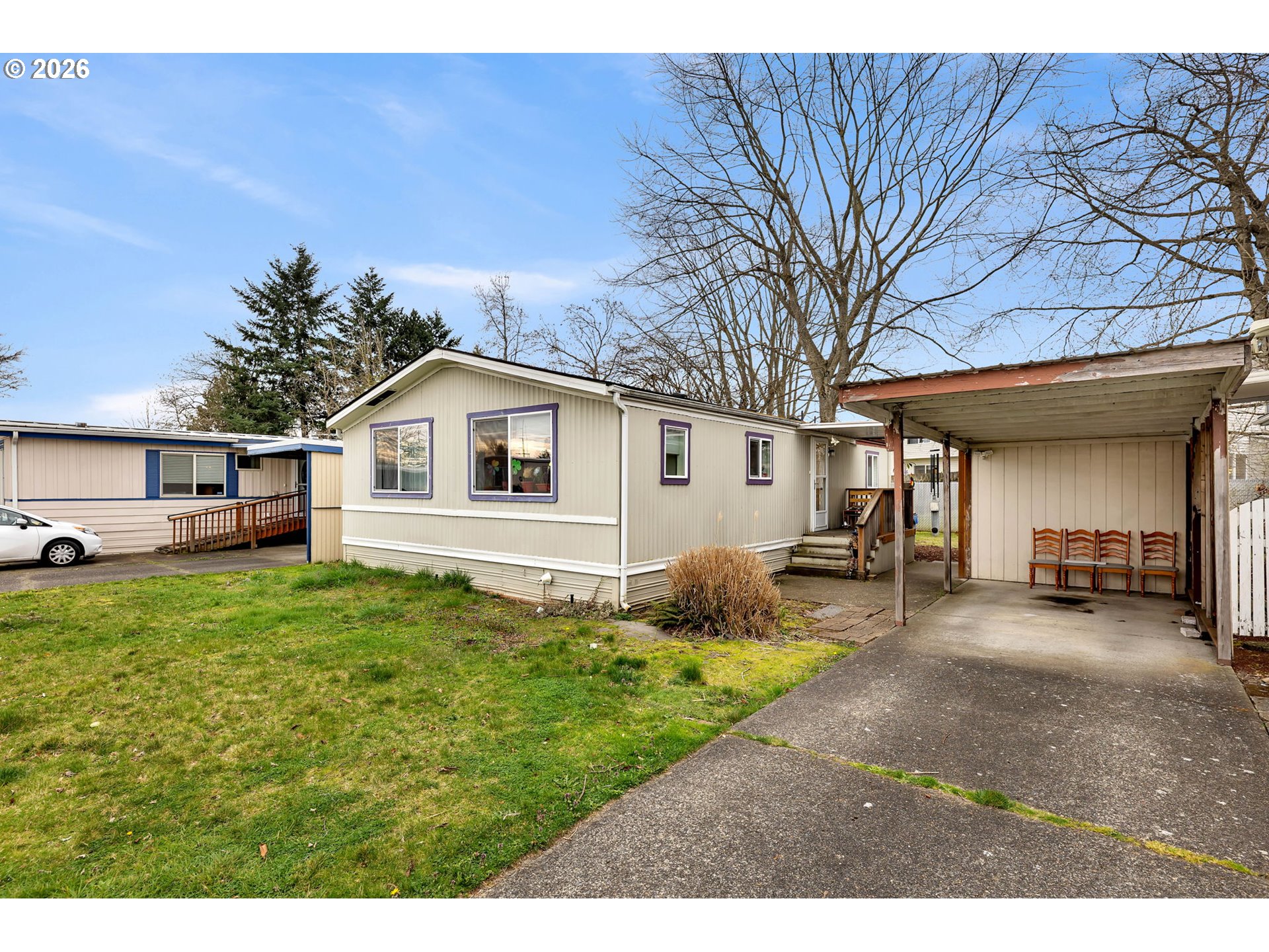 Welcome home to comfortable and convenient living in this well-maintained double-wide located in a desirable 55+ community with lower space rent than many nearby parks. Ideally situated directly across from the community recreation room, this home offers easy access to social activities and gatherings. With 960 square feet, the home features 2 bedrooms and 2 bathrooms, including a spacious primary suite with a private ensuite bath and relaxing jetted tub. The main living area is bright and welcoming, highlighted by luxury vinyl plank flooring, vaulted ceilings, and abundant natural light. Additional features include air conditioning, upgraded blinds throughout, in-home laundry, and a thoughtful floor plan designed for comfortable everyday living. The property also offers a covered carport, storage sheds, and extra parking for guests. Enjoy the convenience of a great location near shopping, dining, and everyday amenities, with a bus line nearby and a park located just across the street. Water and sewer are included in the space rent, adding to the overall value. Clean, bright, and move-in ready—this is an excellent opportunity to enjoy affordable, low-maintenance living in a welcoming 55+ community. Wall mount TVs, washer, dryer, and fridge included.