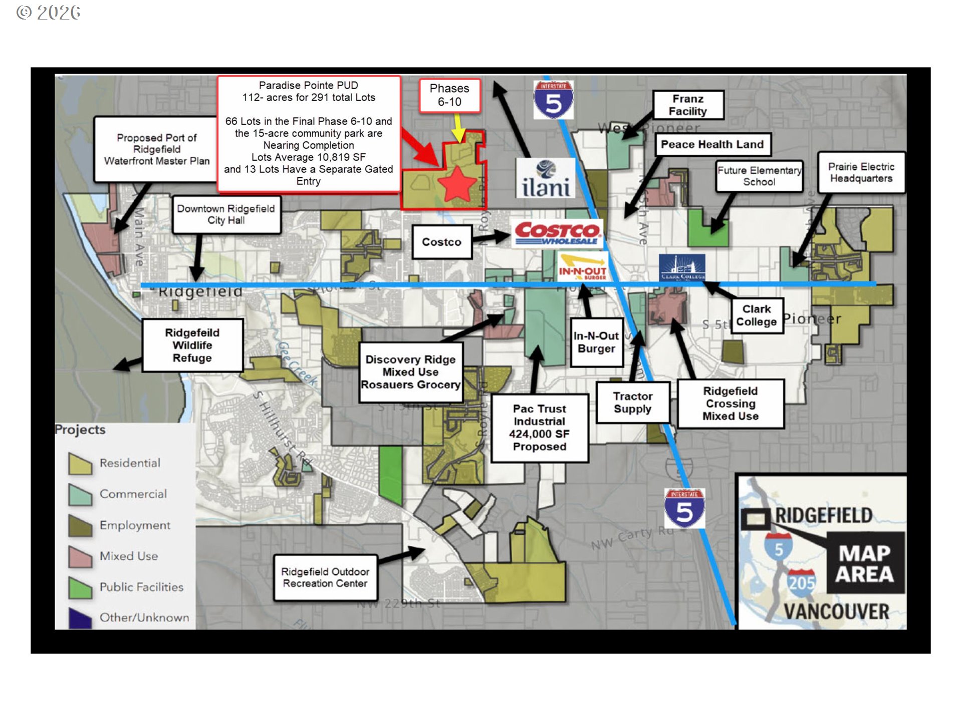 EXCLUSIVE GATED HOME COMMUNITY. Build your dream home in the prestigious gated phase of Paradise Pointe Estates in Ridgefield! Homesite #233 offers approximately 11,726 SF (+/-) of buildable land in one of the area’s most desirable new home communities. Partner with Cascade West, one of the region’s top award-winning custom home builders, to design and build a home tailored to your lifestyle and needs. Nestled alongside a protected oak habitat area, Paradise Pointe Estates features thoughtfully planned amenities including walking paths, playgrounds, and a serene, tree-filled setting with stunning mountain views—offering a rare combination of privacy and natural beauty. Enjoy the security and peace of mind of this pristine gated community, while still just minutes to I-5, shopping, and top-rated Ridgefield schools. The final development phases are underway and are expected to be construction-ready by the end of January. Don’t miss this limited opportunity to own in Paradise Pointe! Inquire about pricing, builder options, and full development details.