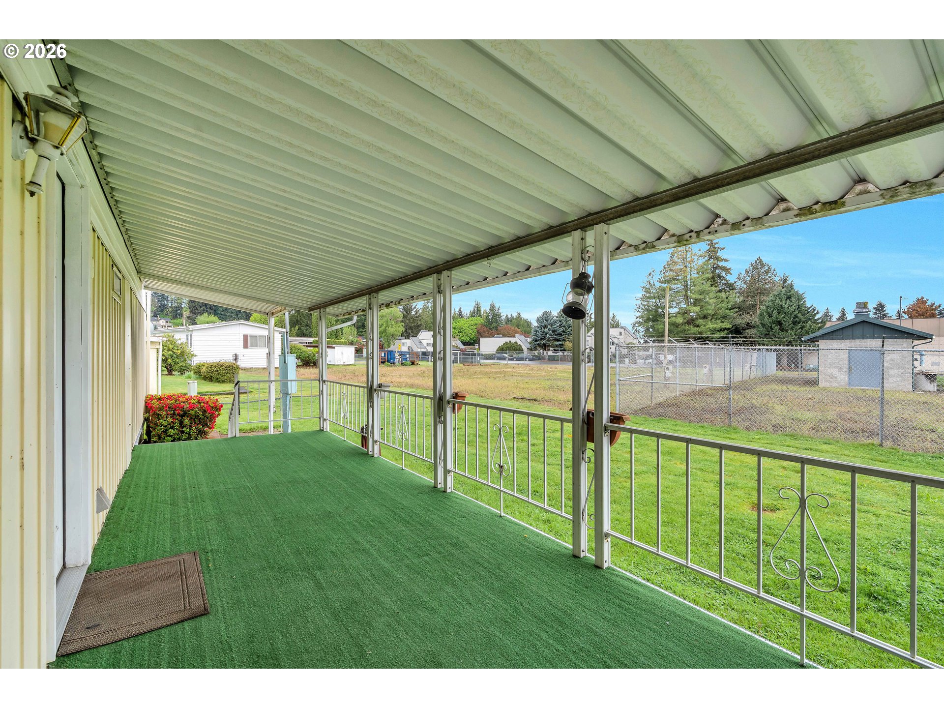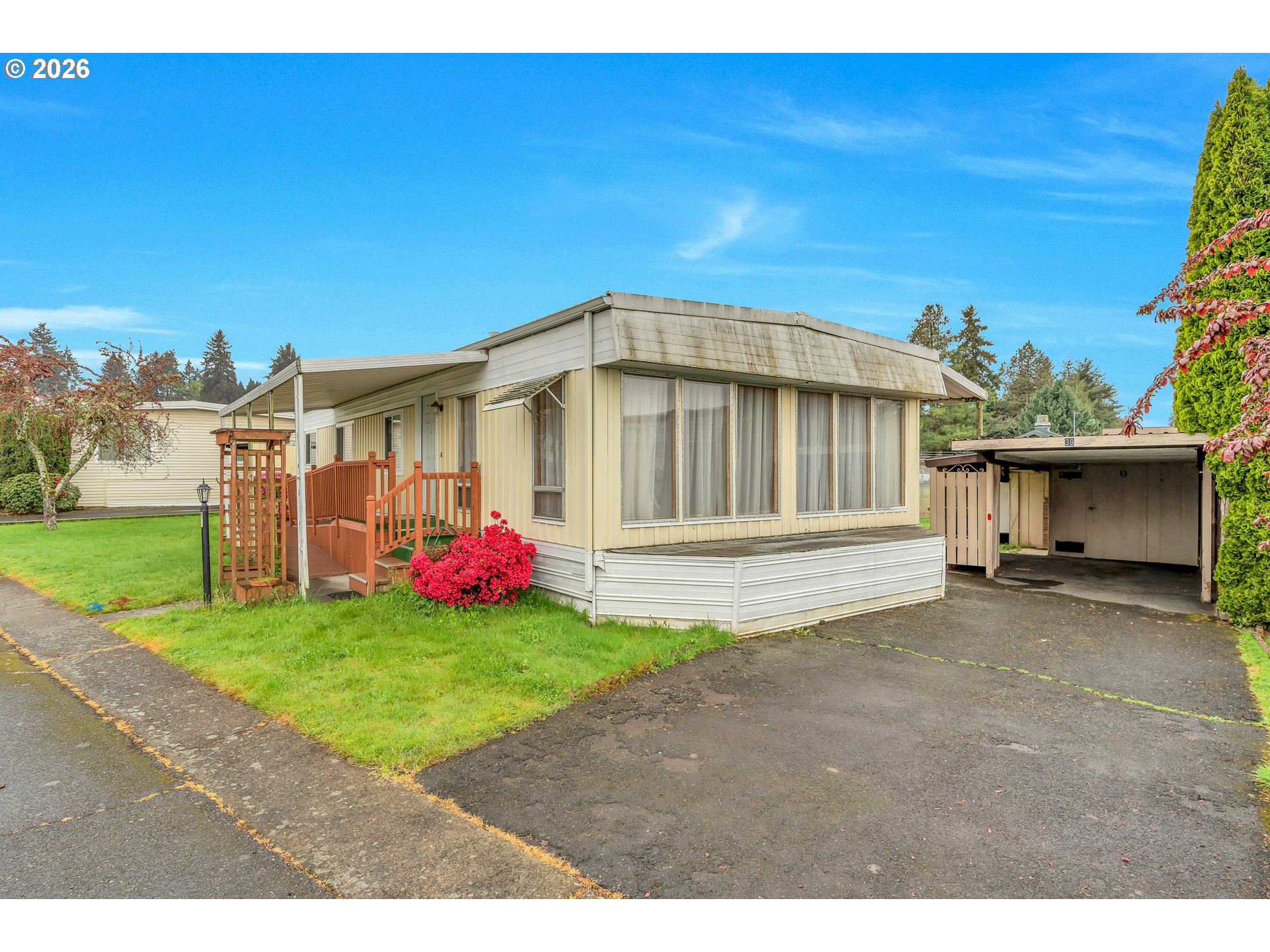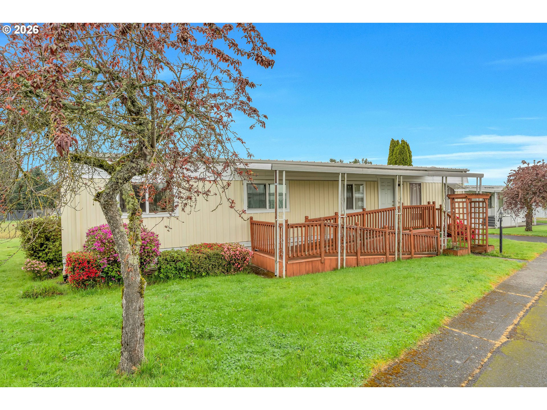 Welcome to this spacious and light-filled single-level home designed for comfort and easy living. Featuring 2 bedrooms and 2 bathrooms, this home stands out with floor-to-ceiling windows throughout, bringing in an abundance of natural light and creating an open, airy feel in every room. Laminate flooring runs seamlessly throughout the home, adding both style and low-maintenance convenience.The thoughtfully designed layout includes an accessible ramp entrance and generous living spaces that make everyday living effortless. The kitchen is well-equipped with a built-in microwave, dishwasher, and plenty of room to cook and gather. The primary suite offers double closets and a private ensuite bathroom with double sinks and a walk-in shower.Step outside to enjoy a large covered deck—perfect for relaxing or entertaining—overlooking a spacious yard with room to garden or unwind.Located in a well-maintained community, residents enjoy access to a variety of amenities including parks, common gathering areas, a shared kitchen, meeting rooms, a recreation space with a pool table, and even a dog park.A rare combination of accessibility, space, and community living—this home is ready to welcome its next owner.