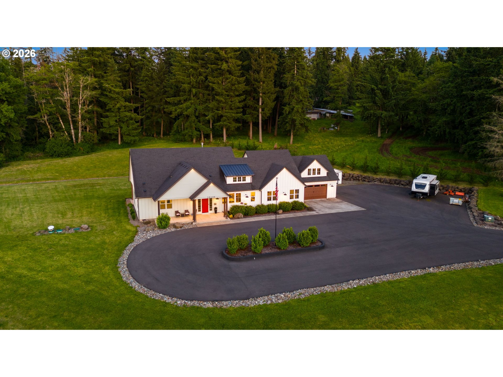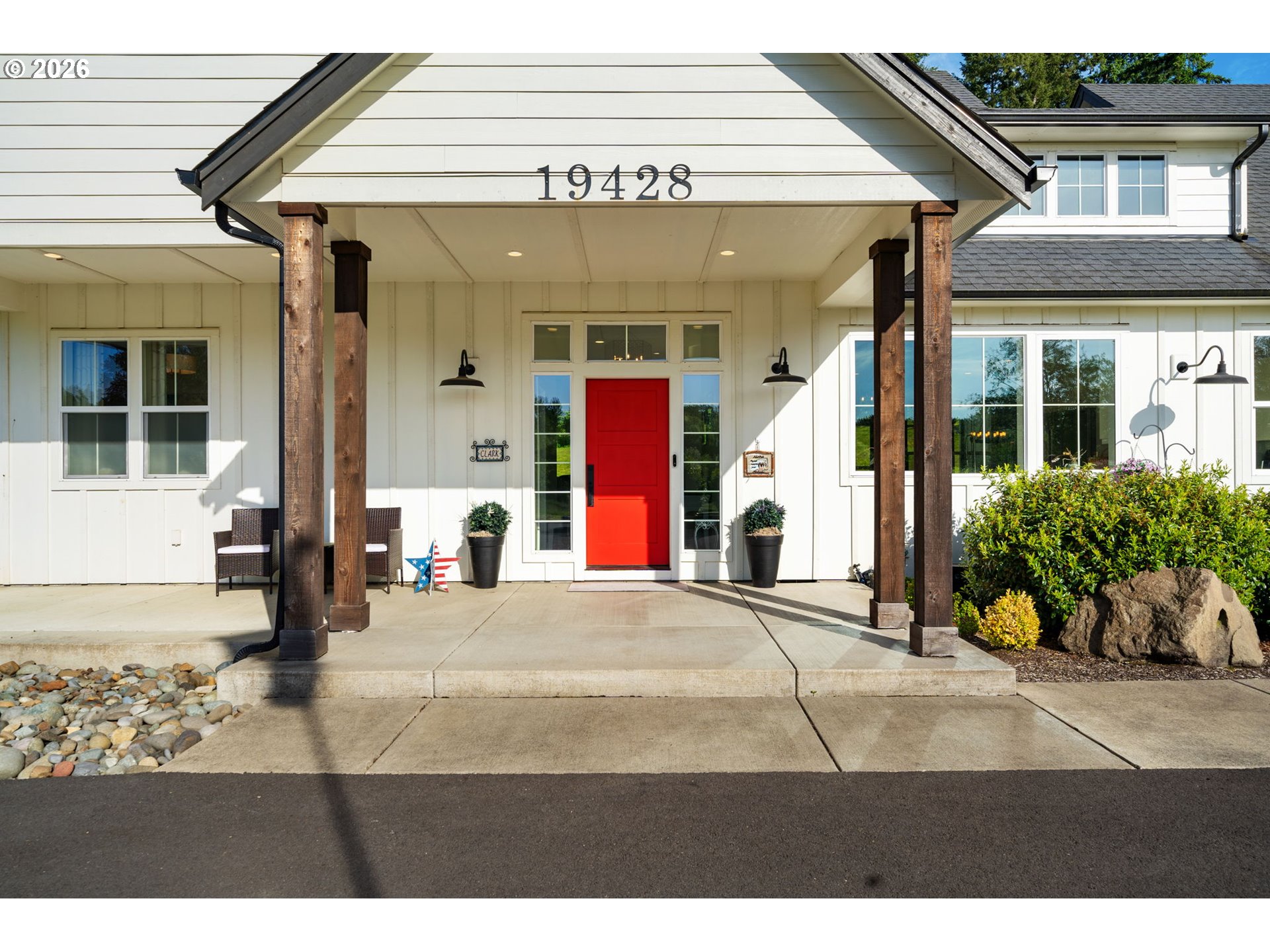 Back on the market with a few updates! **New listing**—a beautiful Craftsman-style Modern Farmhouse on 5 flat, usable acres in the Battle Ground Lake area. Built in 2018, this custom home blends privacy, function, and comfort, just minutes from downtown Battle Ground. A 320-ft private driveway leads to a landscaped setting with territorial views, mature trees, and a horseshoe-shaped driveway.The exterior showcases board-and-batten siding, large wood beams, and a welcoming front patio. Inside, you’ll find 2,464 sq ft of single-level living plus a 450 sq ft bonus loft. The open floor plan features 10-ft ceilings, luxury vinyl plank flooring, and abundant natural light. The great room offers floor-to-ceiling windows, a double-sided fireplace, and custom built-ins.The kitchen includes stainless steel appliances, a large quartz island, built-in refrigerator, 5-burner gas range with hood and smart convection, and a farmhouse sink overlooking the front of the property. A walk-in butler’s pantry with outlets and a coffee/wet bar provides the perfect amount of additional storage and prep space. The dining nook is surrounded by floor-to-ceiling windows with peaceful views of the property.The primary suite features a soaking tub, curbless walk-in tile shower, dual vanities, and separate dual his-and-hers spacious walk-in closets. The covered back patio runs the length of the home and includes a shiplap ceiling, recessed lighting, and exposed beams—ideal for entertaining or relaxing.The property also includes a built-in fire pit, 12x16 storage shed, privacy landscaping, concrete walkways, and perimeter fencing. Additional highlights include an oversized 676 sq ft 2-car garage with 11-ft ceilings, 400-amp underground electrical service, public water with filtration/softener system, pressure distribution septic, and ample parking for RVs or boats. A 40x40 asphalt pad with 220V is wired for a future shop, barn, or hot tub. Shop plans are provided with the sale of the home!