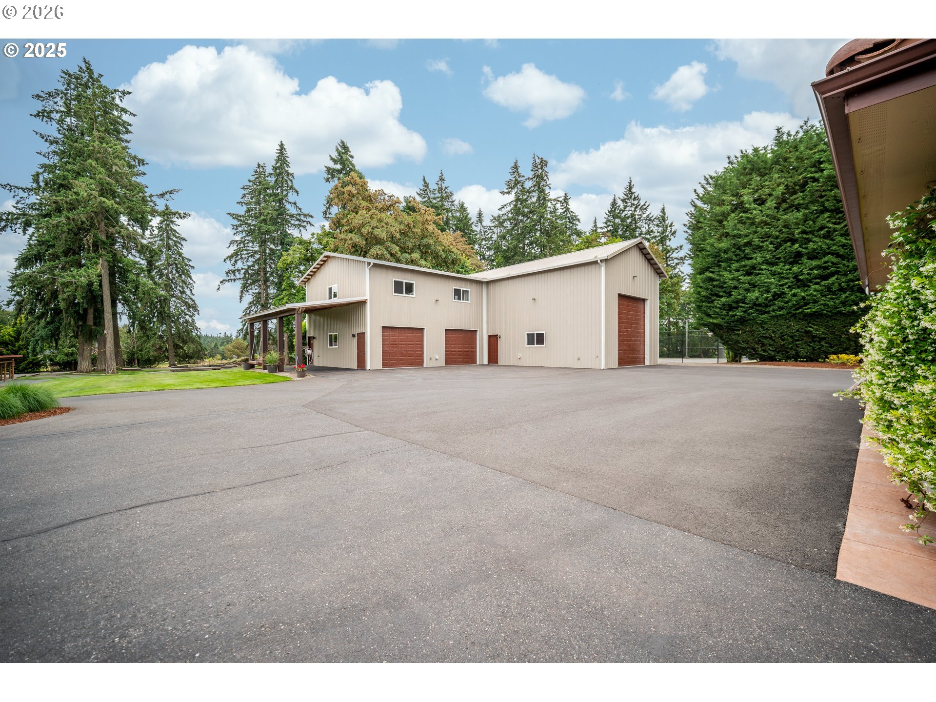 Exceptional gated Mediterranean-inspired estate offering 6,000+ combined multi-generational living on a picturesque 5-acre parcel with Mt. St. Helens views. Main home (4000 sf) features 3 bedrooms + office/flex room, Chef's kitchen with sub zero,Wolf, Bosch & Dacor appliances. Spectacular open and bright vaulted Great-room, Custom woodwork throughout. Luxurious primary suite, fireplace, heated floors in spa like bath, large walk-in closet.Attached (1,100 sf) ADA compliant ADU with full kitchen, bath, bedroom, fireplace.Plus a detached (900 sf) studio apartment. Oversized wraparound covered outdoor living space. Impressive shop building with 60 foot RV bay Full RV hookups, Built-ins and storage. Quality built state of the art barn and arena, Fenced and cross fenced,Enjoy a serene Park-like setting with mature trees, lush landscaping, expansive green lawns, fire-pit, putting green.Resort living yet close to both freeways, Airport, Hospital, Shopping, Restaurants. Rare opportunity for luxury lifestyle and multi-generational living.